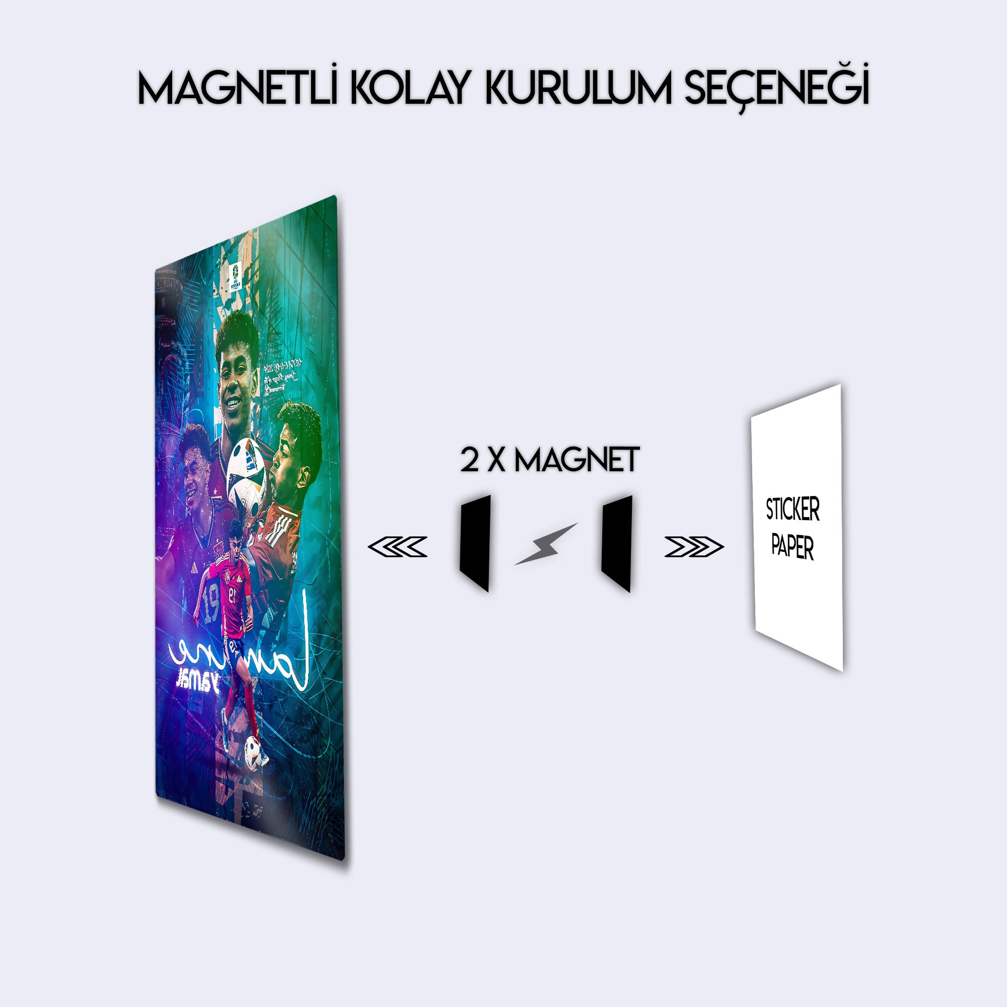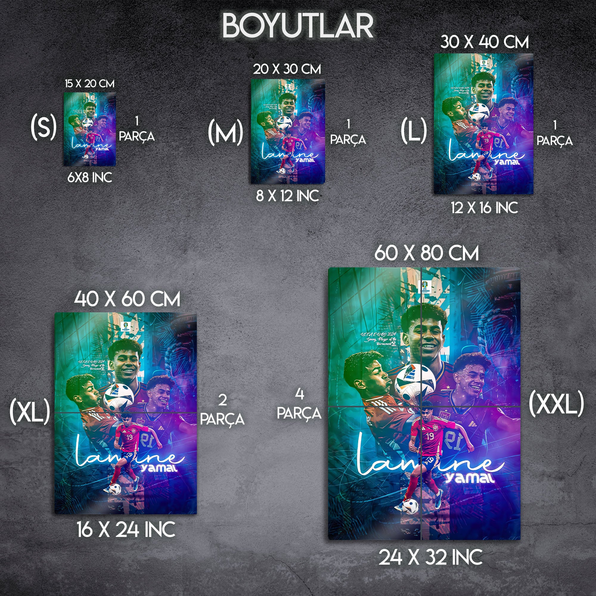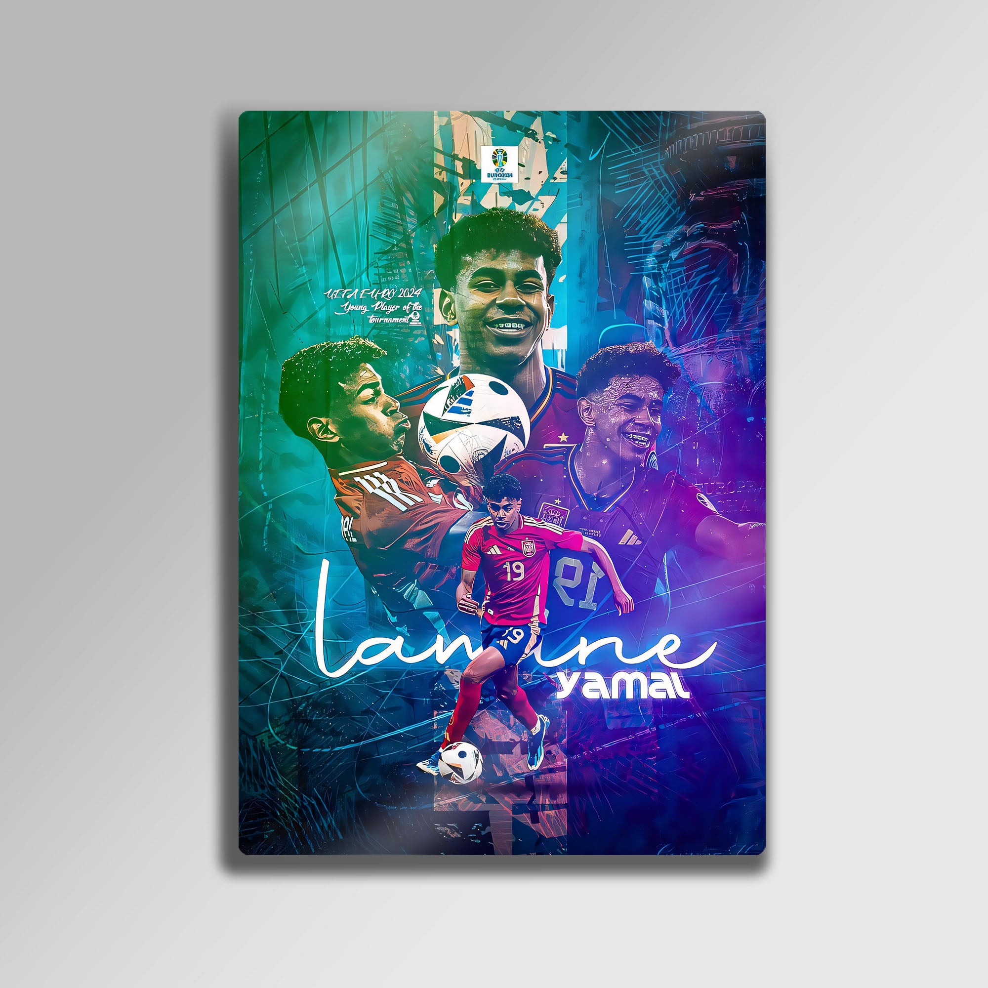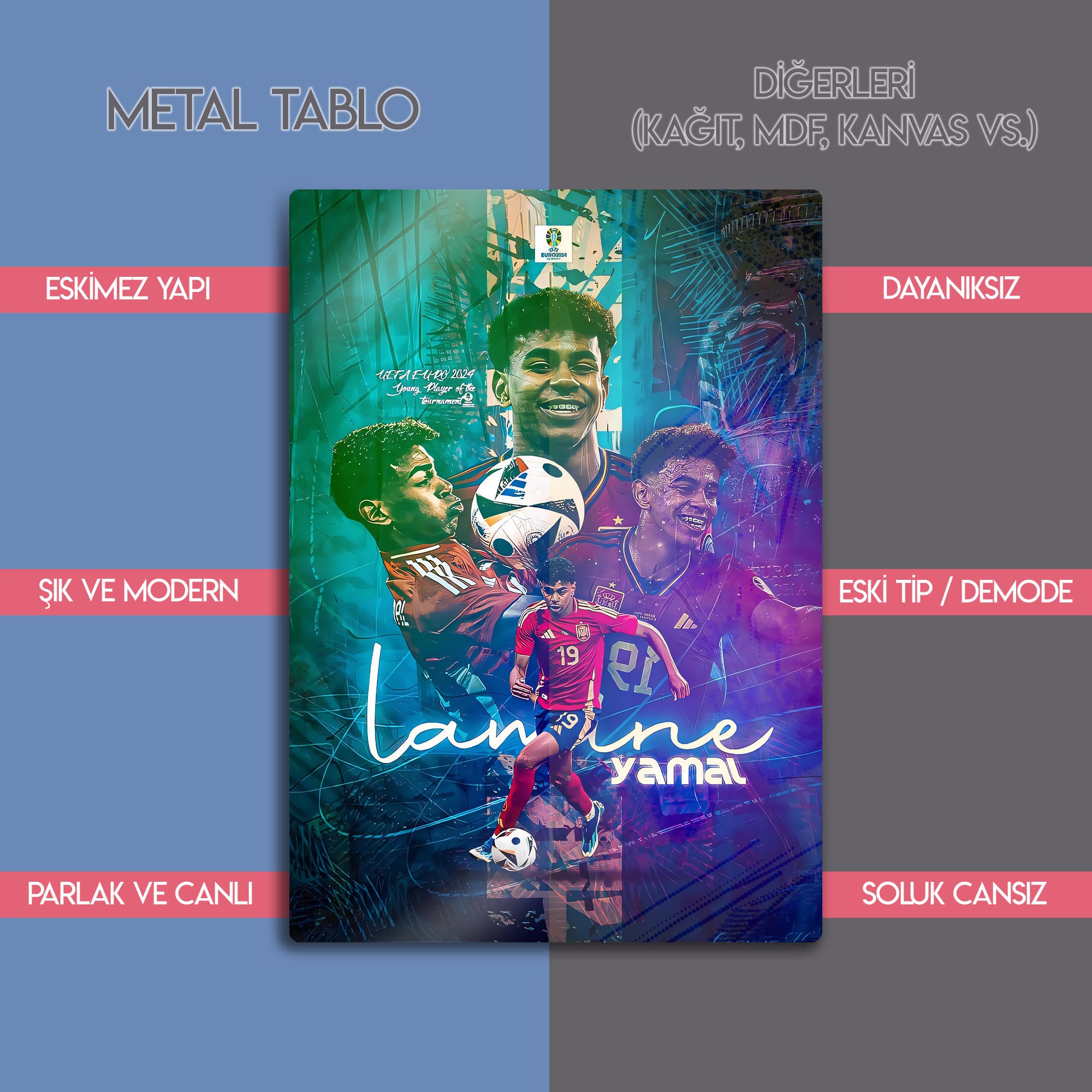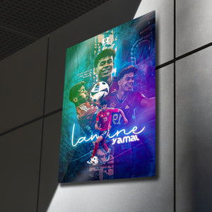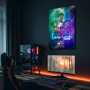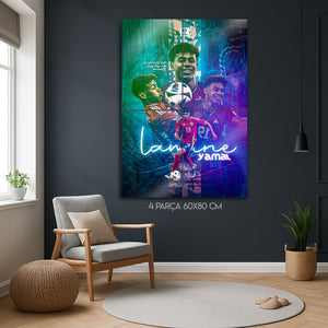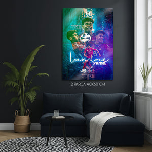 Futbol dünyasının nefesini kesen yeni yıldızı Lamine Yamal'ın enerjisini, yeteneğini ve zafer anlarını duvarlarınıza taşıyın! Bu özel tasarım metal tablo, EURO 2024'ün "Turnuvanın Genç Oyuncusu" ödülünü kazanan Lamine Yamal'ı, İspanya Milli Takımı formasıyla en dinamik anlarını yansıtan modern bir kolajla ölümsüzleştiriyor.