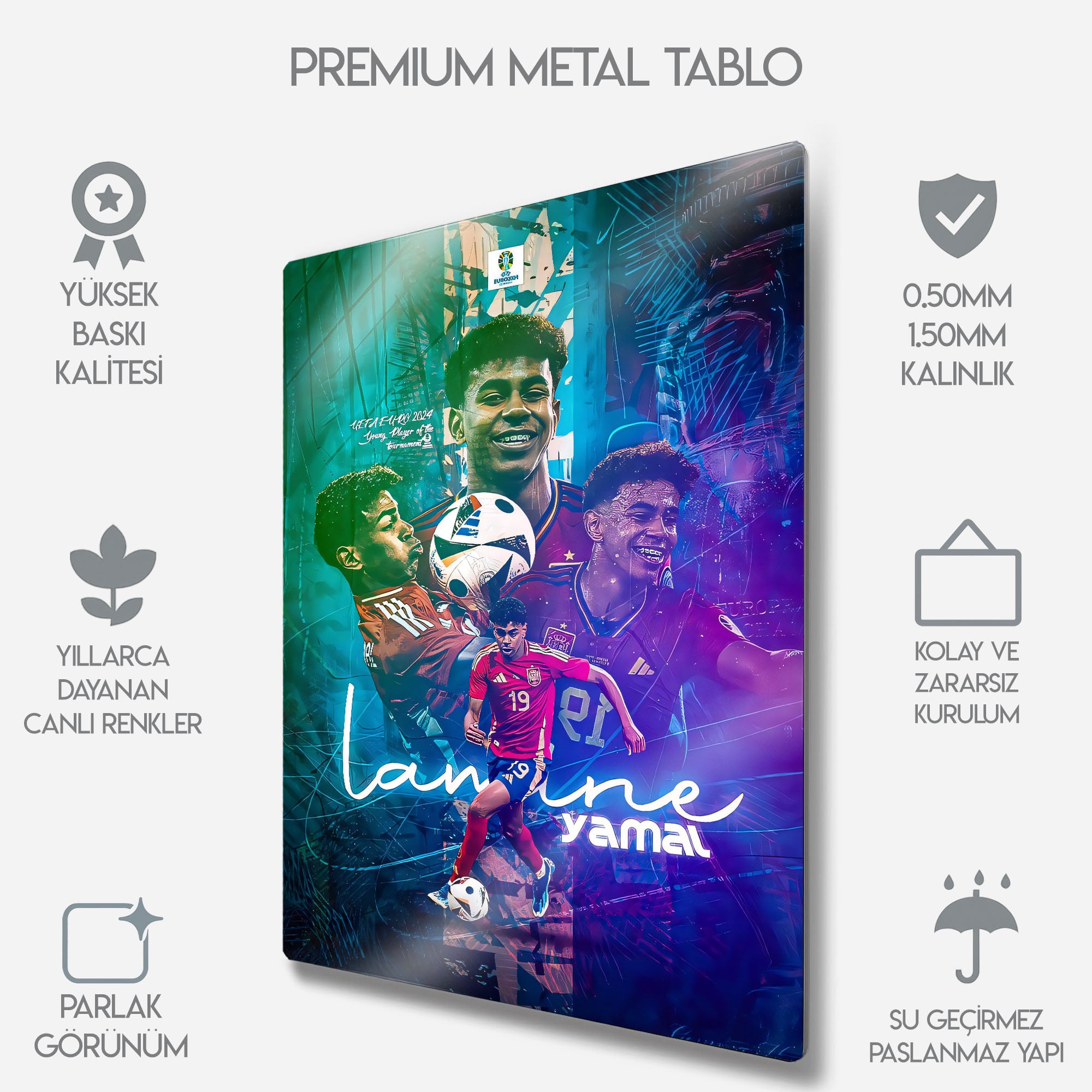 Canlı renkleri, enerjik kompozisyonu ve şık tipografisiyle bu eser, sadece bir futbol posteri değil, aynı zamanda bir süperstarın doğuşuna tanıklık eden bir sanat objesidir. Metalin modern ve parlak yüzeyi, bu göz alıcı tasarımın her bir detayını ve rengini mükemmel bir şekilde öne çıkarır. Genç odaları, spor odaları, "man cave"ler veya modern yaşam alanlarına anında bir dinamizm ve futbol ruhu katacaktır.