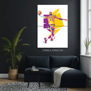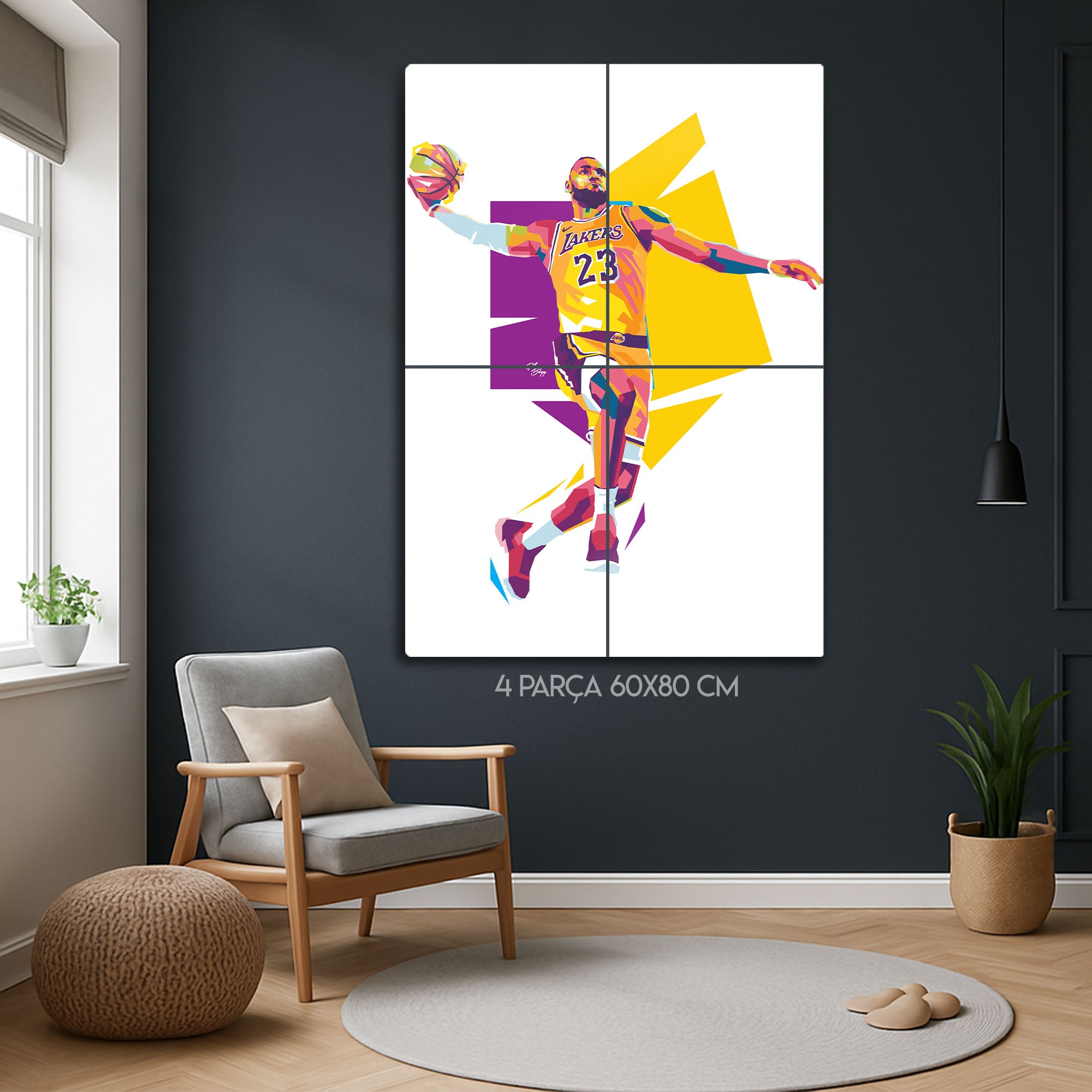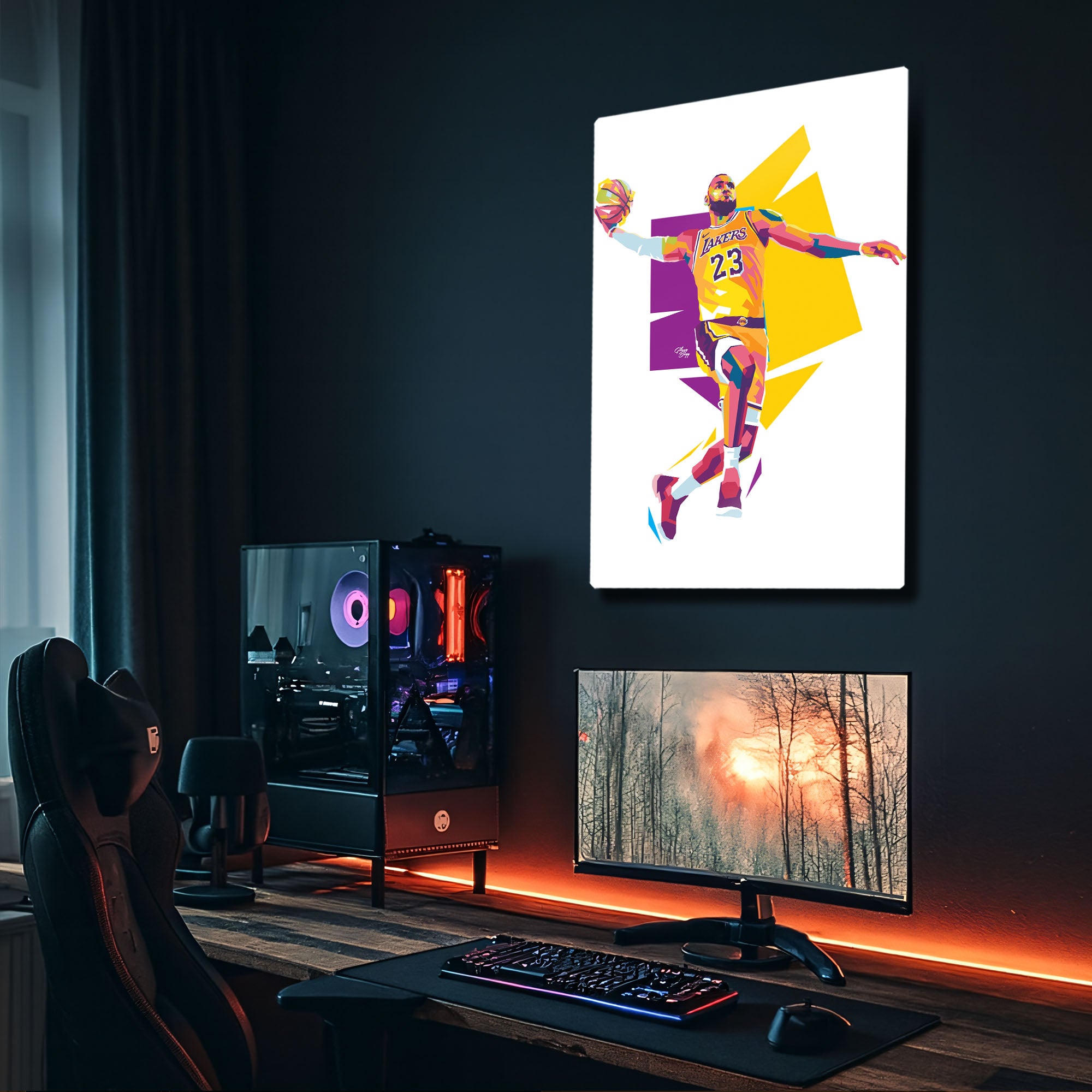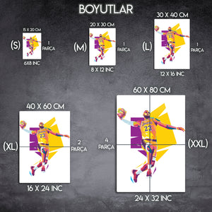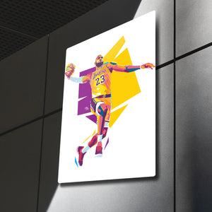 Kral'ın sahadaki gücünü ve atletizmini duvarlarınıza taşıyın! Bu olağanüstü metal tablo, tüm zamanların en büyük basketbolcularından LeBron James'in ikonik smaç anlarından birini, canlı ve dinamik bir pop art (WPAP) stiliyle ölümsüzleştiriyor. Her bir renk bloğu ve keskin geometrik şekil, LeBron'un sahadaki o durdurulamaz enerjisini ve gücünü mükemmel bir şekilde yansıtıyor.