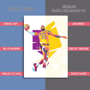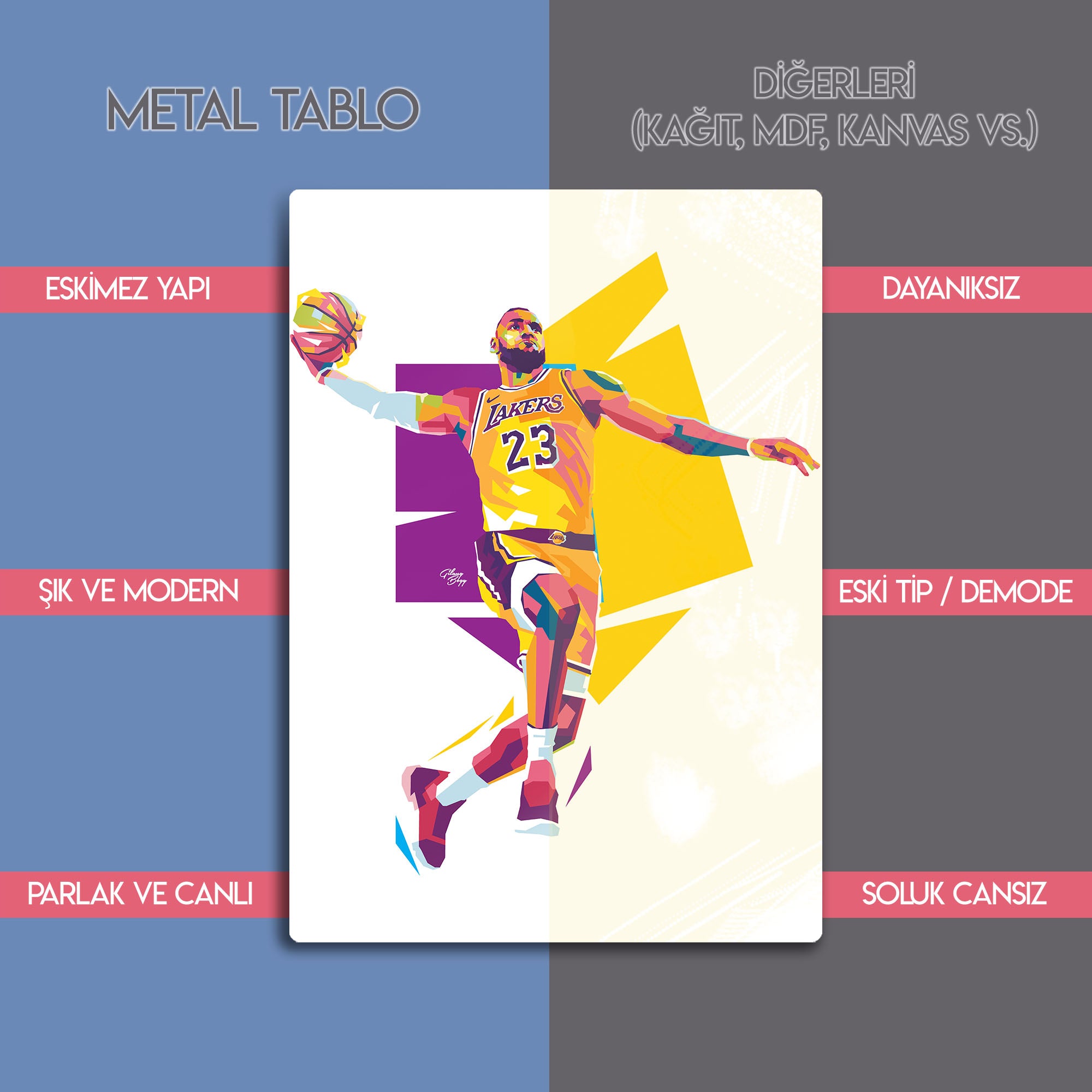Bu eser, sadece bir spor posteri değil, aynı zamanda modern sanatın enerjisini basketbol tutkusuyla birleştiren bir "statement" parçasıdır. Metalin parlak ve pürüzsüz yüzeyi, bu canlı renkleri ve keskin hatları daha da öne çıkarır. Spor odası, "man cave", genç odası veya modern ofisler için tasarlanmış bu tablo, mekanınıza anında bir şampiyonluk ruhu ve sanatsal bir dinamizm katacaktır.