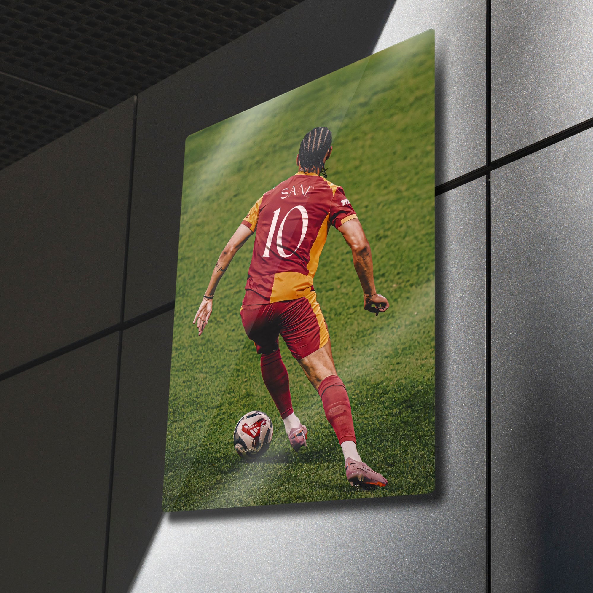 Bu eser, sadece bir futbol posteri değil, aynı zamanda bir umudun, bir hayalin ve bir dünya yıldızının Galatasaray'a olan potansiyel sevgisinin bir ifadesidir. Yüksek kaliteli metal malzeme üzerine basılan bu fotoğraf, o anın her bir detayını, Sané'nin yüzündeki o hırsı ve Parçalı formanın asaletini canlı bir şekilde yansıtır. Spor odanıza, ofisinize, "man cave"inize veya genç odasına anında bir şampiyonluk ruhu ve Galatasaray coşkusu katacaktır.