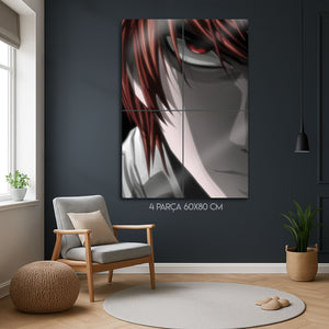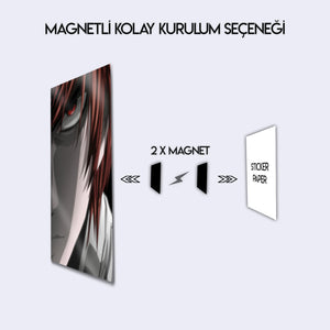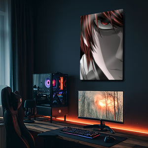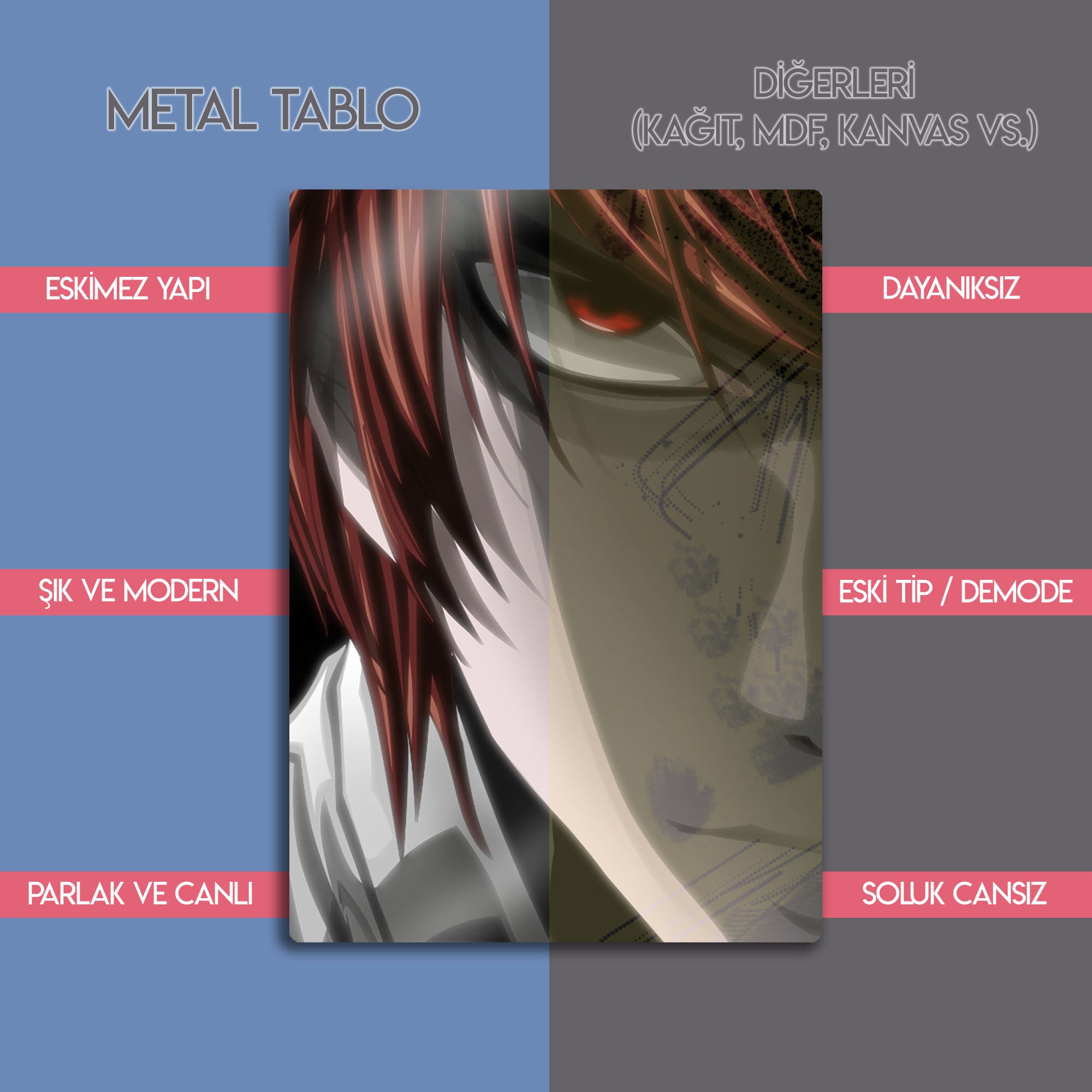 ''Ben, yeni dünyanın tanrısı olacağım!'' Anime tarihinin en dahi ve en karanlık anti-kahramanlarından Light Yagami'nin (Kira) o unutulmaz ve şeytani bakışını duvarlarınıza taşıyın. Bu olağanüstü metal tablo, Light'ın adaleti kendi ellerine aldığı ve karanlık tarafının tamamen ortaya çıktığı o anı, hipnotize edici kırmızı gözleriyle ölümsüzleştiriyor.