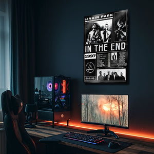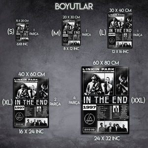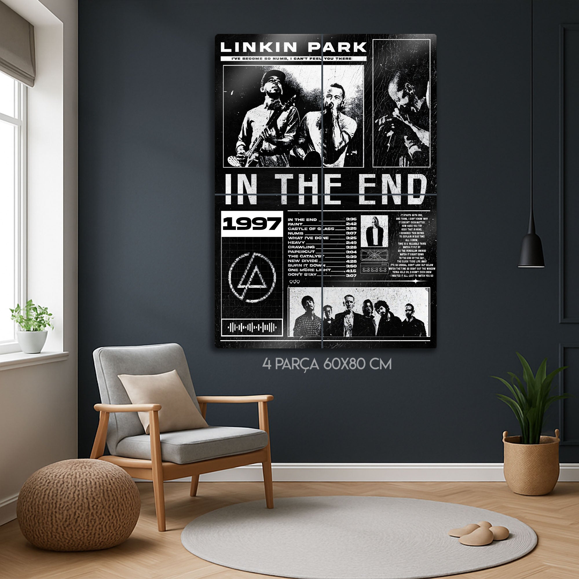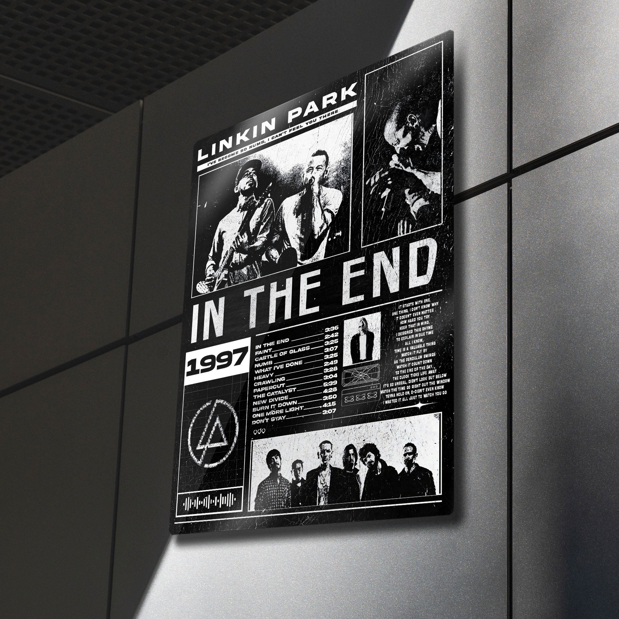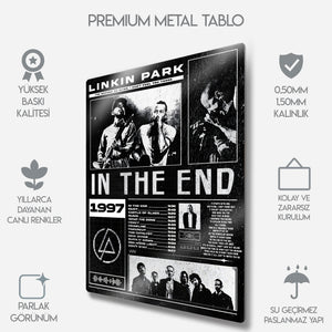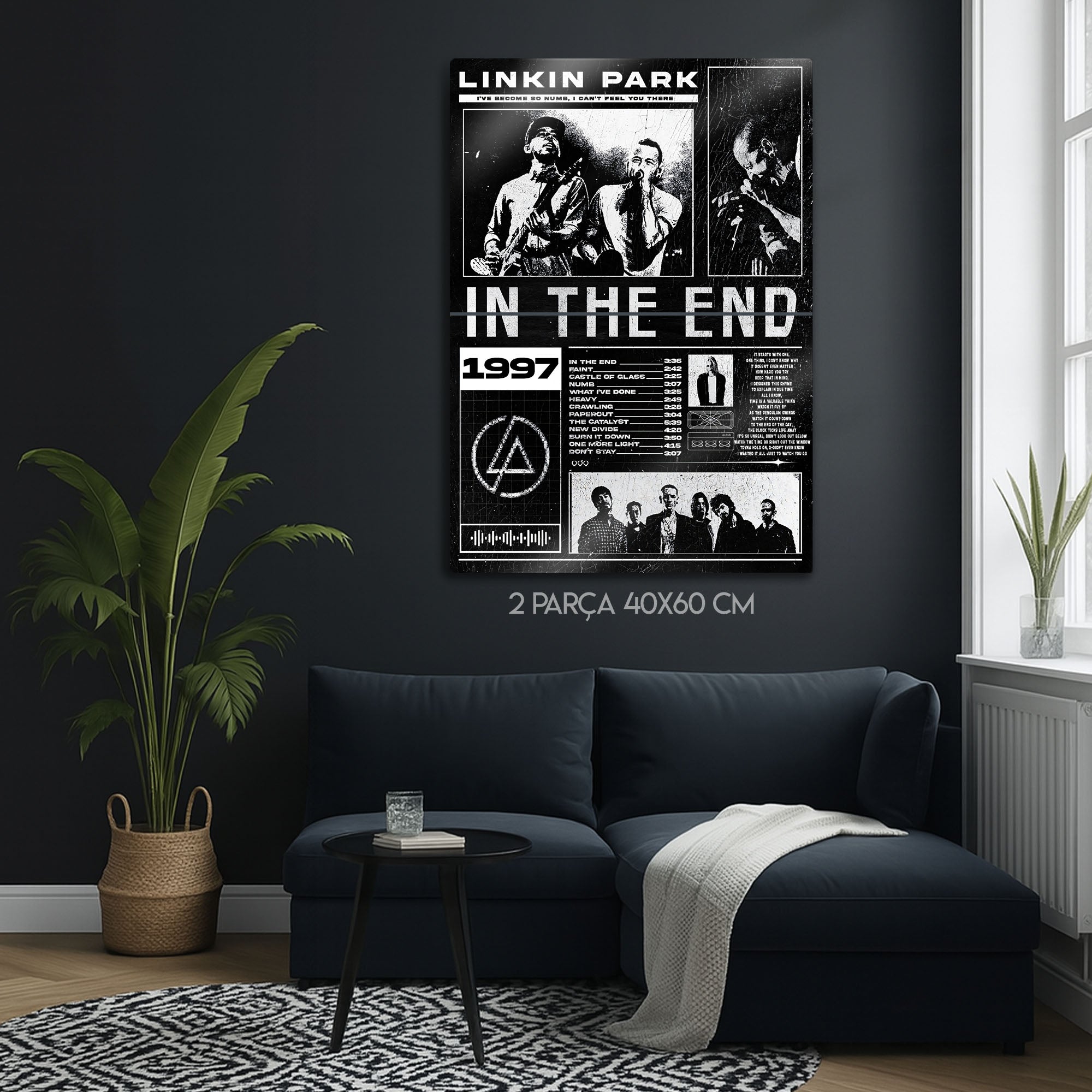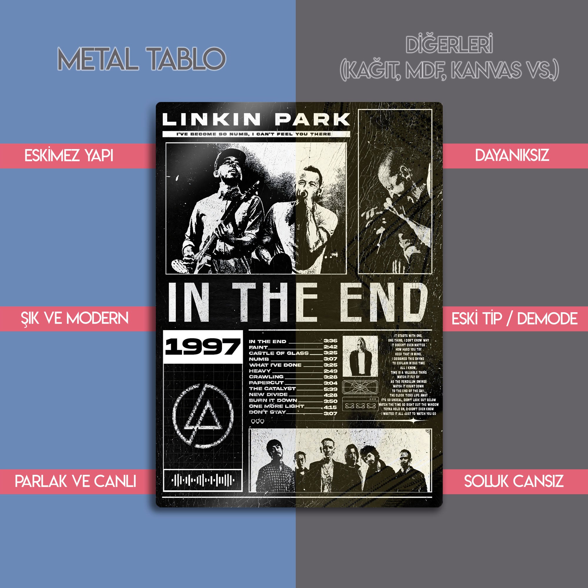 ''In the end, it doesn't even matter...'' Milyonların sesi olan, rock müziğin efsanesi Linkin Park'ın mirasını ve unutulmaz anılarını duvarlarınıza taşıyın. Bu özel tasarım metal tablo, grubun en ikonik şarkılarından "In The End"in sözleri, en sevilen parçalarından oluşan bir diskografi ve grubun, özellikle de unutulmaz vokalist Chester Bennington'ın duygu dolu anlarıyla dolu bir kolaj sunuyor.