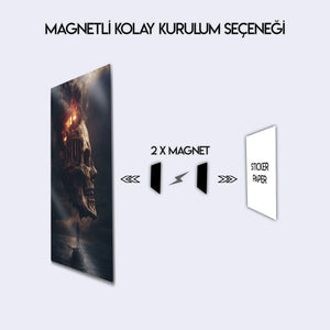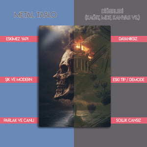 Bu eser, sadece bir dekorasyon objesi değil, aynı zamanda tarih, felsefe ve insanlığın kırılganlığı üzerine güçlü bir sanat eseridir. Yüksek çözünürlüklü baskı kalitesi, ateşin ve dumanın her detayını, kuru kafanın dokusunu ve okyanusun karanlığını metalin modern yüzeyinde sinematik bir etkiyle canlandırıyor. Bu tablo, salon, kütüphane, ofis veya "man cave" gibi mekanlara anında bir derinlik, karakter ve entelektüel bir atmosfer katacaktır.