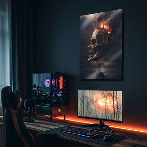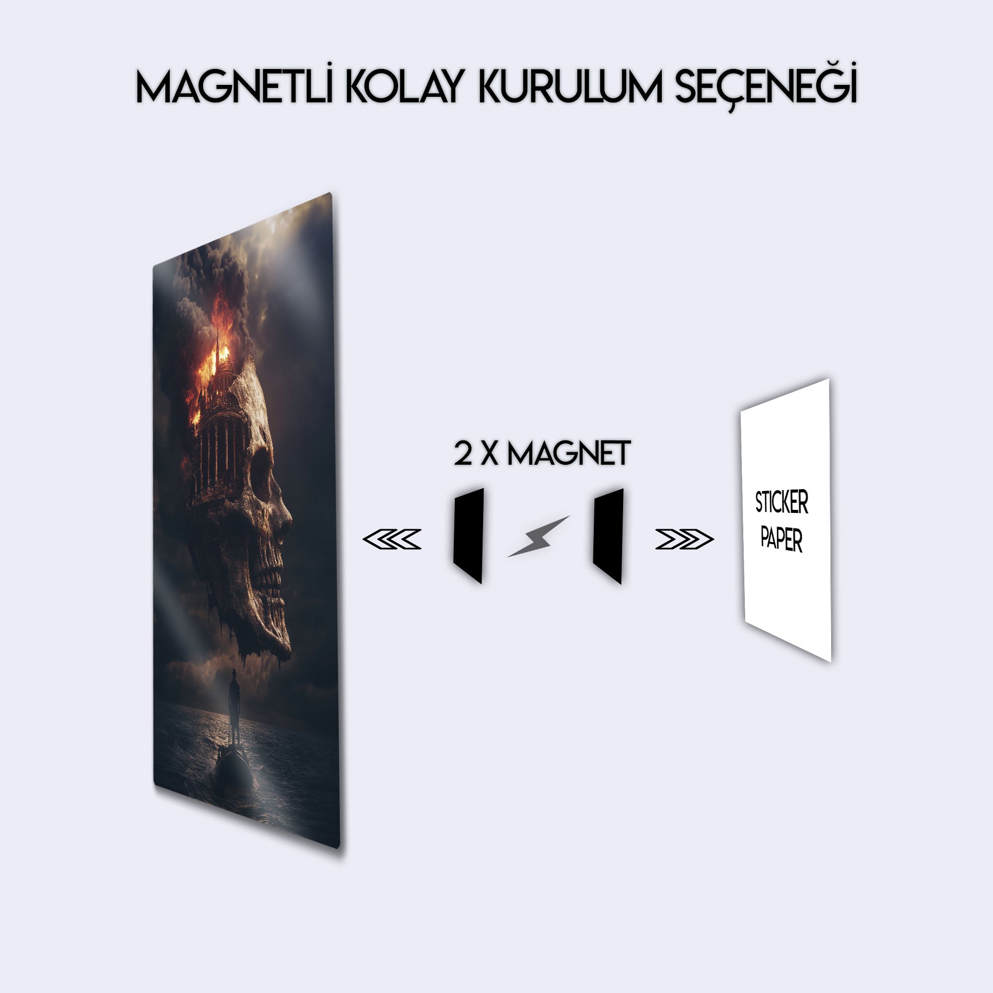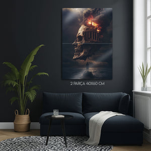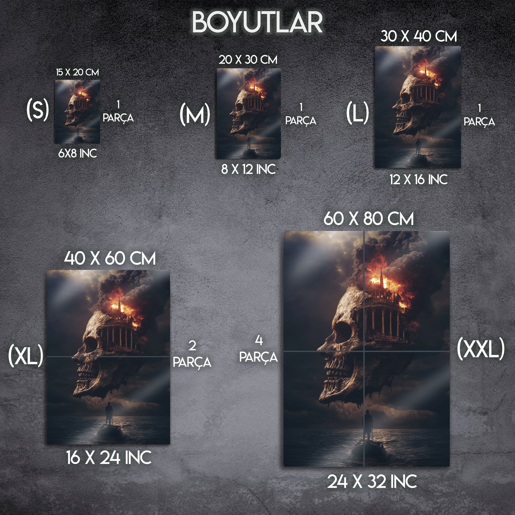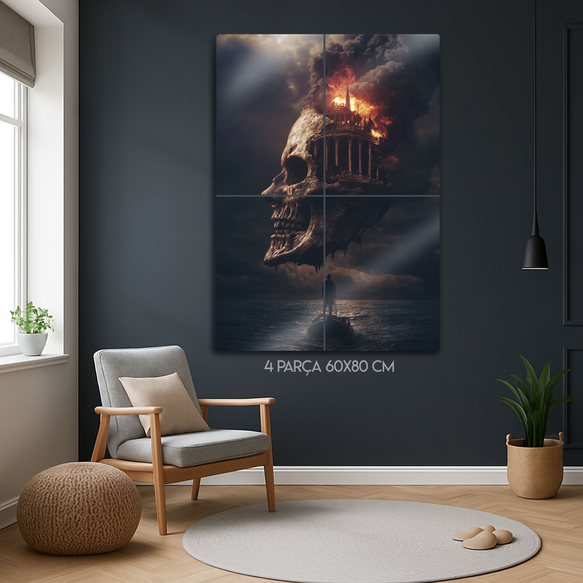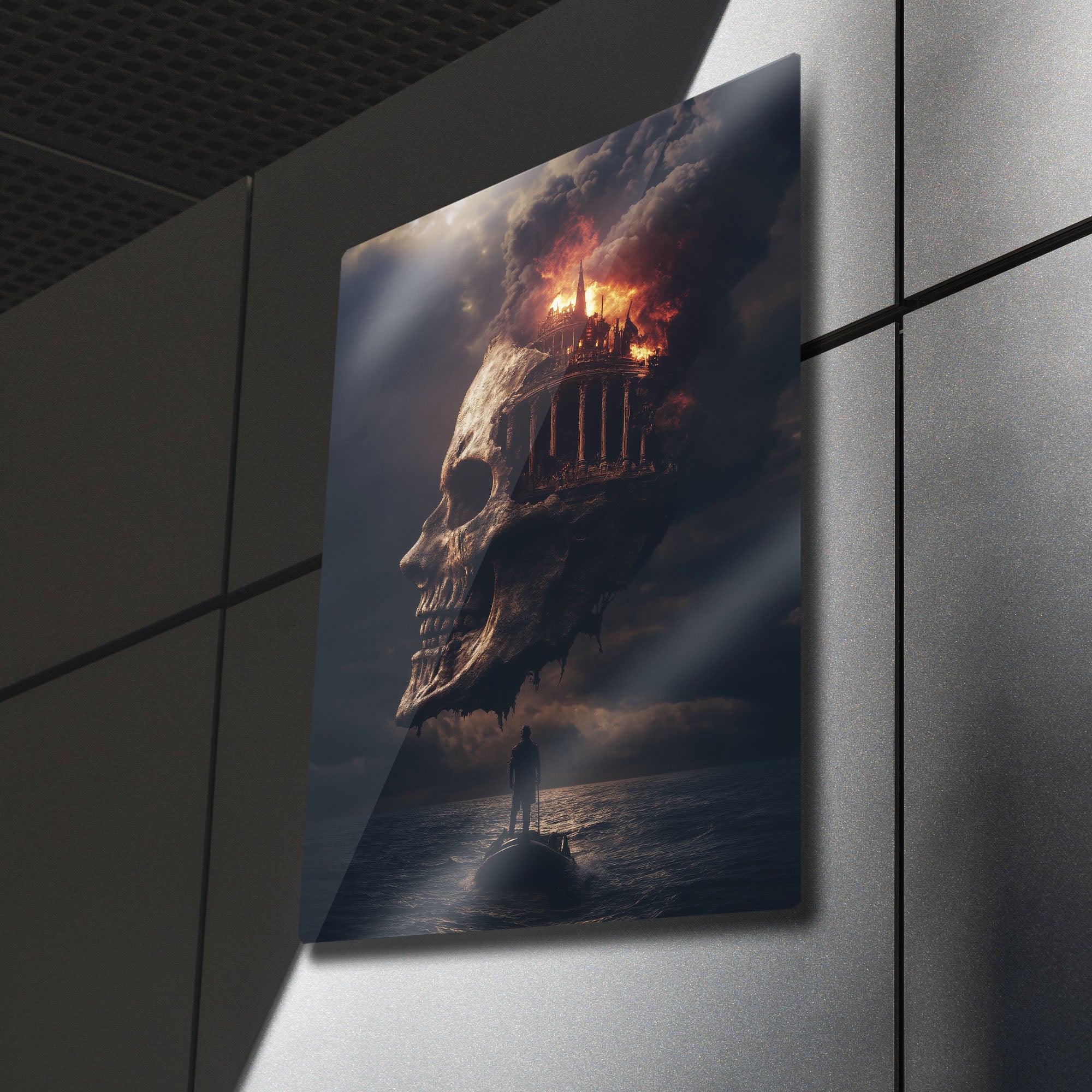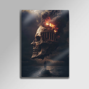 Medeniyetlerin yükselişi ve çöküşü üzerine epik bir alegori... Bu olağanüstü metal tablo, bir zamanların görkemli bir antik kentinin yanan kalıntılarını barındıran devasa bir kuru kafa adasını, sonsuz bir okyanusun ortasında tasvir ediyor. Yalnız bir kaşifin bu anıtsal yıkıma tanıklık ettiği bu sürreal sahne, her bakışta sizi derin düşüncelere sevk edecek.