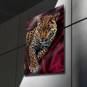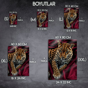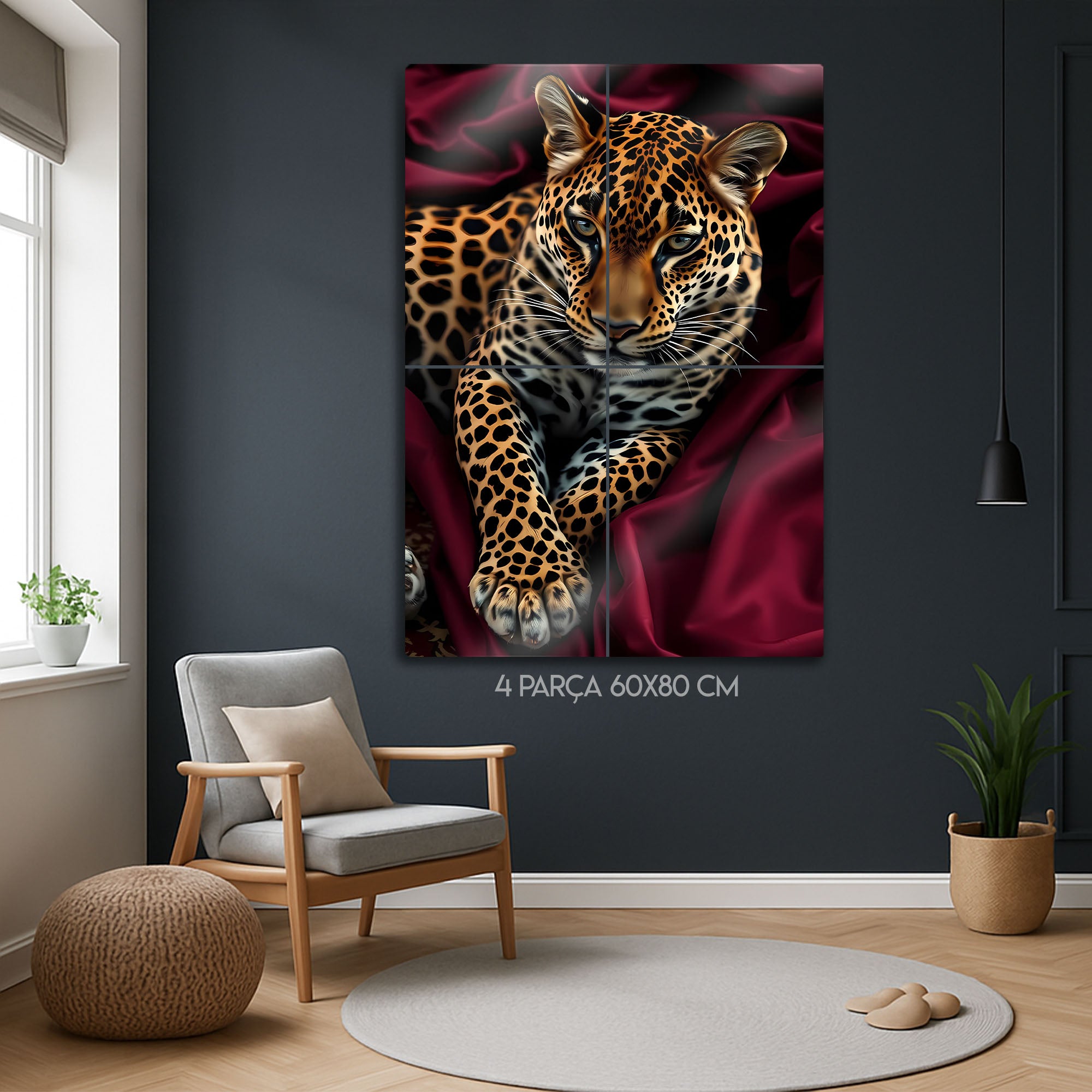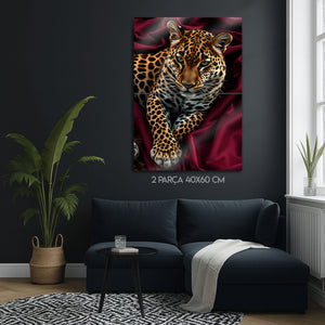 Leoparın egzotik desenleri ile bordo kırmızısı kumaşın zengin dokusu arasındaki bu çarpıcı kontrast, esere dramatik ve sofistike bir hava katıyor. Bu cesur sanat eseri, salon, yatak odası, ofis, giyinme odası veya lüks bir bekleme alanı gibi mekanlarda anında bir odak noktası yaratarak tüm dikkatleri üzerine çekecektir.