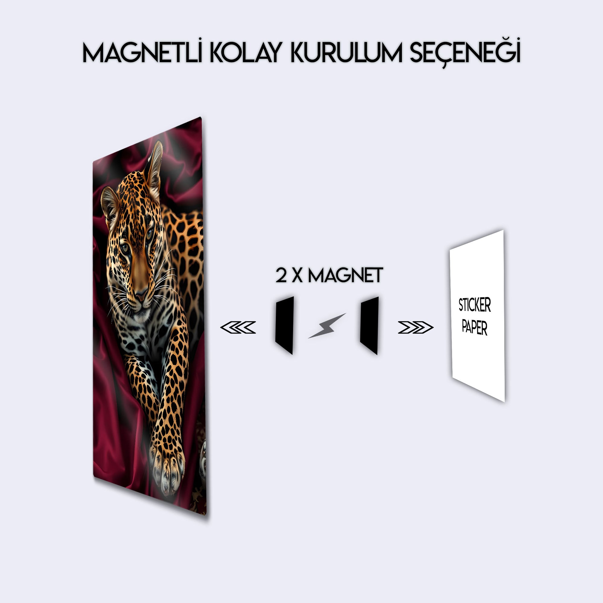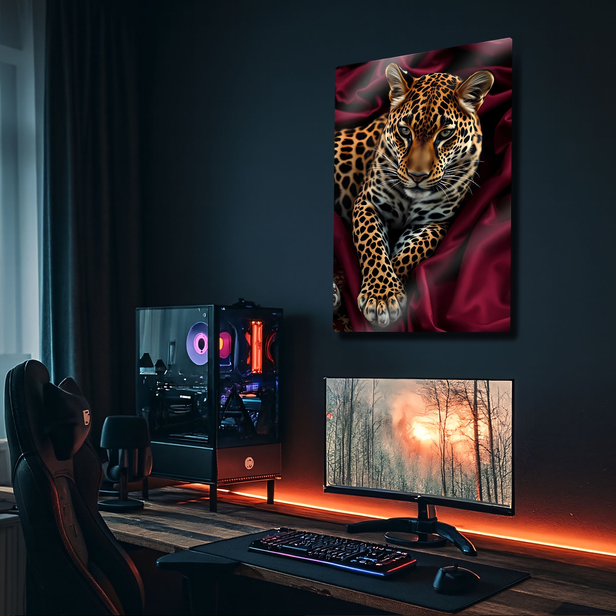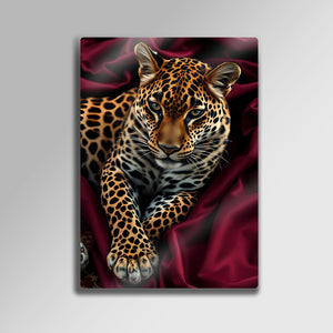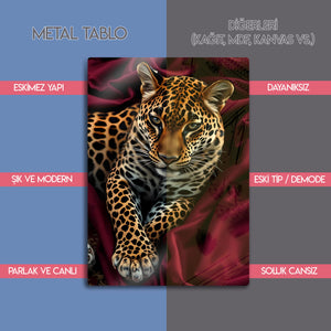 Vahşi doğanın gücü, lüksün zarafetiyle buluşuyor. Bu hiper-realist metal tablo, kadifemsi kırmızı bir kumaş üzerinde dinlenen bir leoparın büyüleyici ve asil portresini sunuyor. Her bir benek, her bir tüy ve gözlerindeki o hipnotize edici bakış, metal yüzey üzerinde inanılmaz bir detay ve canlılıkla hayat buluyor.