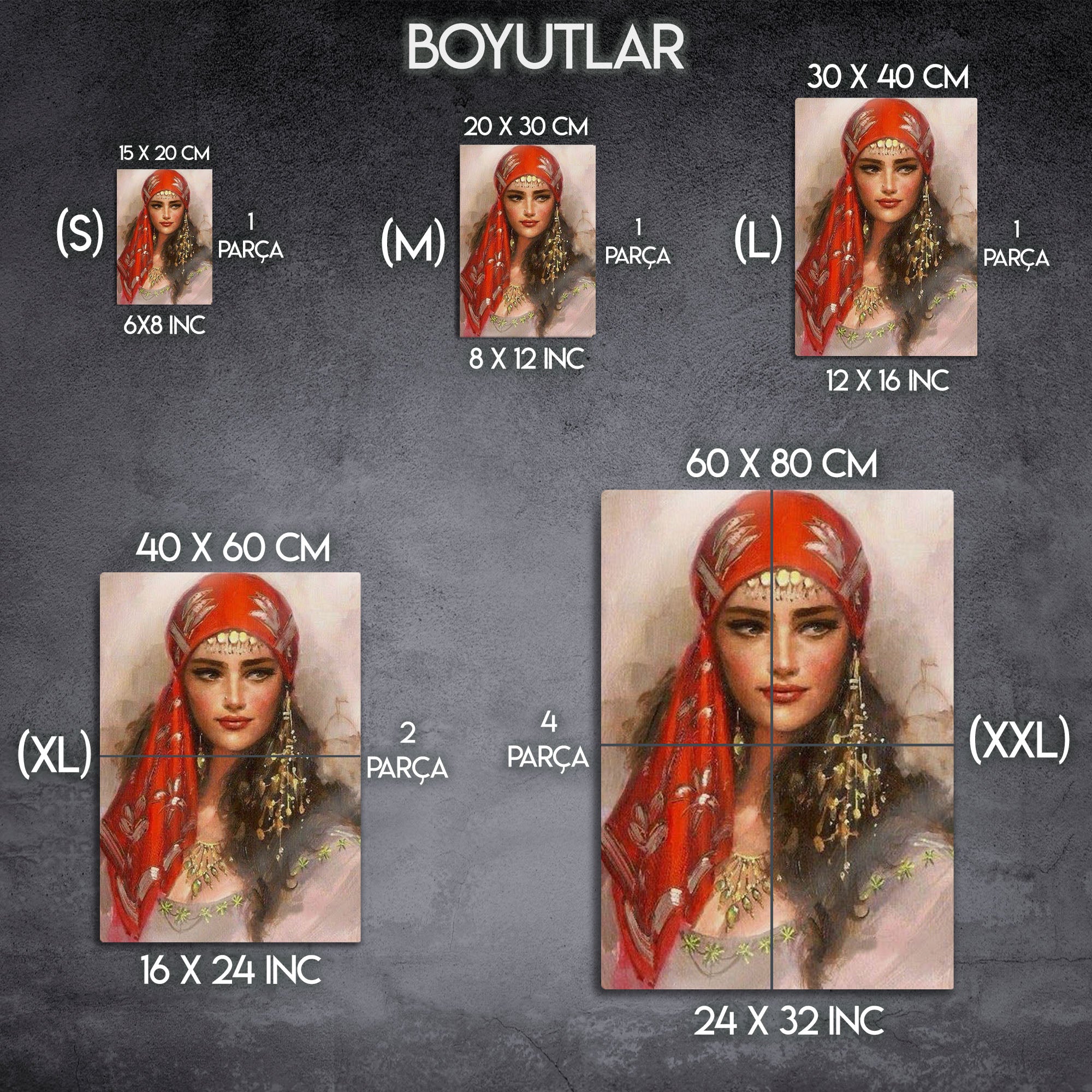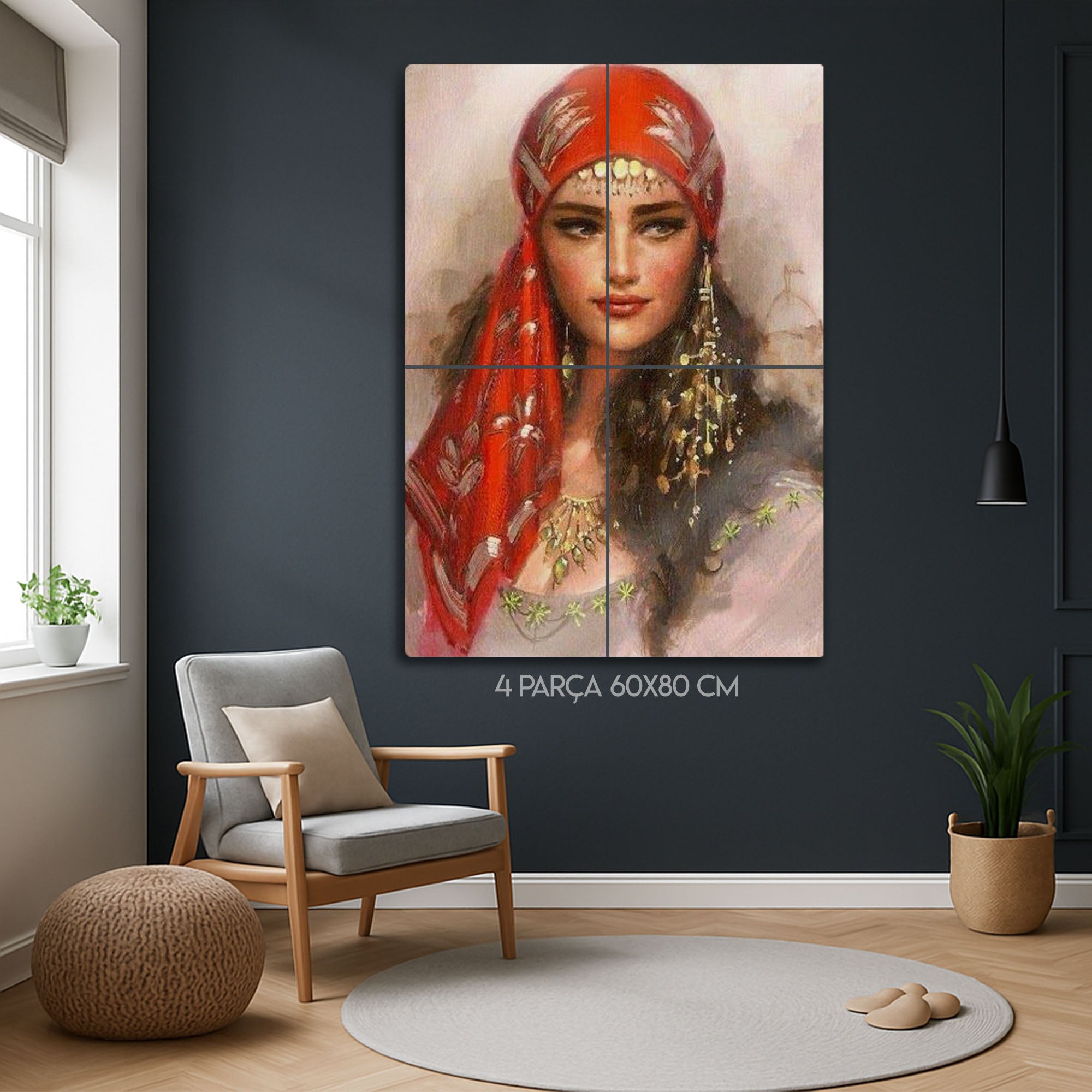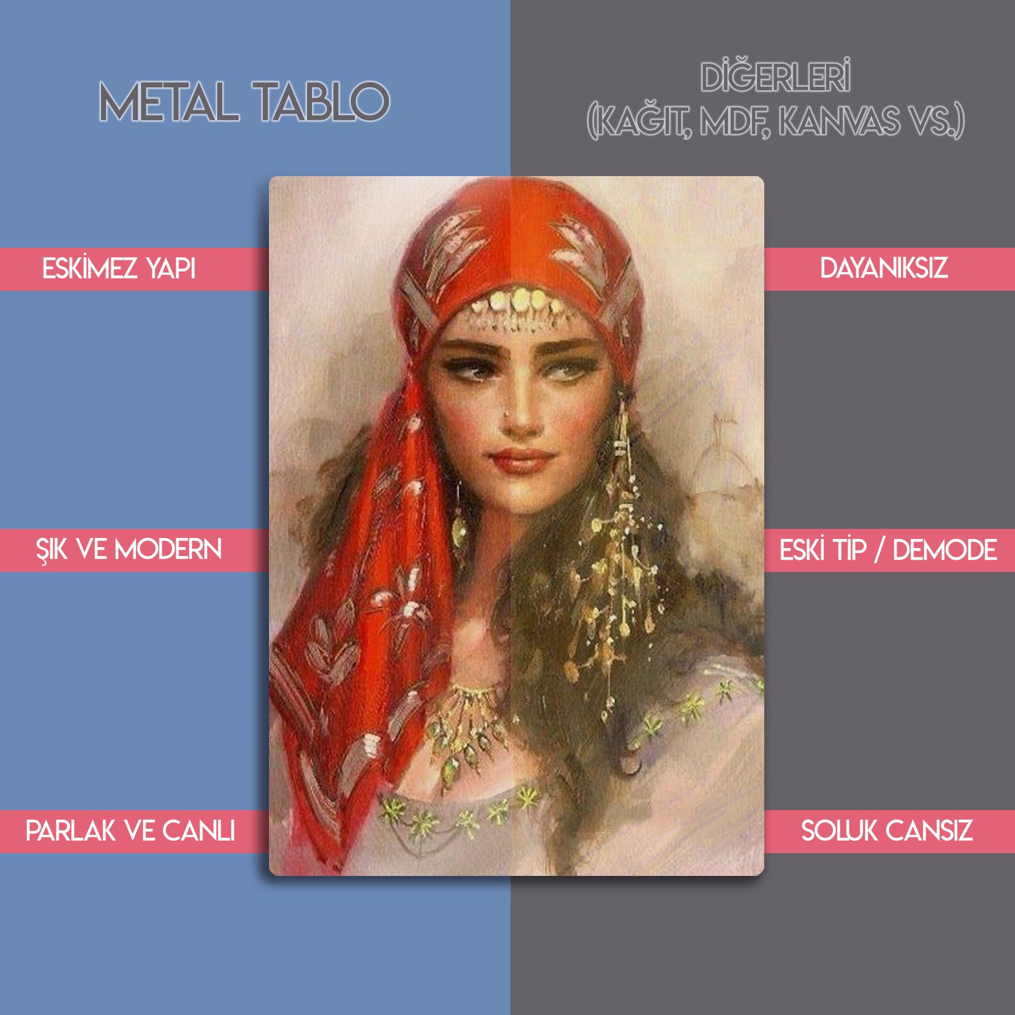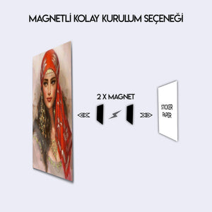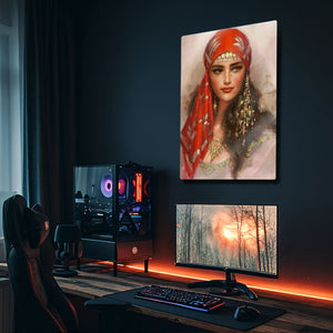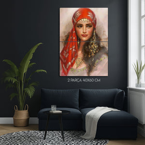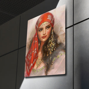 Duvarlarınıza sanatsal bir dokunuş katmak ve mekanınıza derinlik kazandırmak için tasarlanan bu özel metal tablo, gizemli ve etkileyici bir kadın portresini evinize taşıyor. Canlı kırmızı tonlarındaki eşarbı, geleneksel takıları ve büyüleyici bakışlarıyla bu eser, modern ve etnik tasarımın mükemmel bir birleşimini sunar.