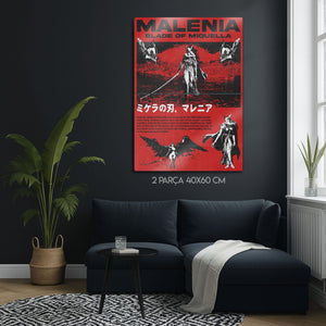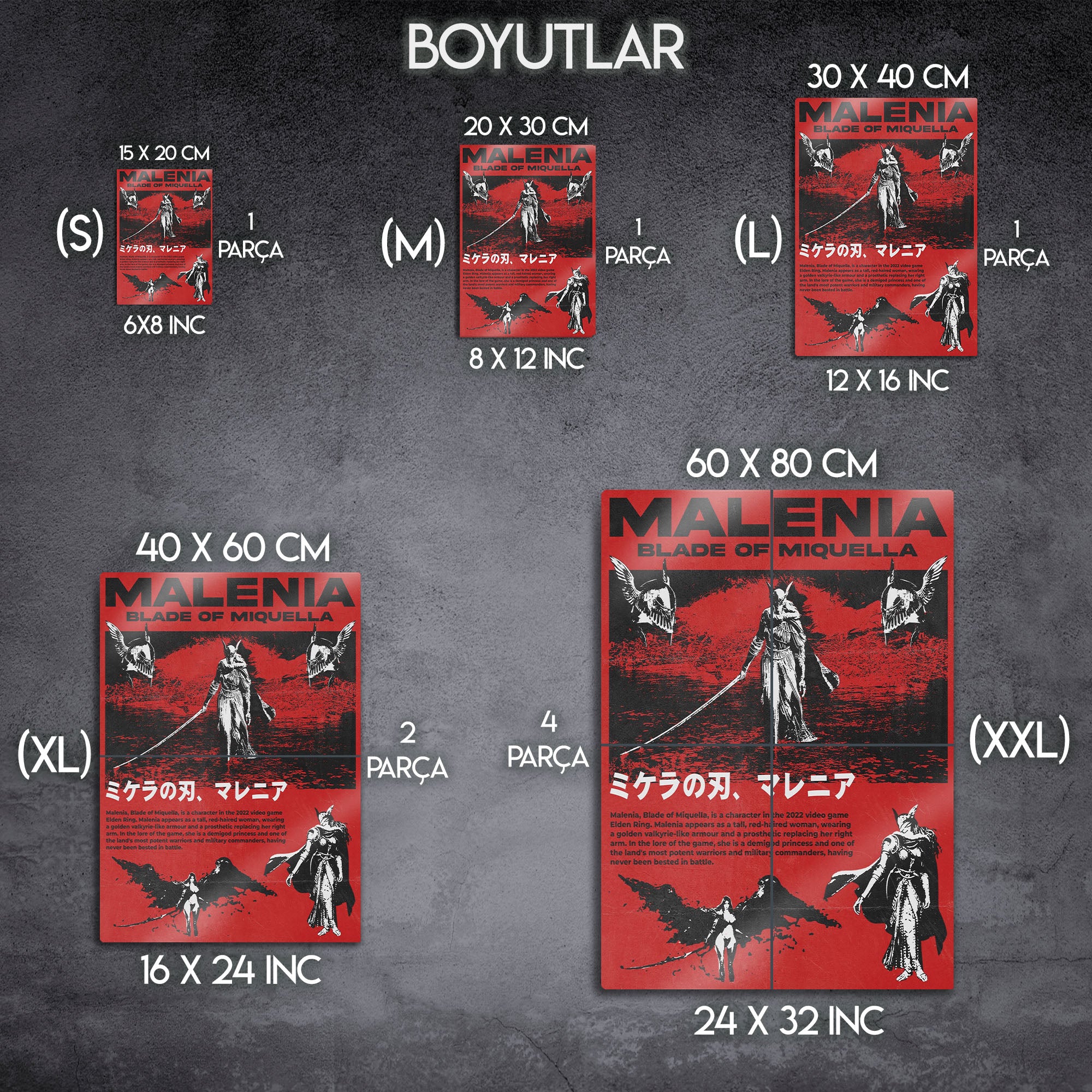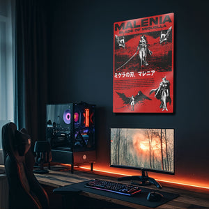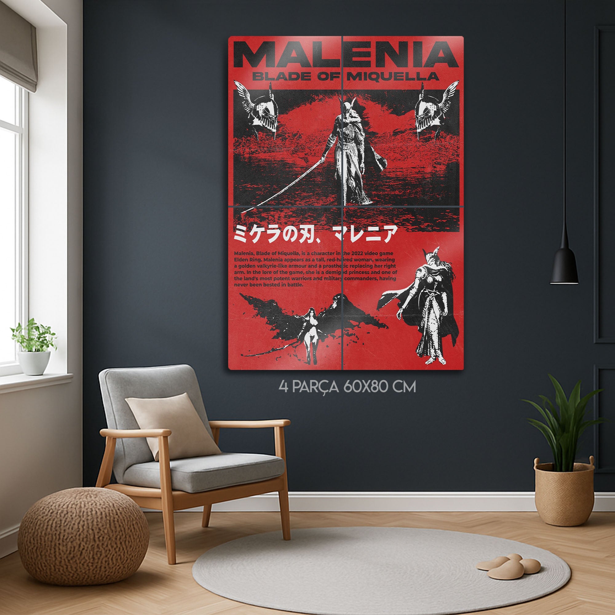 Kırmızı, siyah ve beyazın güçlü kontrastı ve eskitme (grunge) dokusu, Malenia'nın trajik hikayesine ve sarsılmaz gücüne mükemmel bir şekilde uyum sağlıyor. Bu eser, sadece bir oyun posteri değil, aynı zamanda kararlılığın, gücün ve onurun bir sanat manifestosudur. Oyun odaları, "man cave"ler, stüdyolar veya modern yaşam alanlarına anında asi ve sanatsal bir ruh katacaktır.