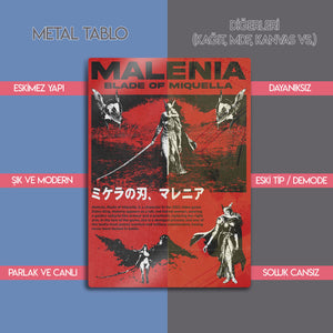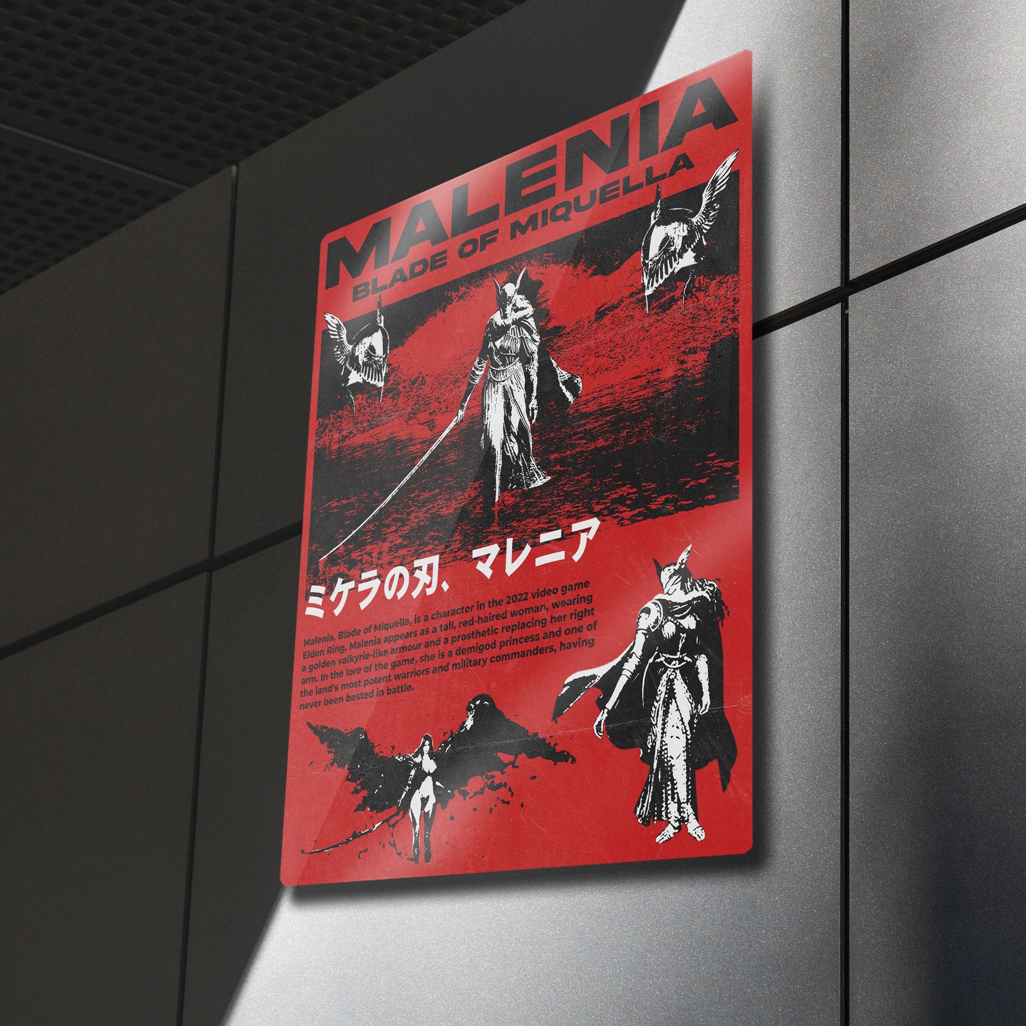 'I am Malenia, Blade of Miquella... and I have never known defeat.'' ("Ben Miquella'nın Kılıcı, Malenia... ve hiç yenilgi yüzü görmedim.") Oyun dünyasının en unutulmaz ve en zorlu savaşçılarından birinin efsanesini duvarlarınıza taşıyın. Bu eşsiz metal tablo, Elden Ring'in ikonik boss'u Malenia'yı, retro Japon posterlerini ve punk rock estetiğini andıran cesur bir tasarımla sunuyor.
