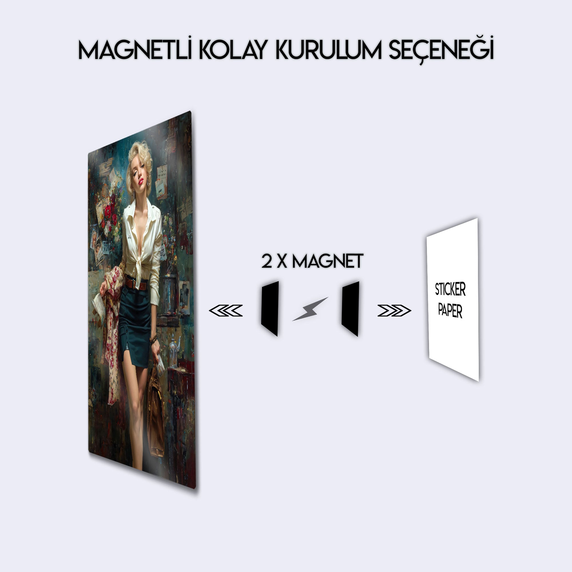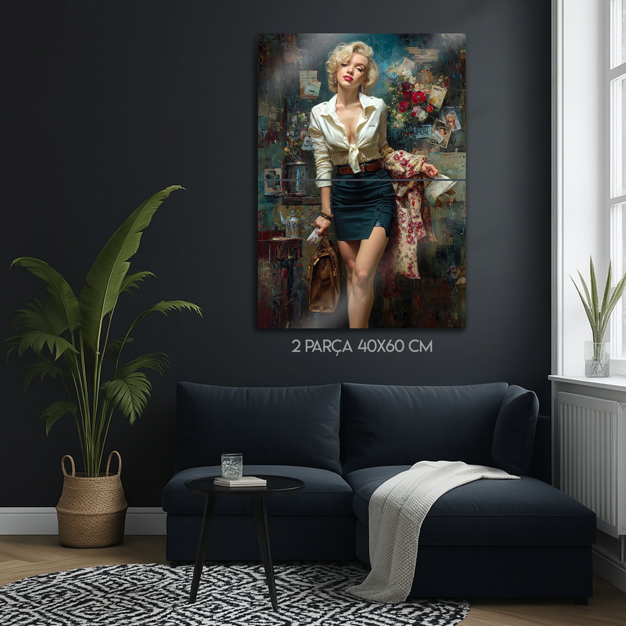 Sanatçının atölyesini andıran bohem ve sanatsal bir arka planın önünde, şık ve kendinden emin bir duruş sergileyen Marilyn, bu eserde hem bir moda ikonu hem de bir sanat ilhamı olarak parlıyor. Bu tablo, sadece bir portre değil, aynı zamanda klasik Hollywood ihtişamının ve zamansız stilin bir kutlamasıdır. Salon, yatak odası, giyinme odası, stüdyo veya ofis gibi mekanlara anında sofistike, sanatsal ve entelektüel bir atmosfer katacaktır.