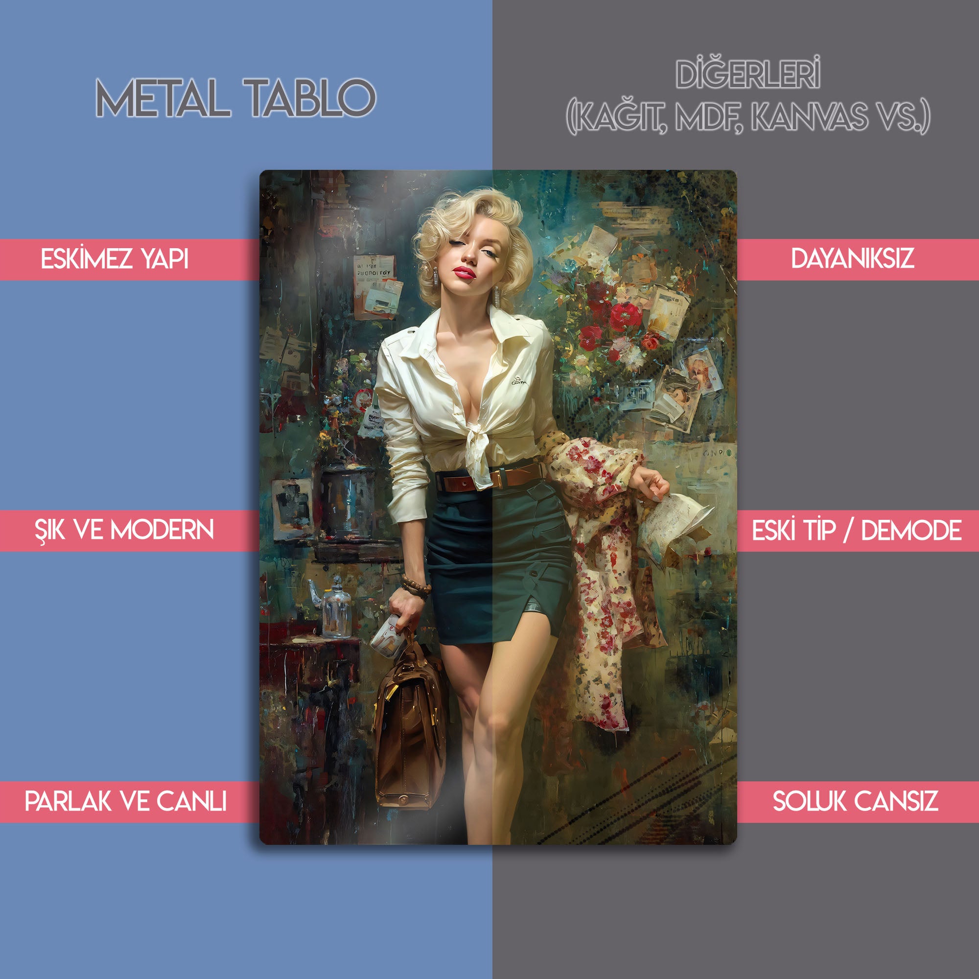 Hollywood'un ebedi yıldızı Marilyn Monroe'nun zamansız zarafetini ve stilini, modern bir sanat yorumuyla duvarlarınıza taşıyın! Bu olağanüstü metal tablo, Marilyn'in ikonik güzelliğini, klasik bir yağlı boya portresini andıran zengin ve dokulu bir dijital sanat tekniğiyle yeniden canlandırıyor.