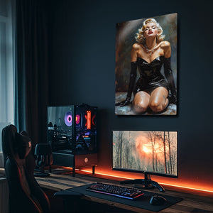 Yağlı boya tekniğini andıran bu dijital sanat eseri, ışık ve gölge oyunlarıyla Marilyn'in her bir kıvrımını ve o unutulmaz ifadesini vurguluyor. Bu tablo, sadece bir portre değil, aynı zamanda feminen gücün, özgüvenin ve Hollywood ihtişamının bir simgesidir. Salon, yatak odası, giyinme odası, stüdyo veya modern bir bar için tasarlanmış bu eser, mekanınıza anında sofistike, gizemli ve cüretkar bir atmosfer katacaktır.