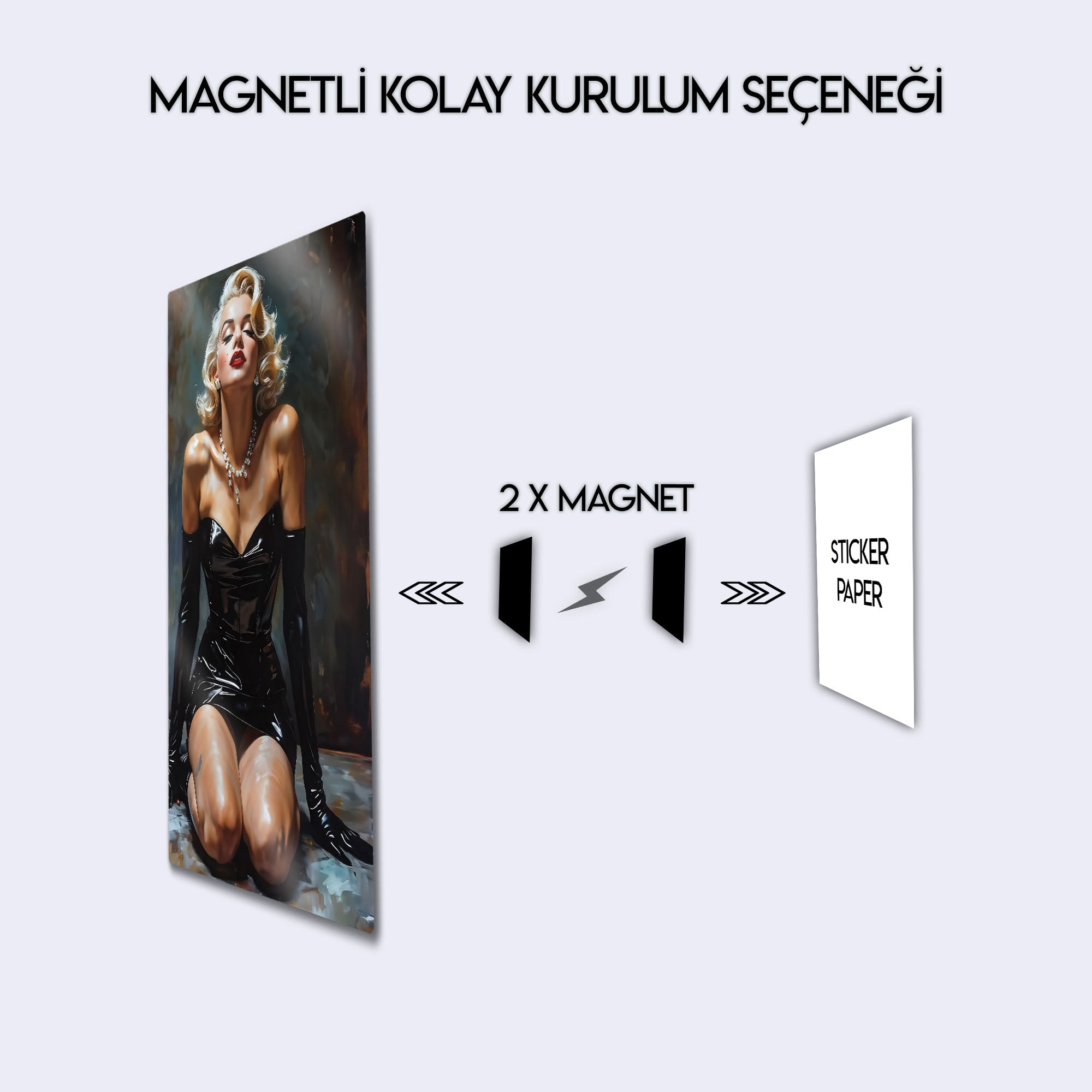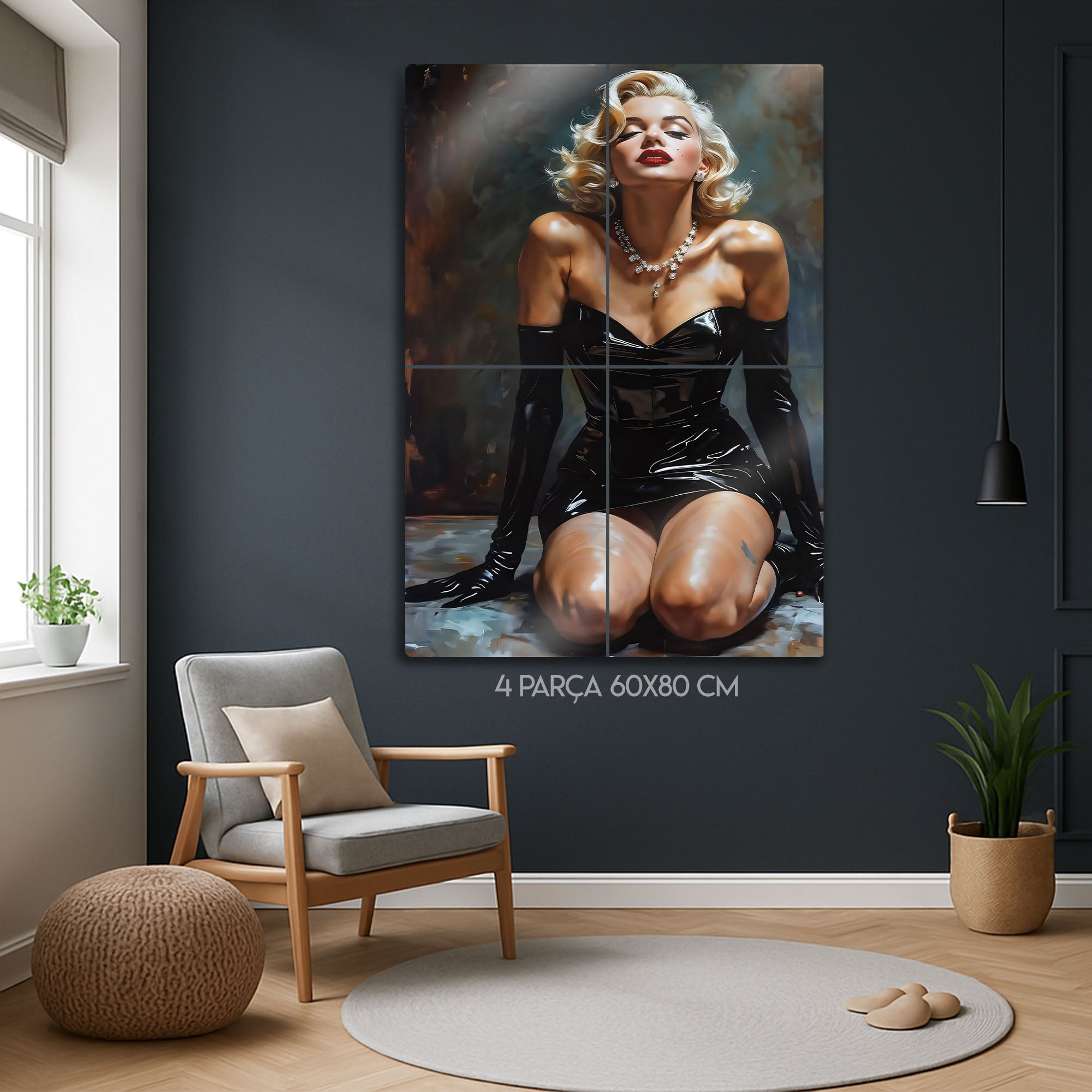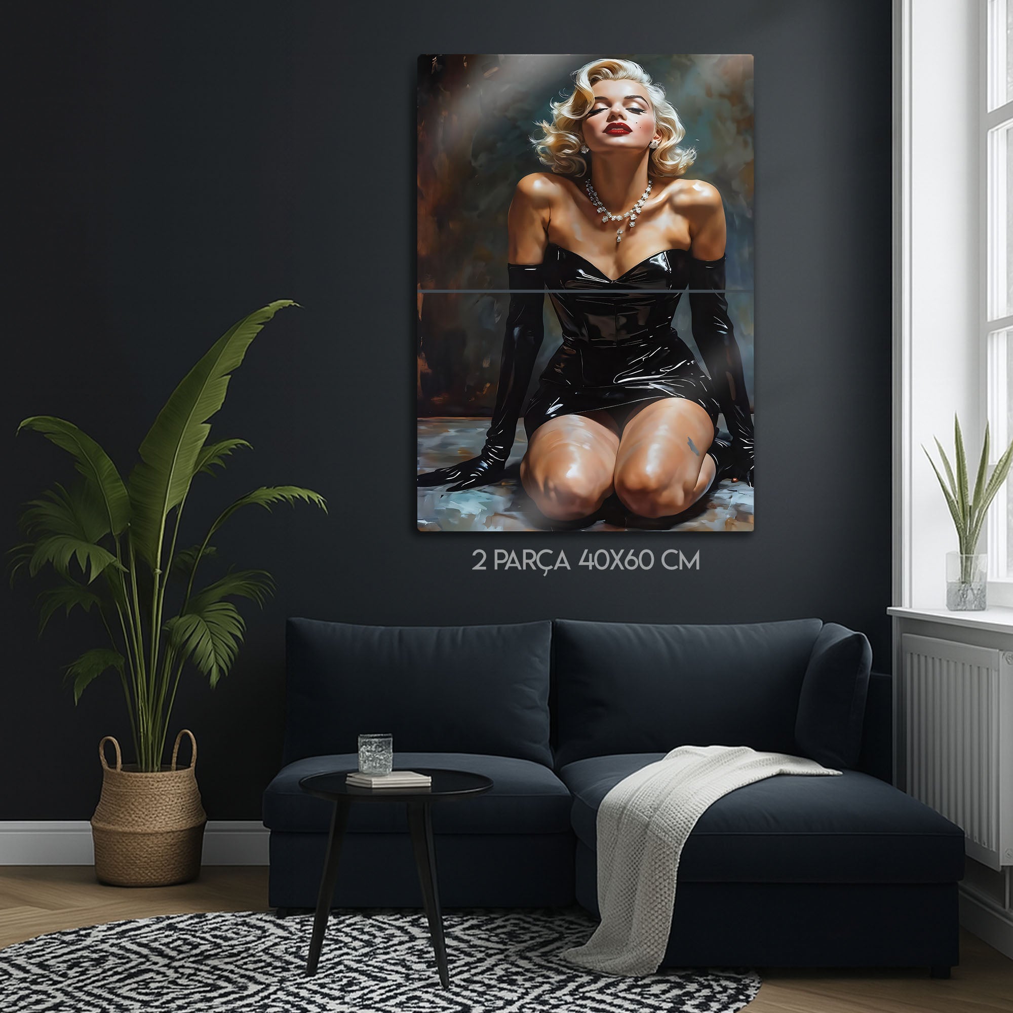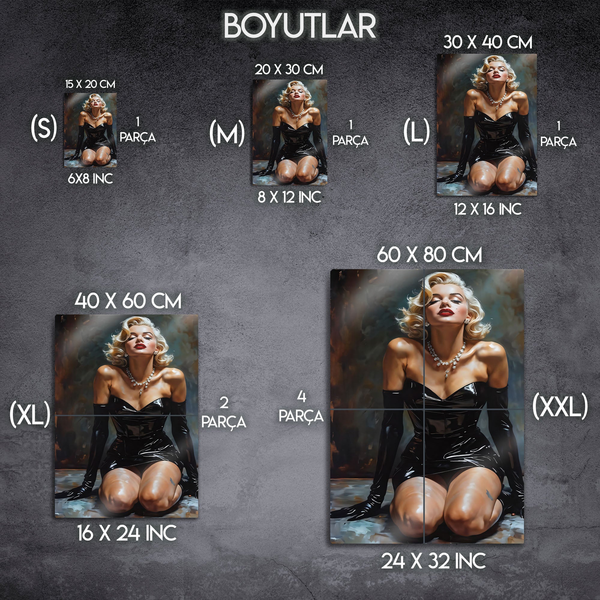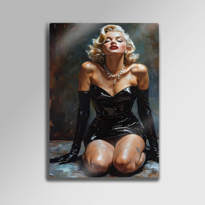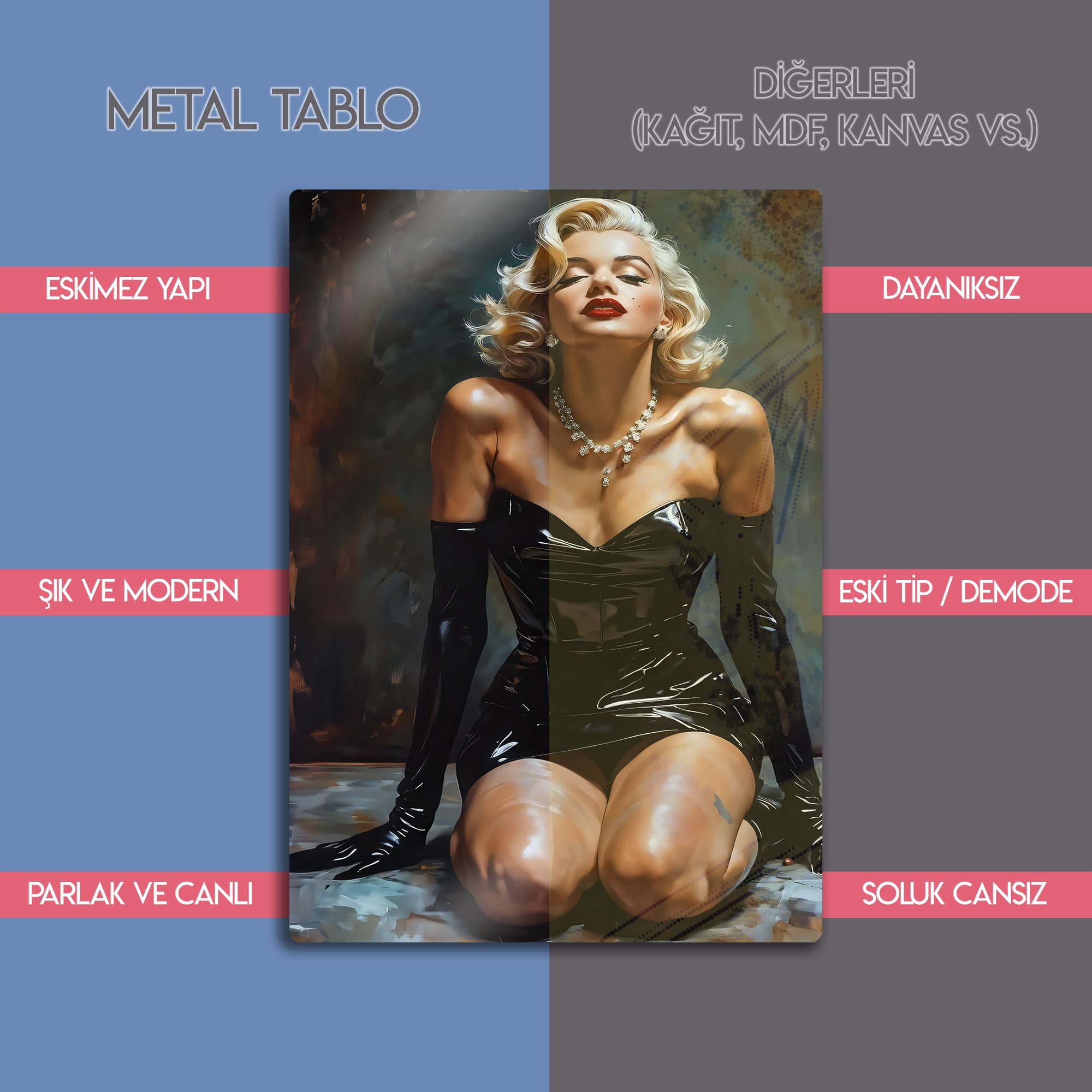 Hollywood'un ebedi yıldızı Marilyn Monroe'nun zamansız cazibesini ve cüretkar ruhunu, modern bir sanat yorumuyla duvarlarınıza taşıyın! Bu olağanüstü metal tablo, Marilyn'in ikonik güzelliğini, parlak siyah lateks bir elbise ve eldivenlerle birleştirerek, hem klasik hem de kışkırtıcı bir "femme fatale" portresi sunuyor.