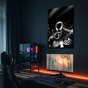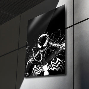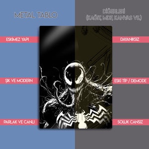 ''We... are Venom!'' ("Biz... Venom'uz!") Marvel evreninin en ikonik ve en tehlikeli simbiyotunun o ham ve dizginlenemez gücünü duvarlarınıza taşıyın. Bu olağanüstü metal tablo, Venom'un o korkutucu ve bir o kadar da karizmatik portresini, keskin dişleri, uzun dili ve karanlık aurasıyla, nefes kesici bir hiper-realizmle yakalıyor.
