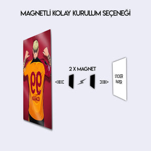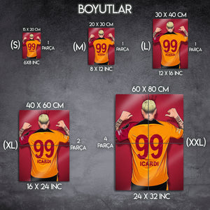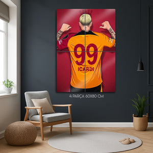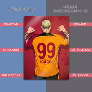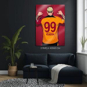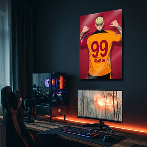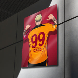 Galatasaray'ın gol makinesi Mauro Icardi'nin ikonik 99 numaralı forması, şimdi modern ve sanatsal bir yorumla duvarlarınızı süslemeye geliyor. Bu özel çizim metal tablo, Icardi'nin karakteristik duruşunu, sarı saçlarını ve dövmelerini vektörel bir tasarımla birleştirerek eşsiz bir görsel şölen sunuyor. Kırmızı-sarı renklere gönül vermiş her taraftarın koleksiyonunda olması gereken bir parça!