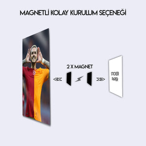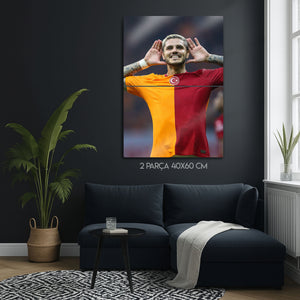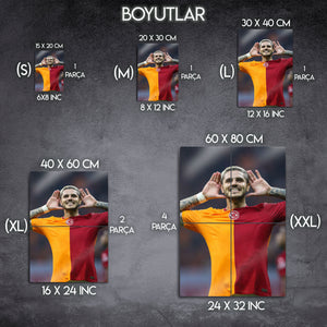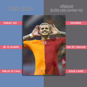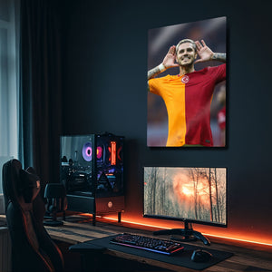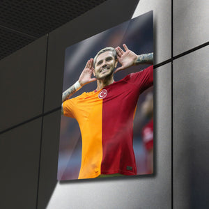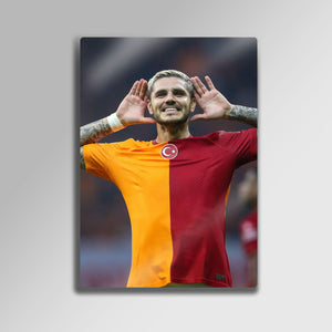 Galatasaray taraftarının gönlünde taht kuran, tribünlerin "Aşkın Olayım" şarkısıyla inlediği anların kahramanı Mauro Icardi, şimdi bu özel tasarım metal tablo ile evinize geliyor. Arjantinli yıldızın attığı gollerden sonra yaptığı ikonik sevinç gösterisi, bu çarpıcı duvar dekoruyla ölümsüzleşiyor. Parçalı formanın asil renkleri ve Icardi'nin karizmatik duruşu, bu esere bakan her futbolseveri heyecanlandıracak.