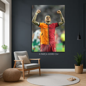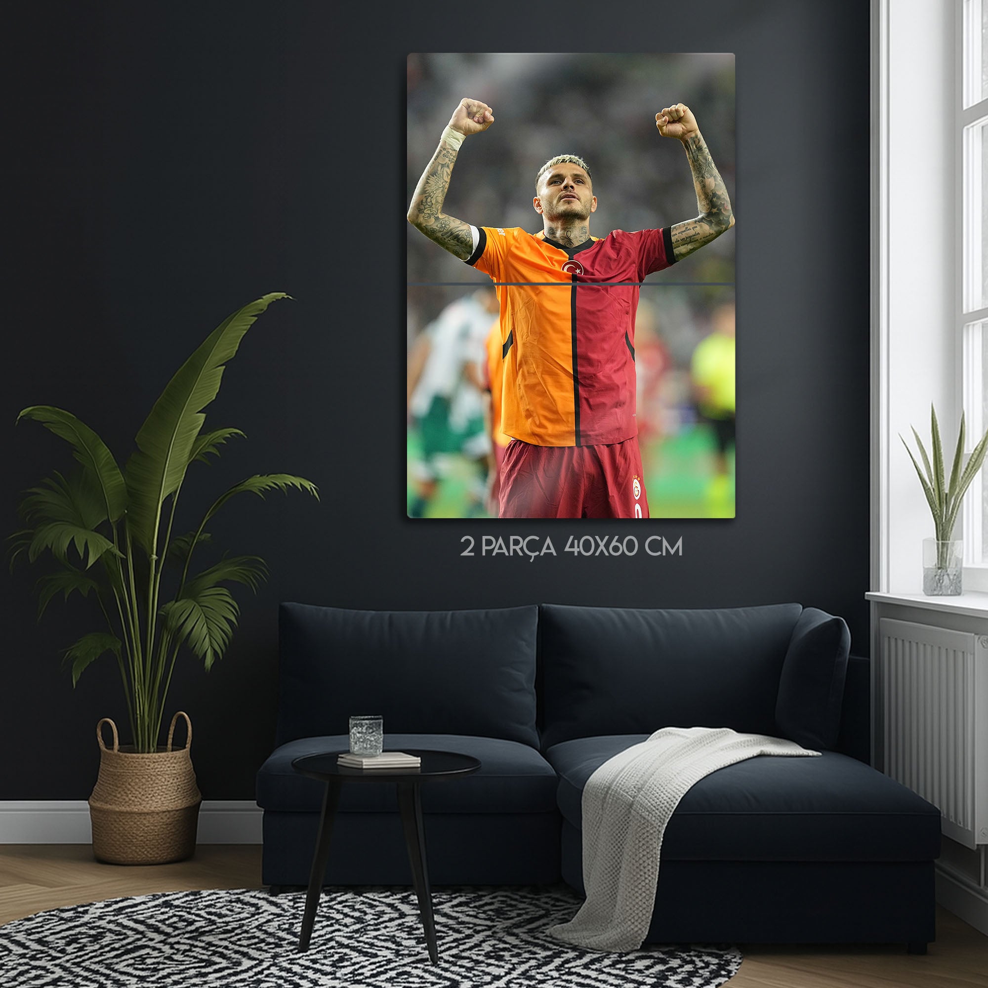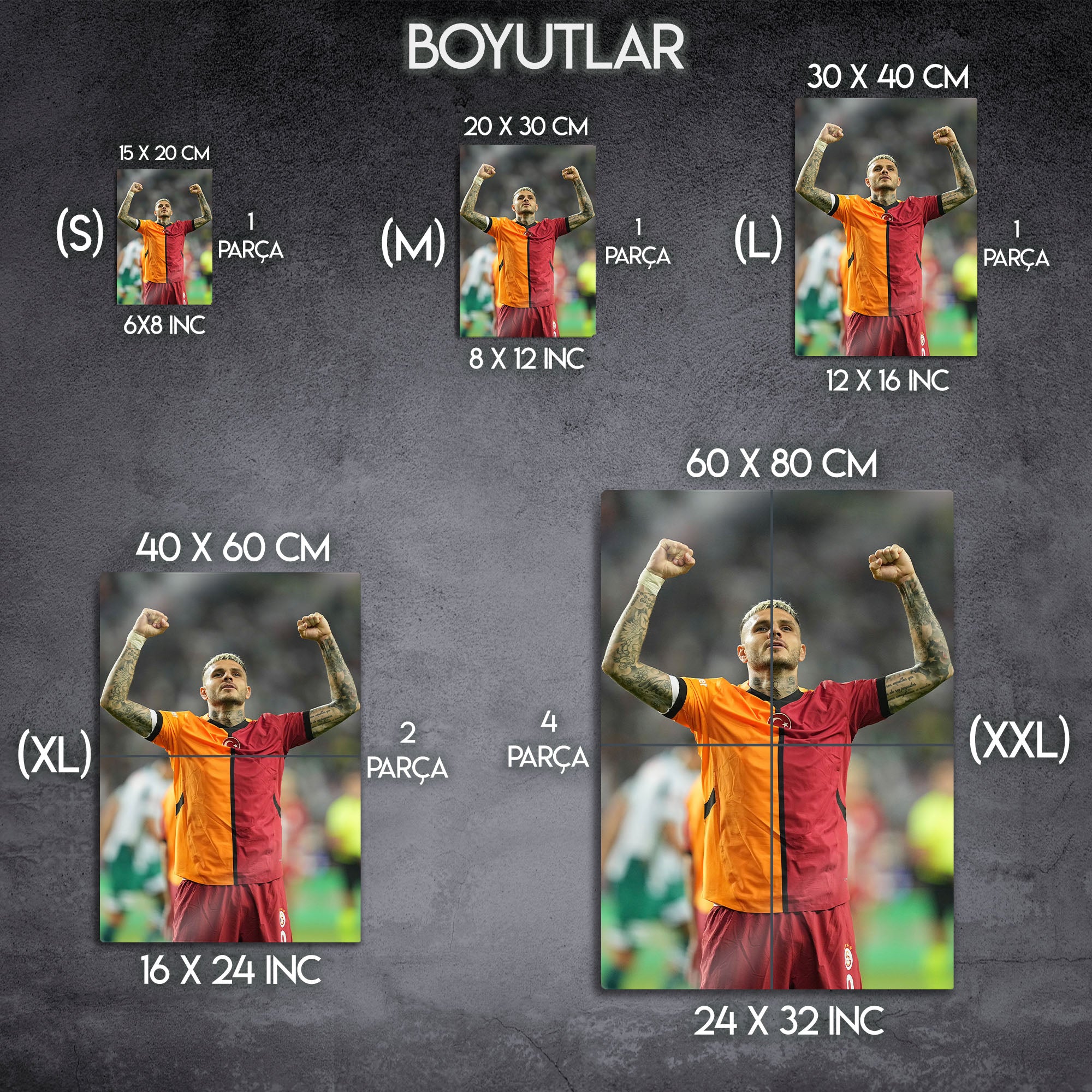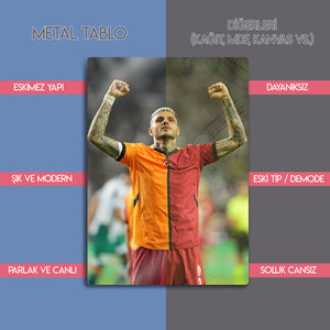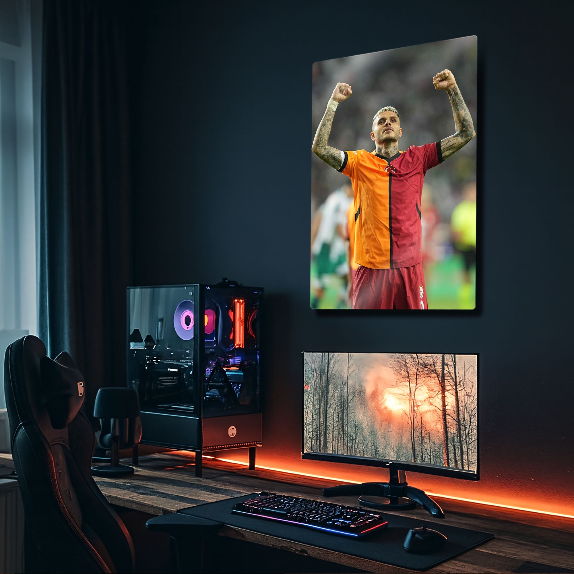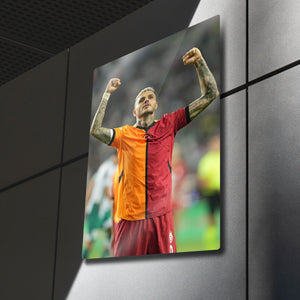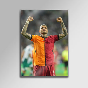 Galatasaray taraftarının gönlünde taht kuran, tribünlerin "Aşkın Olayım" şarkısıyla inlediği anların kahramanı Mauro Icardi, şimdi bu özel tasarım metal tablo ile evinize geliyor. Arjantinli yıldızın attığı gollerden sonra yaptığı ikonik sevinç gösterisi, bu çarpıcı duvar dekoruyla ölümsüzleşiyor. Parçalı formanın asil renkleri ve Icardi'nin karizmatik duruşu, bu esere bakan her futbolseveri heyecanlandıracak.