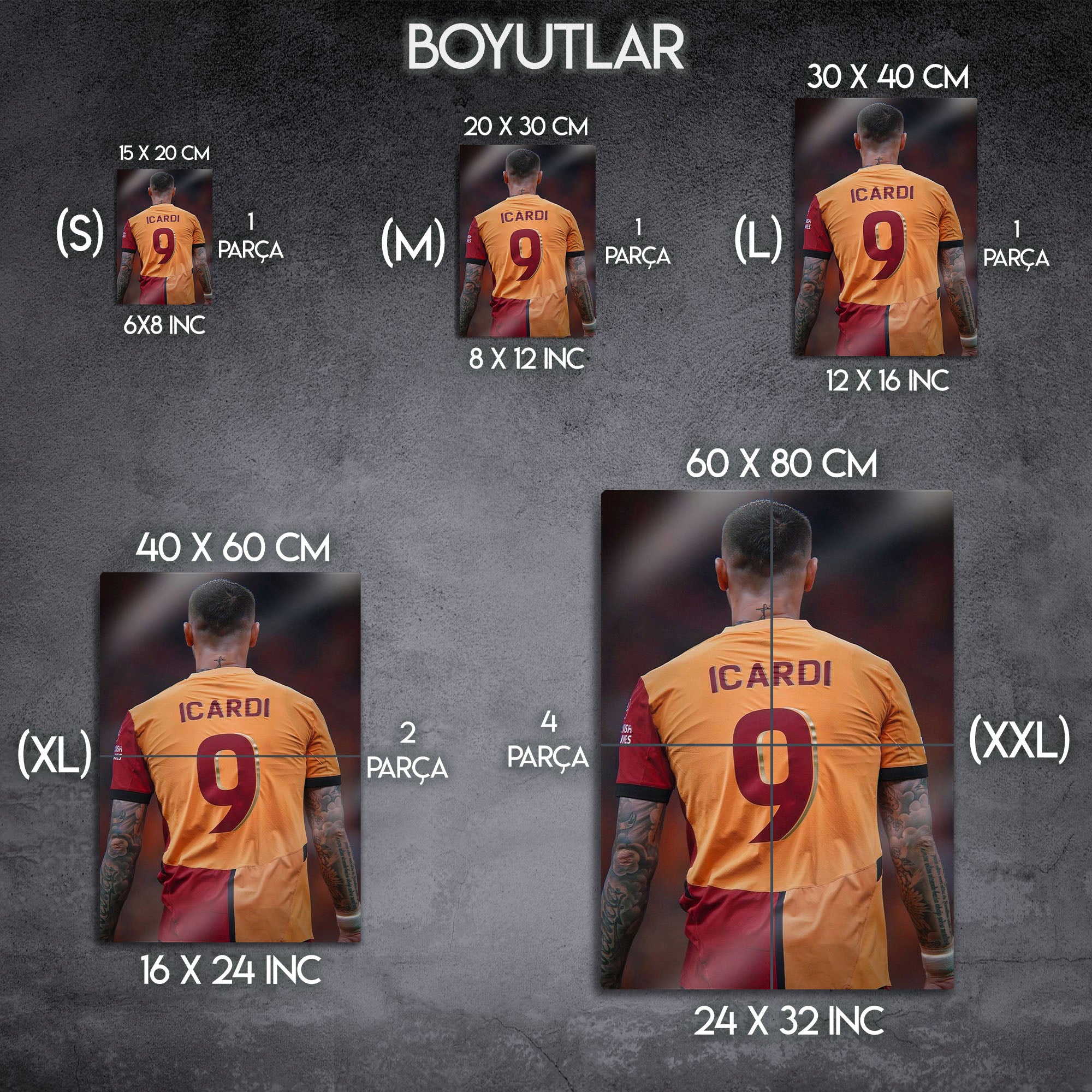 Yüksek çözünürlüklü fotoğraf kalitesinde, premium metal malzeme üzerine basılan bu duvar dekoru, parçalı formanın canlı renklerini ve Icardi'nin ismini en net şekilde sergiler. Tablo, yıldız futbolcunun karakteristik dövmelerinden ense kökündeki imzasına kadar tüm ayrıntılarıyla gerçekçi bir görünüm sunar.