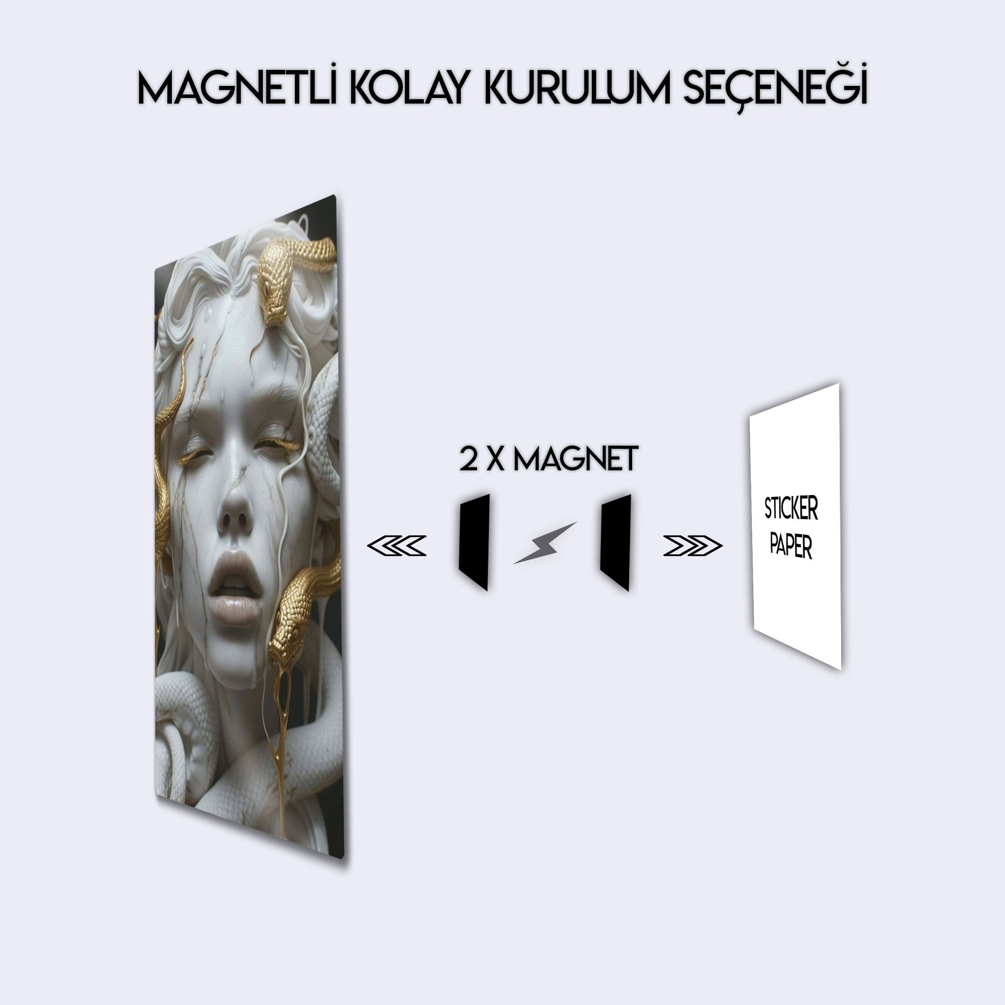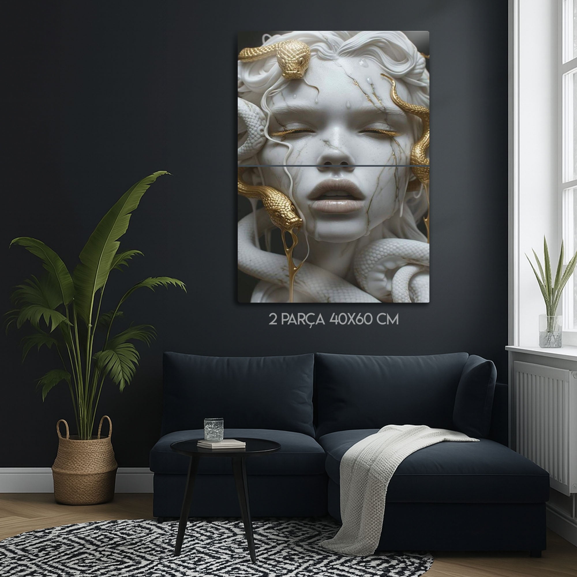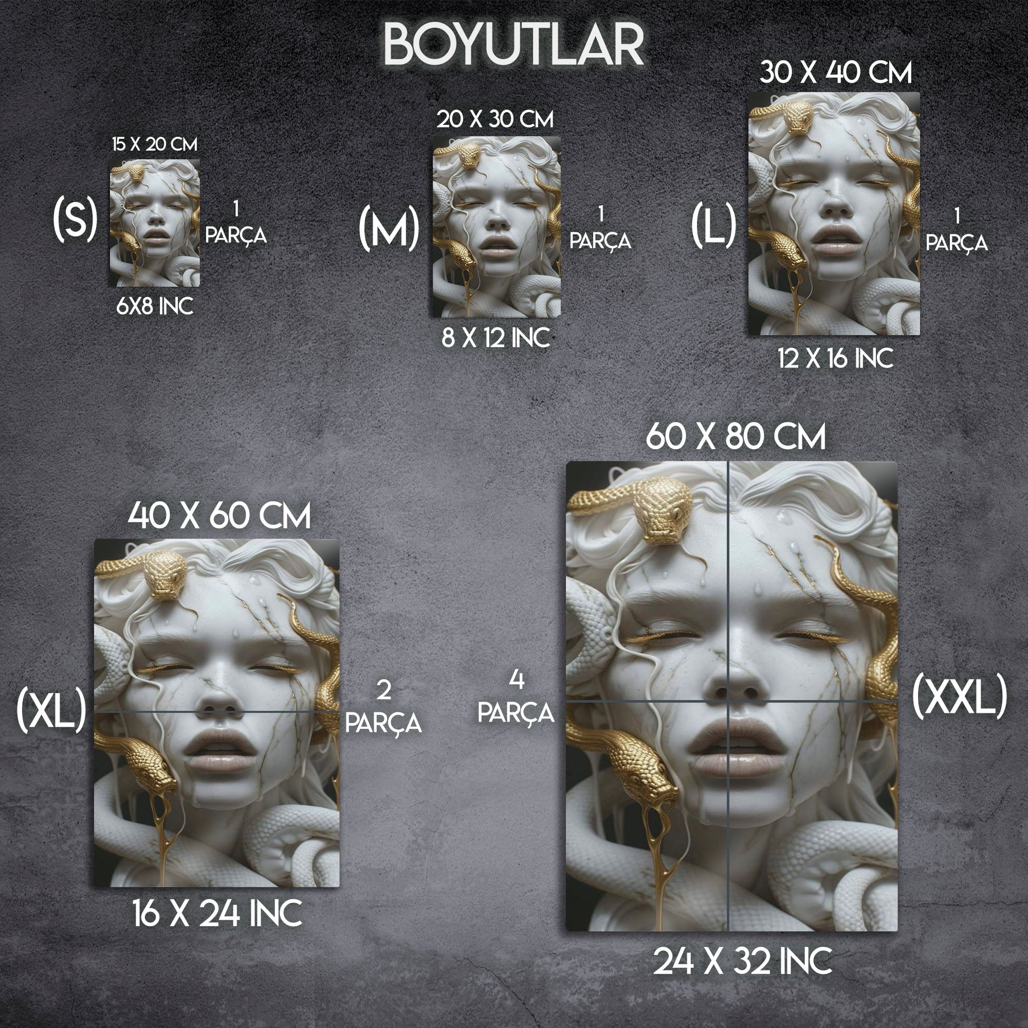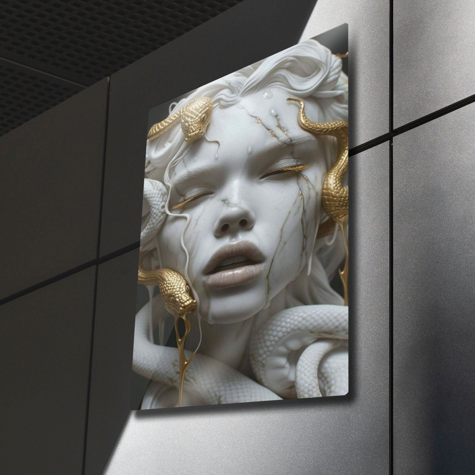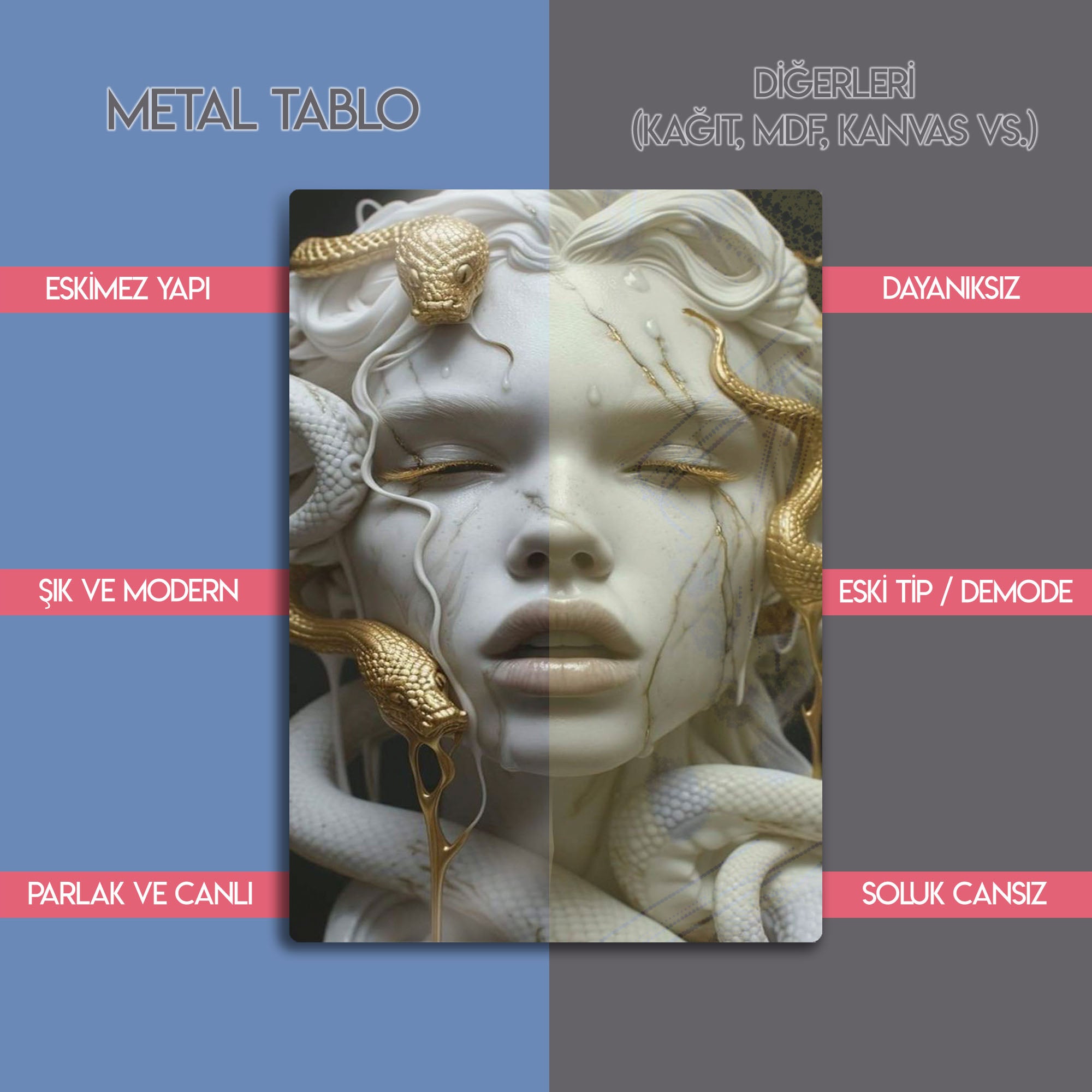 Yunan mitolojisinin en ikonik ve en trajik figürlerinden Medusa'nın hikayesini, modern bir sanat başyapıtıyla duvarlarınıza taşıyın. Bu olağanüstü metal tablo, Medusa'yı, saf beyaz mermerden yontulmuş bir heykel ve saçlarının arasından süzülen parlak altın yılanlarla, hem kurban hem de canavar olarak yeniden yorumluyor. Yüzünden akan altın gözyaşları, onun trajik kaderine ve içindeki kırılganlığa bir göndermedir.