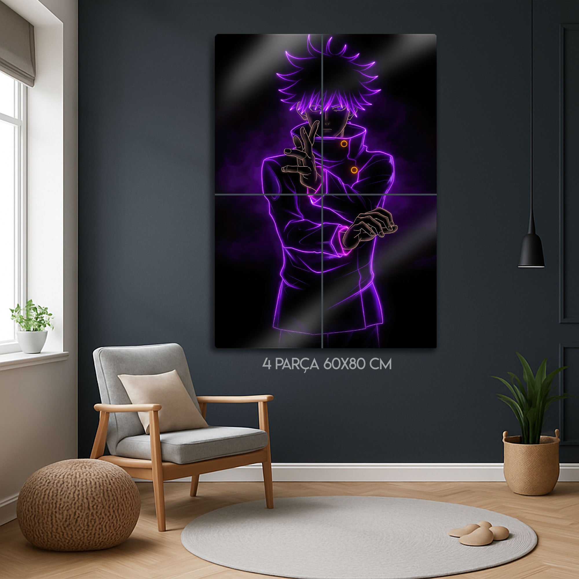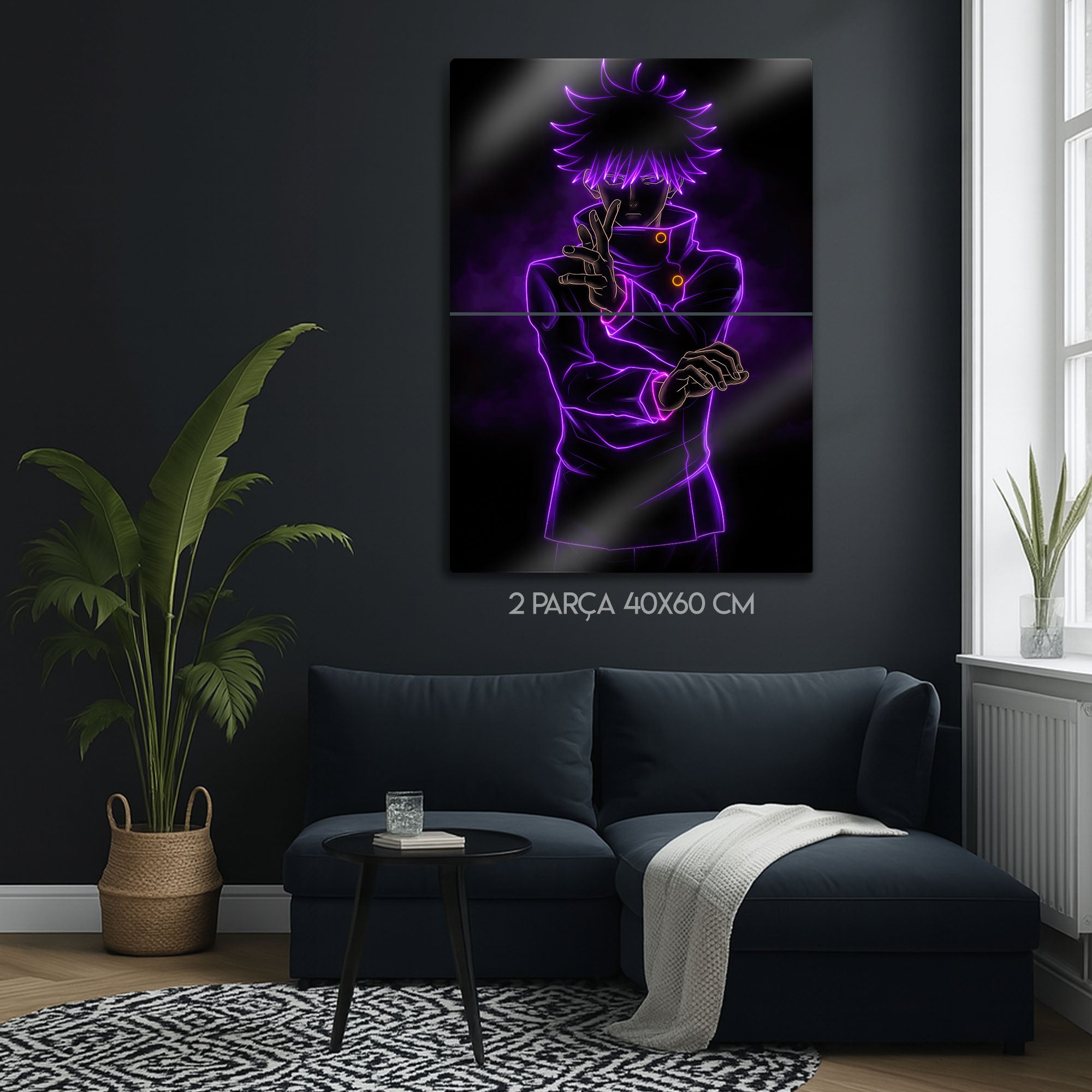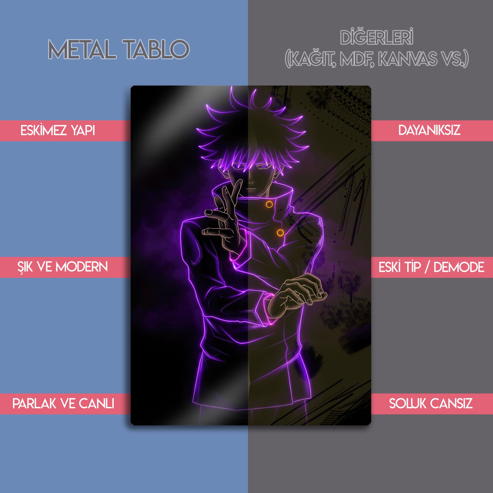 Bu eser, her Jujutsu Kaisen ve anime hayranının koleksiyonunda olması gereken, modern ve karizmatik bir parçadır. Metalin derin siyah zemini, mor neon çizgilerin parlaklığını ve enerjisini mükemmel bir şekilde öne çıkarır. Oyun odaları, genç odaları, stüdyolar veya modern yaşam alanlarına anında bir gizem, güç ve havalı bir atmosfer katacaktır.