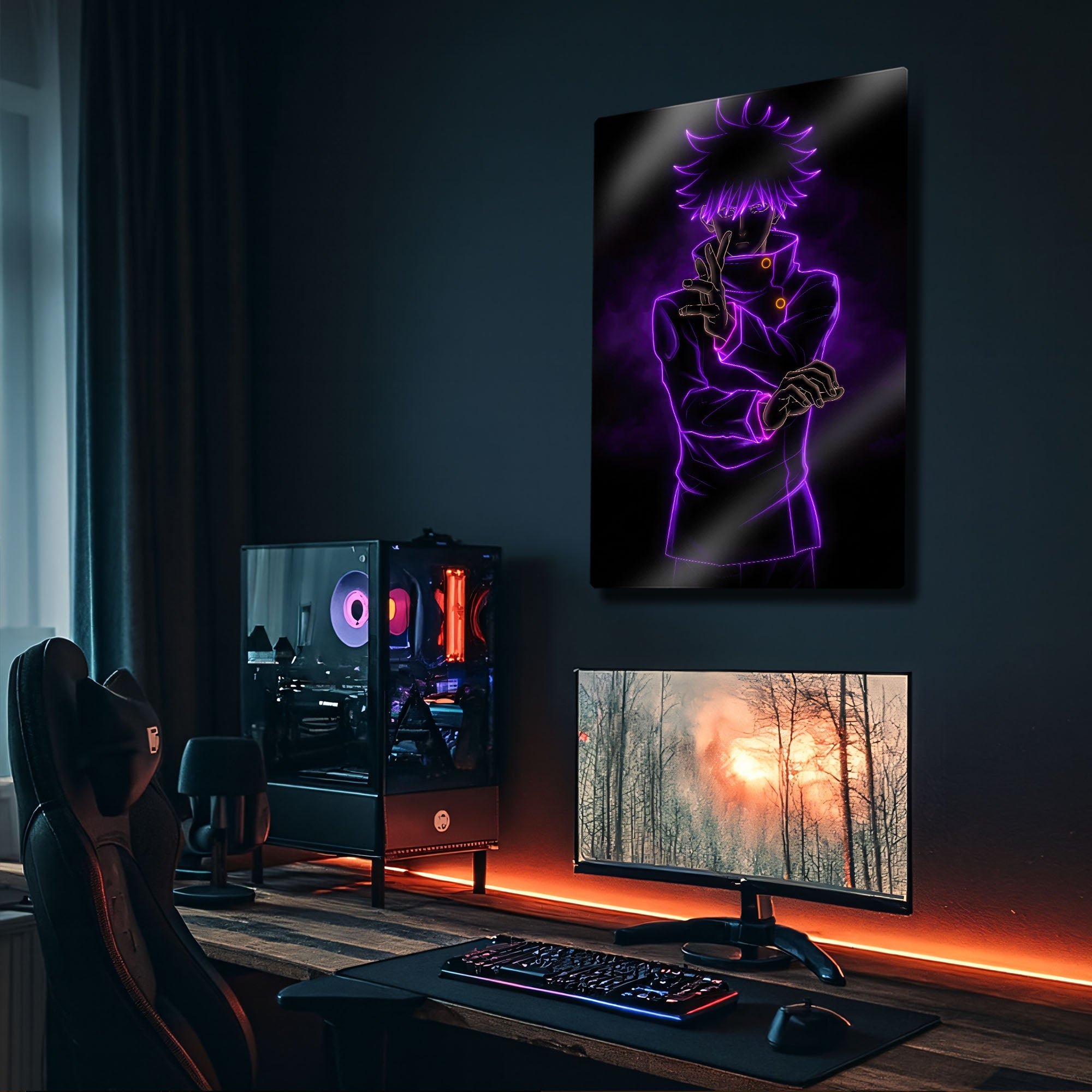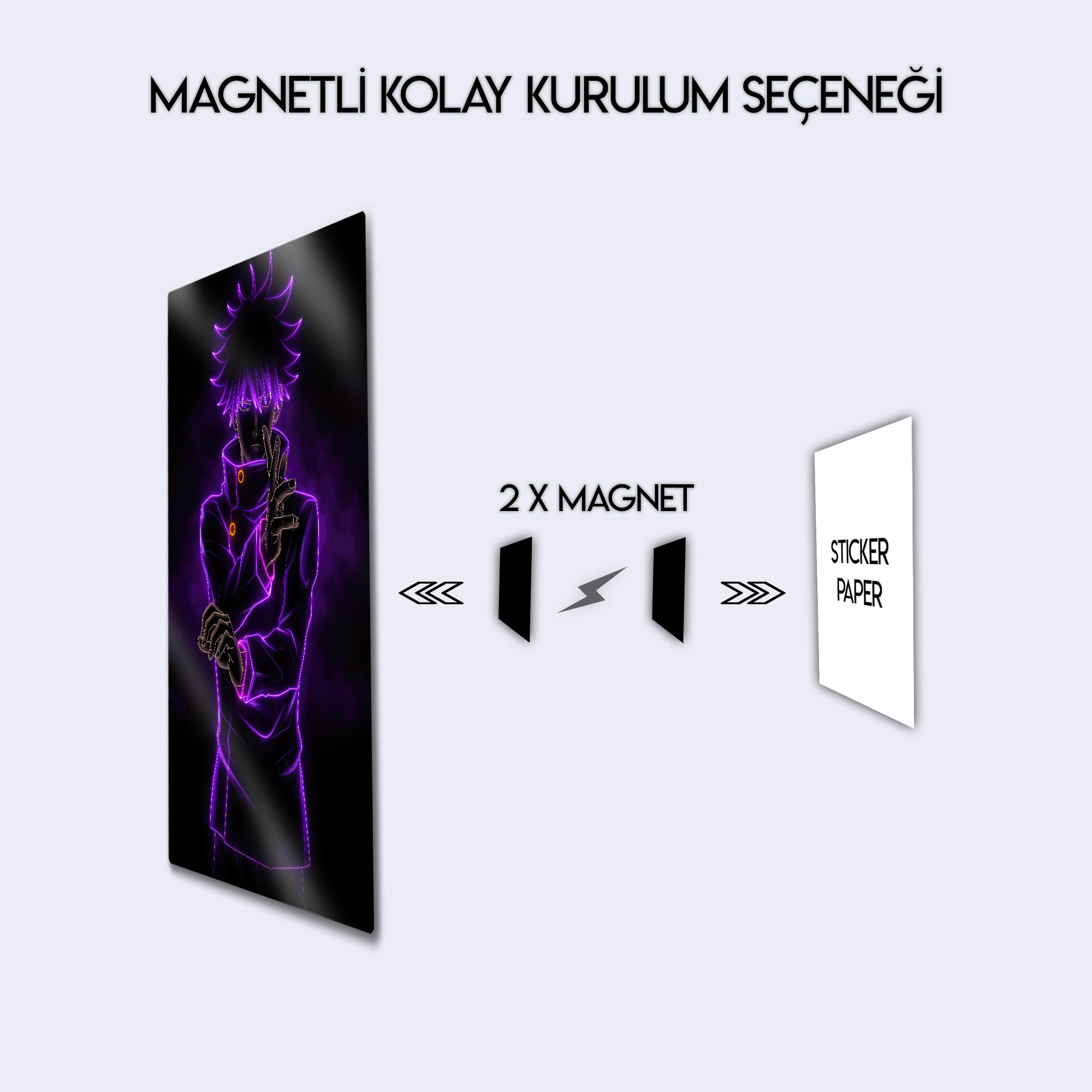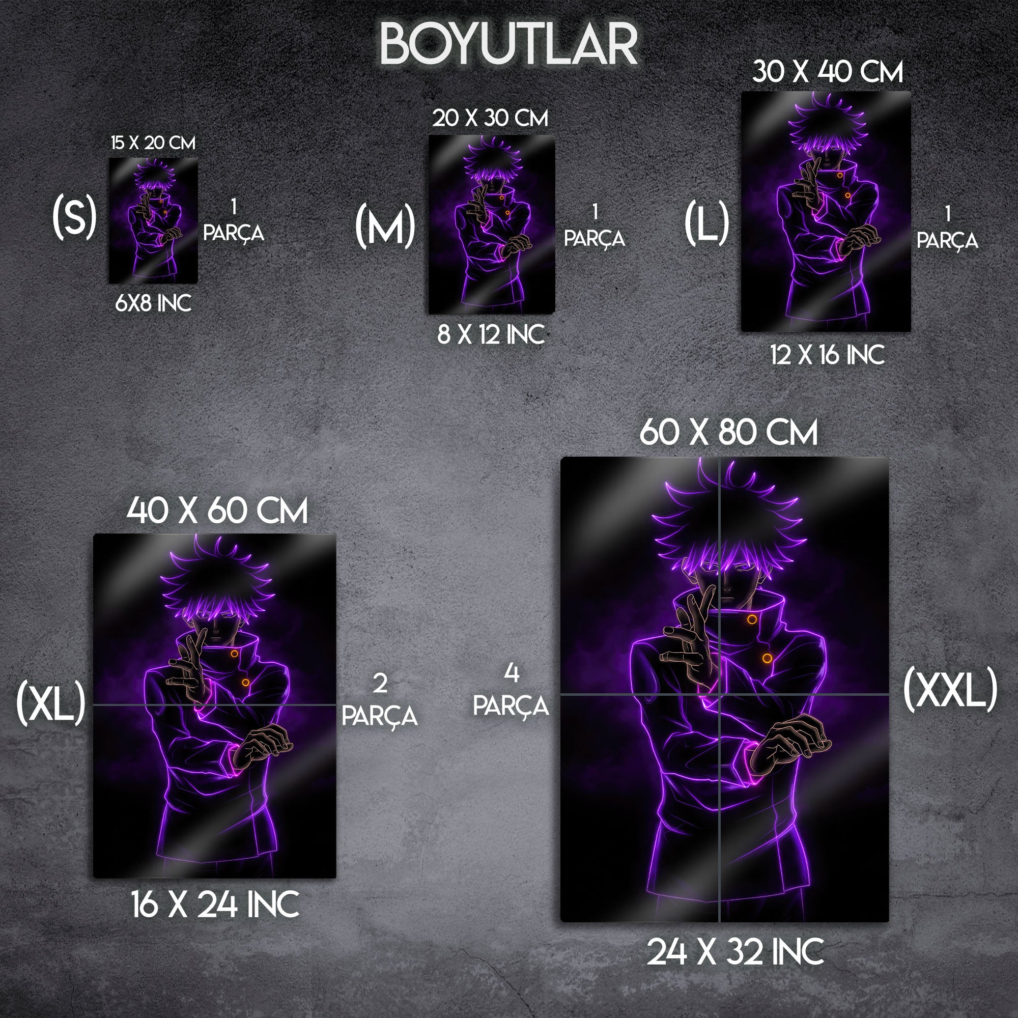 Bu eser, her Jujutsu Kaisen ve anime hayranının koleksiyonunda olması gereken, modern ve karizmatik bir parçadır. Metalin derin siyah zemini, mor neon çizgilerin parlaklığını ve enerjisini mükemmel bir şekilde öne çıkarır. Oyun odaları, genç odaları, stüdyolar veya modern yaşam alanlarına anında bir gizem, güç ve havalı bir atmosfer katacaktır.