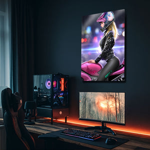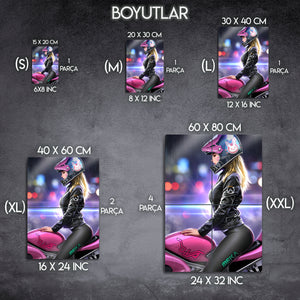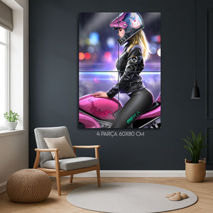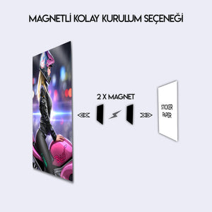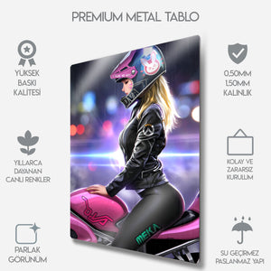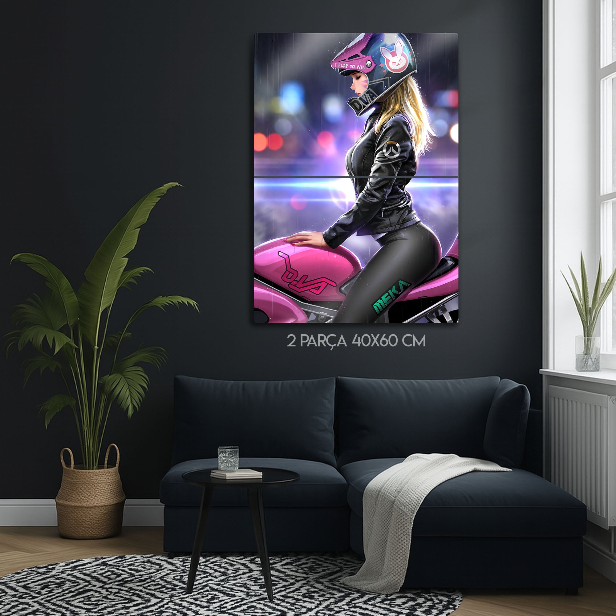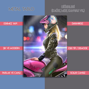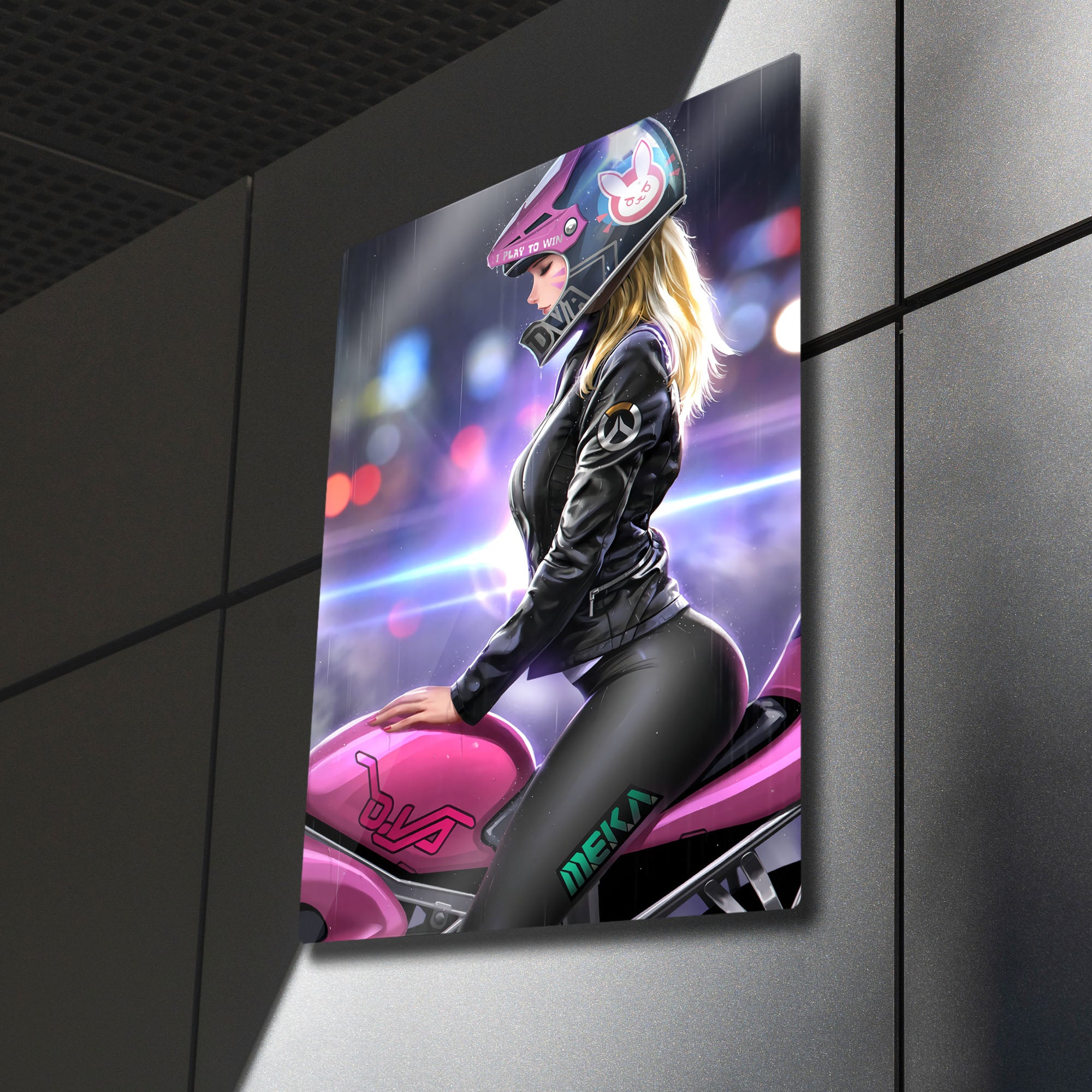 ''I Play to Win!'' (Kazanmak için Oynarım!) Overwatch evreninin en havalı ve en rekabetçi kahramanı D.Va'nın bu alternatif ve asi yorumuyla duvarlarınıza stil katın! Bu olağanüstü metal tablo, D.Va'yı ikonik pembe motosikletinin üzerinde, neon ışıklarla aydınlatılmış yağmurlu bir şehir gecesinde, karizmatik bir motorcu olarak tasvir ediyor.