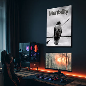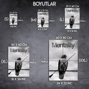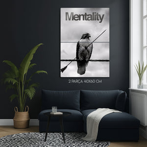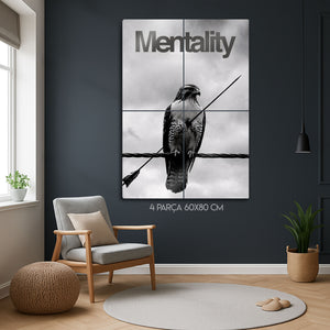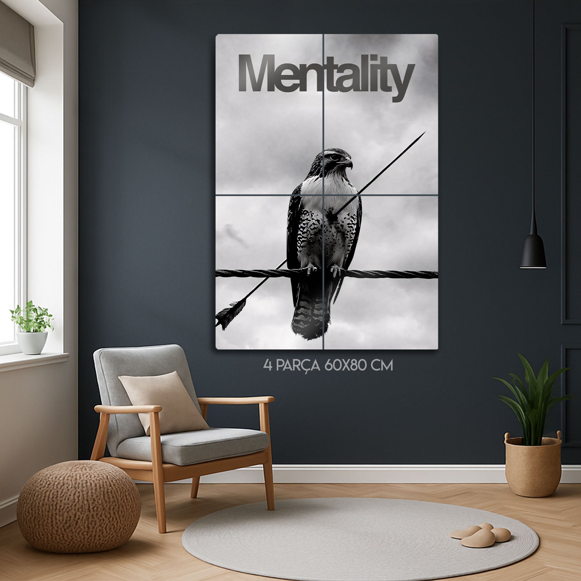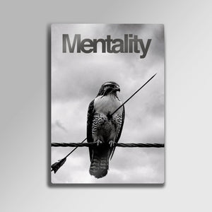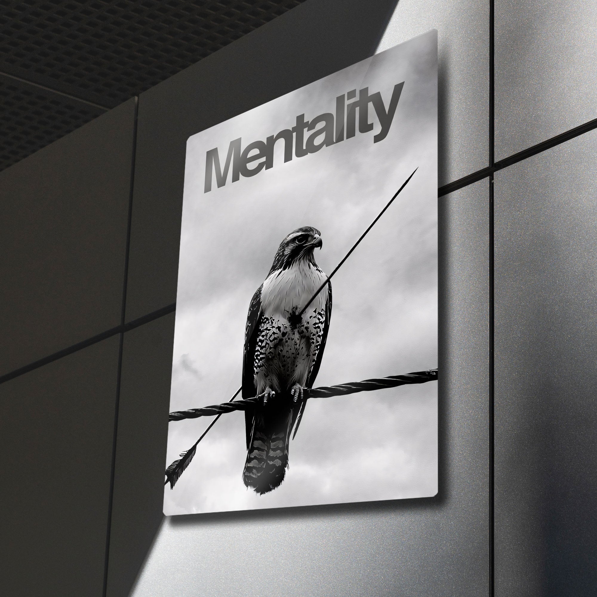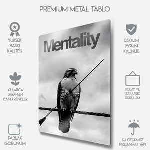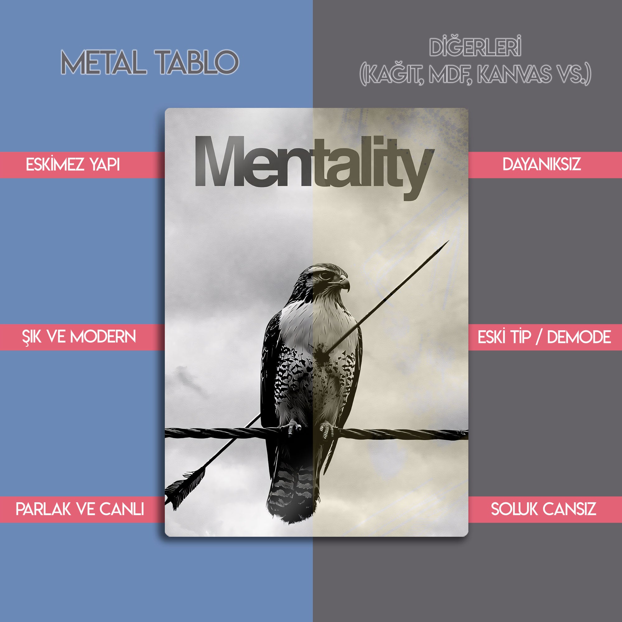Hayatın getirdiği tüm zorluklara ve aldığı tüm yaralara rağmen dimdik ayakta duran bir zihniyet... Bu olağanüstü metal tablo, vücuduna saplanmış bir oka rağmen sarsılmaz bir duruş sergileyen asil bir şahini, "Mentality" (Zihniyet) kelimesiyle birleştirerek, iradenin ve kararlılığın en güçlü halini simgeliyor.