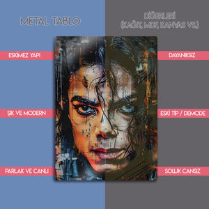 Her bir fırça darbesi, boya akıntısı ve renk patlaması, MJ'in müziğindeki o ham enerjiyi, tutkuyu ve sanatsal derinliği yansıtıyor. Bu eser, sadece bir müzik posteri değil, aynı zamanda bir popüler kültür ikonunun mirasına ve sanatına yapılmış modern bir saygı duruşudur. Metalin parlak yüzeyi, bu enerjik kompozisyonun her detayını ve canlılığını daha da öne çıkarır. Müzik odaları, stüdyolar, "man cave"ler veya modern yaşam alanlarına anında bir karakter ve sanatsal bir ruh katacaktır.