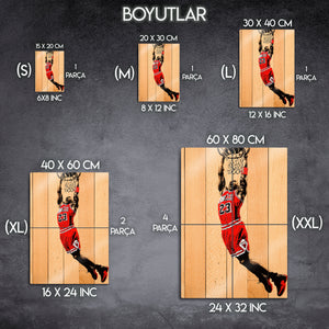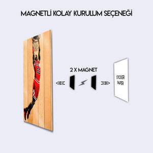 Bu eser, sadece bir spor posteri değil, aynı zamanda azmin, tutkunun ve mükemmelliğin bir sanat manifestosudur. Kırmızının ve siyahın cesur kontrastı, Chicago Bulls'un efsanevi ruhunu yansıtırken, metalin modern dokusu bu sanatsal tasarıma şık bir derinlik katıyor. Spor odaları, "man cave"ler, ofisler veya modern yaşam alanlarına anında bir şampiyonluk ruhu ve sanatsal bir dinamizm katacaktır.