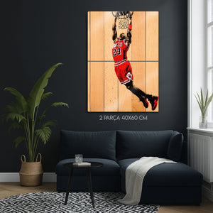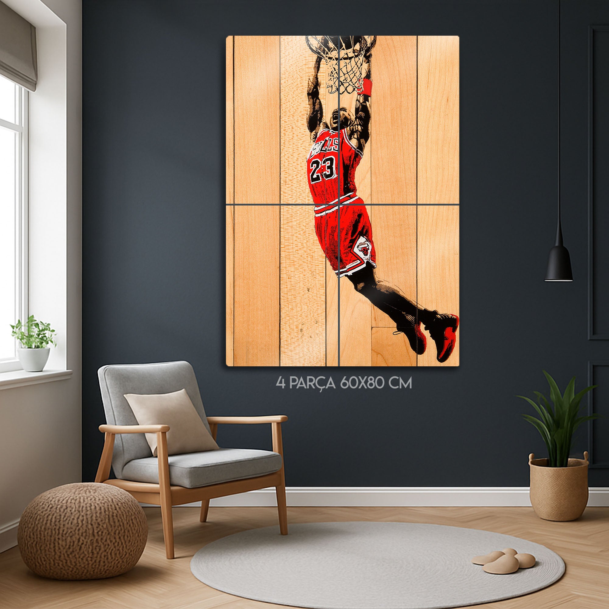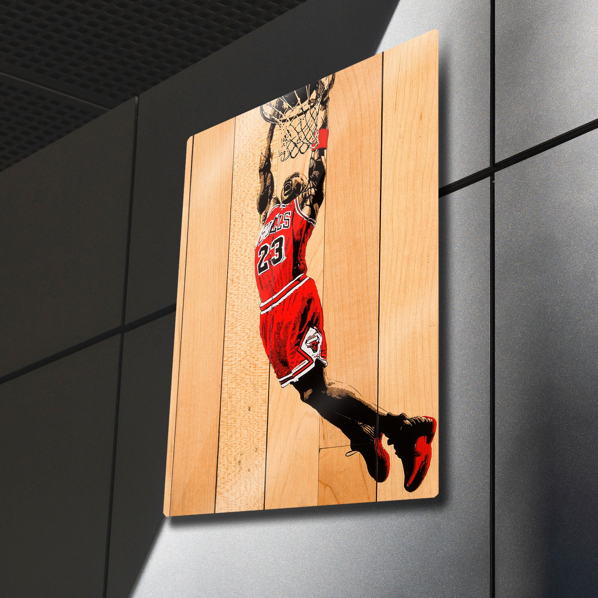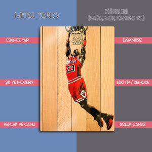 Basketbol tarihinin en büyük efsanesi, "His Airness" Michael Jordan'ın yer çekimine meydan okuduğu o unutulmaz anlardan birini duvarlarınıza taşıyın! Bu eşsiz metal tablo, MJ'in ikonik smaç anını, basketbol sahasının ahşap parke zeminini andıran bir arka plan üzerinde, modern bir stencil ve graffiti sanatını andıran bir estetikle sunuyor.