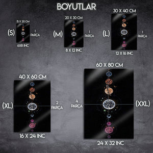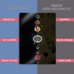Bu tablo, sadece bir astronomi posteri değil, aynı zamanda evrenin gizemine ve güzelliğine yapılmış bir saygı duruşudur. Metalin modern dokusu, gezegenlerin renklerini ve yıldızların parıltısını mükemmel bir şekilde öne çıkarır. Salon, çalışma odası, yatak odası, genç odası veya meditasyon alanı gibi mekanlara anında bir derinlik, huzur ve entelektüel bir atmosfer katacaktır.