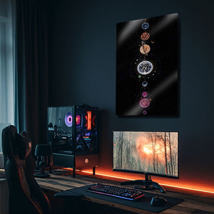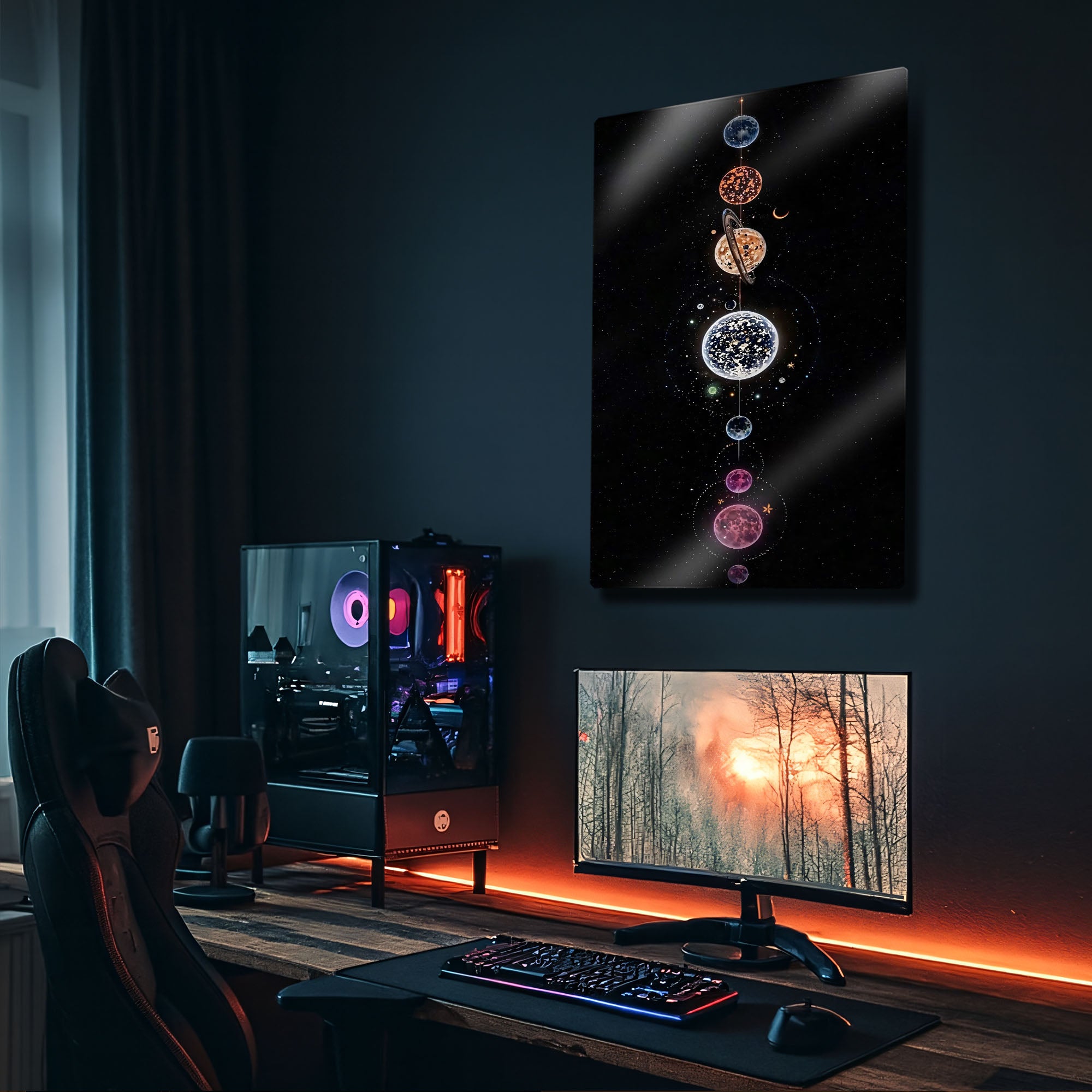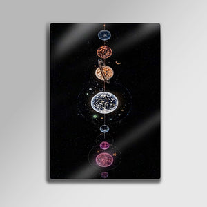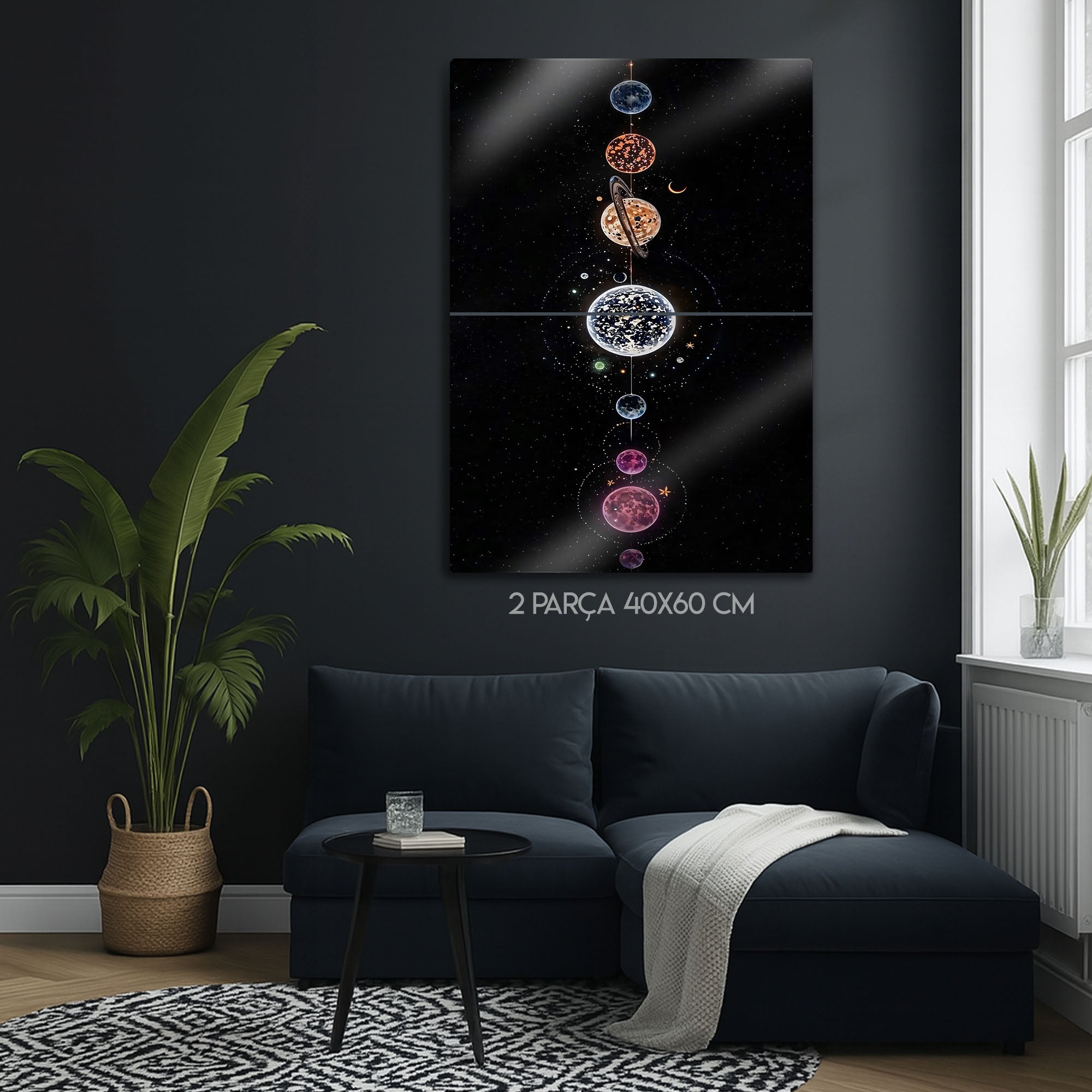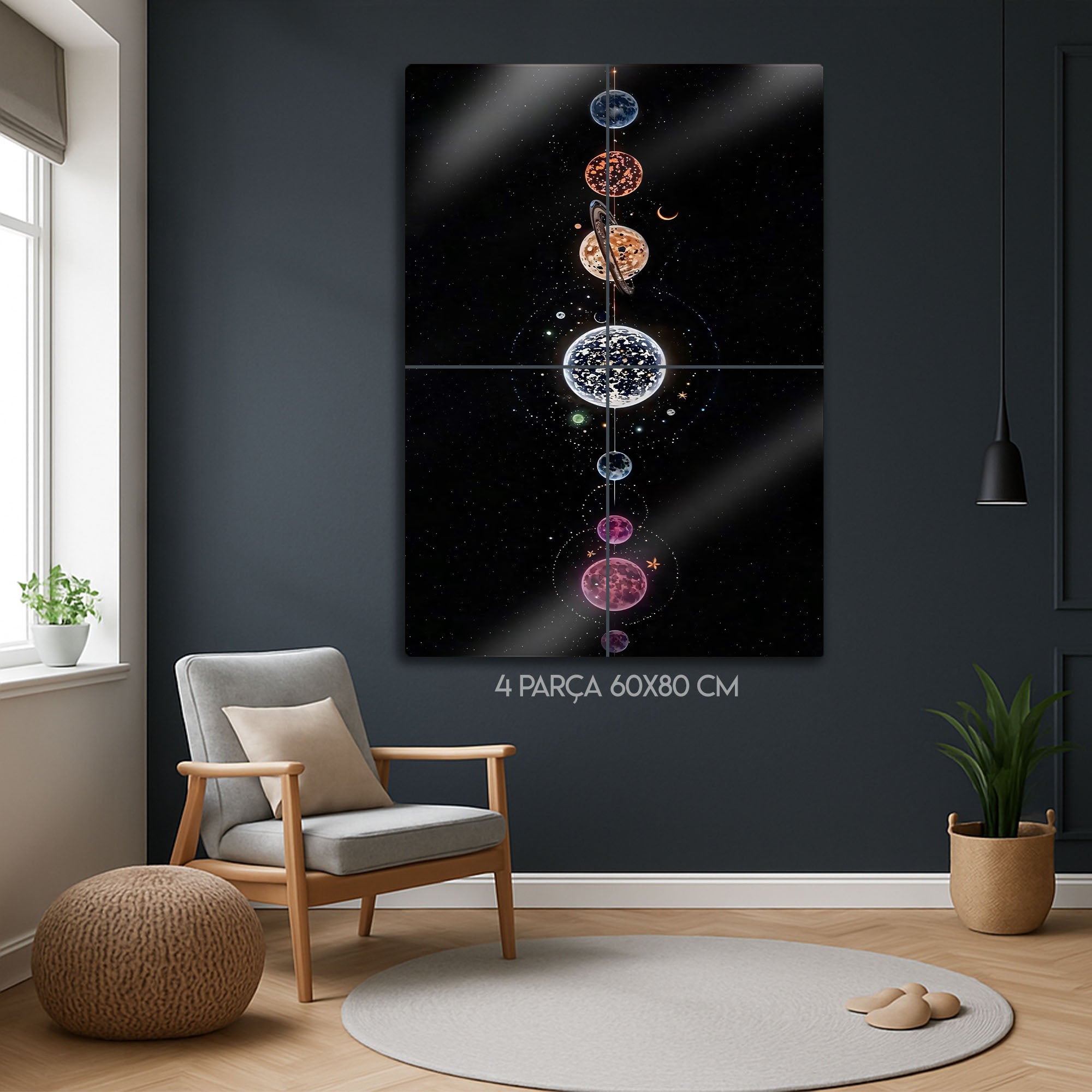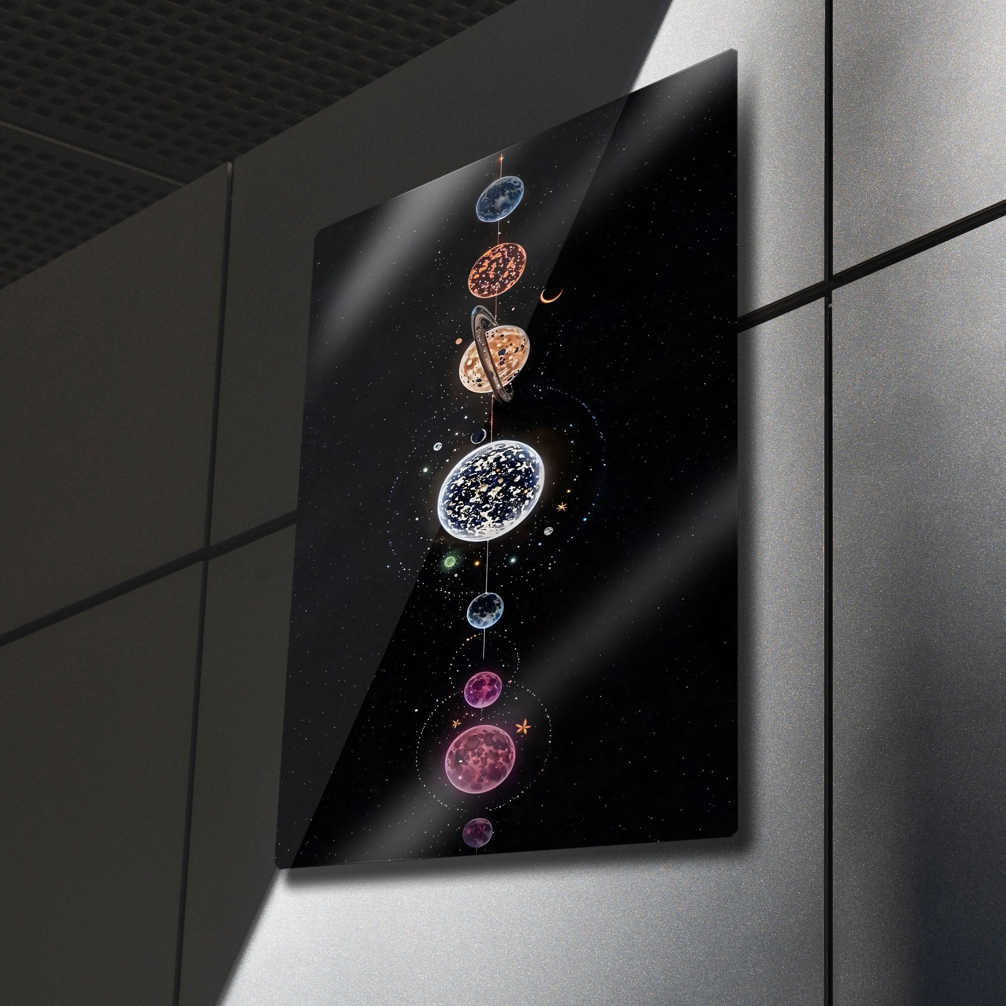 Kozmosun sonsuz güzelliğini ve gezegenlerin mistik dansını duvarlarınıza taşıyın. Bu olağanüstü metal tablo, Güneş Sistemi'ni, sanatsal ve bohem bir yorumla, dikey bir dizilim içinde sunuyor. Her bir gezegenin kendine has renkleri ve dokularıyla, yıldızlarla dolu karanlık bir uzay fonunda parladığı bu eser, hem bilimsel bir merakı hem de sanatsal bir ruhu yansıtıyor.