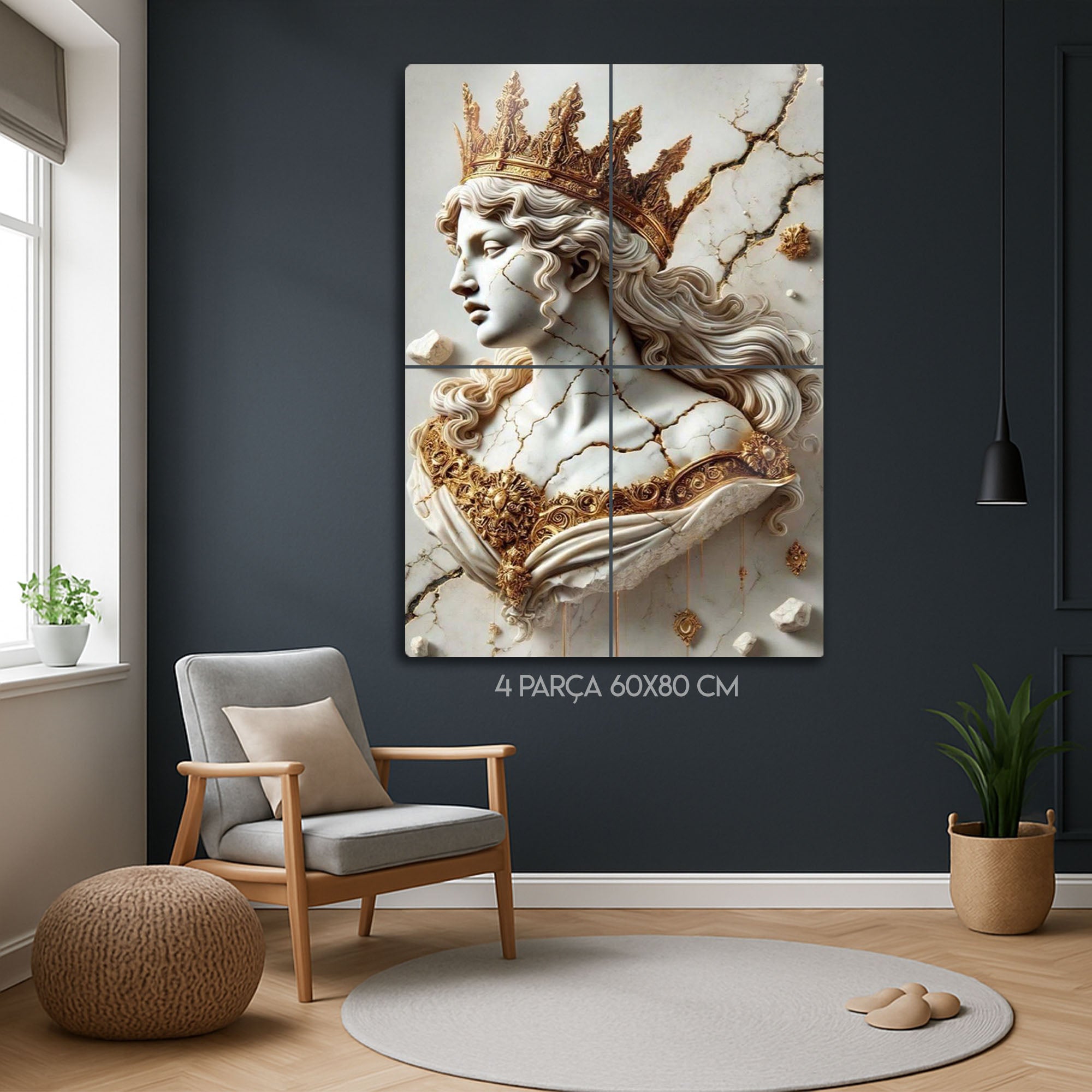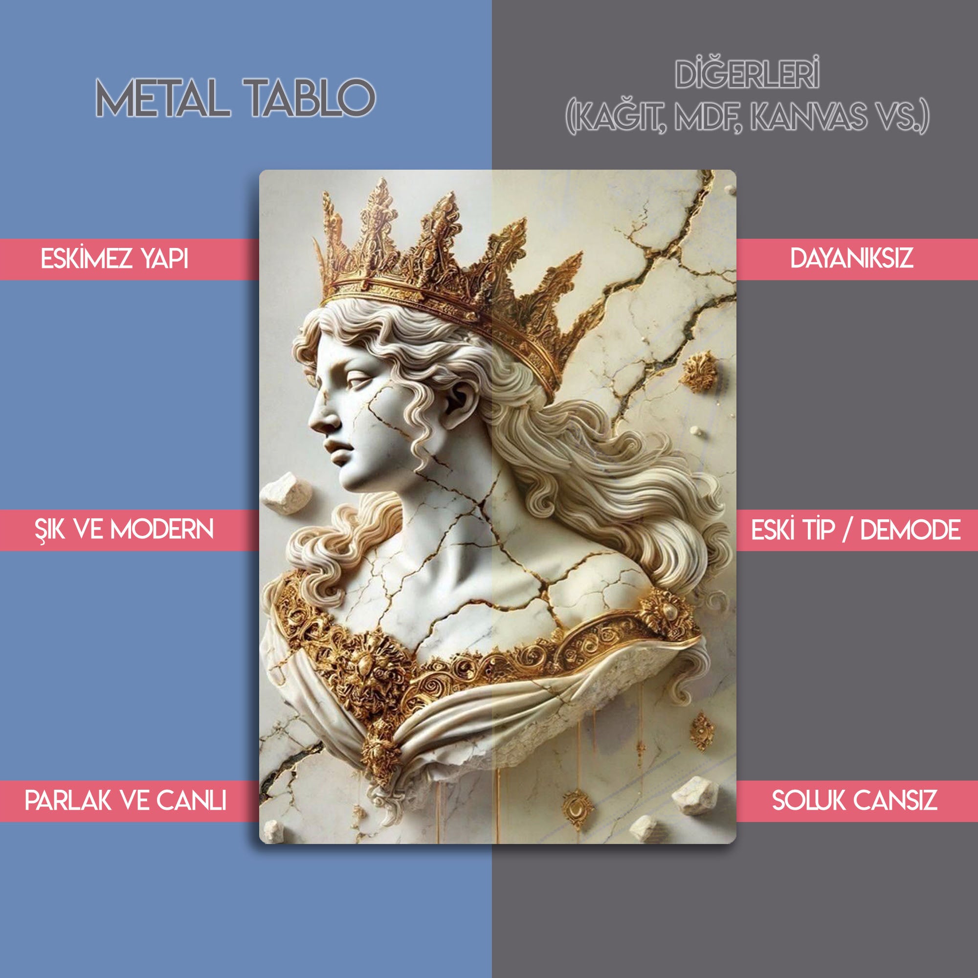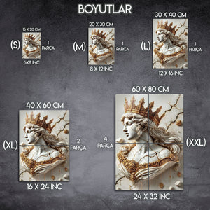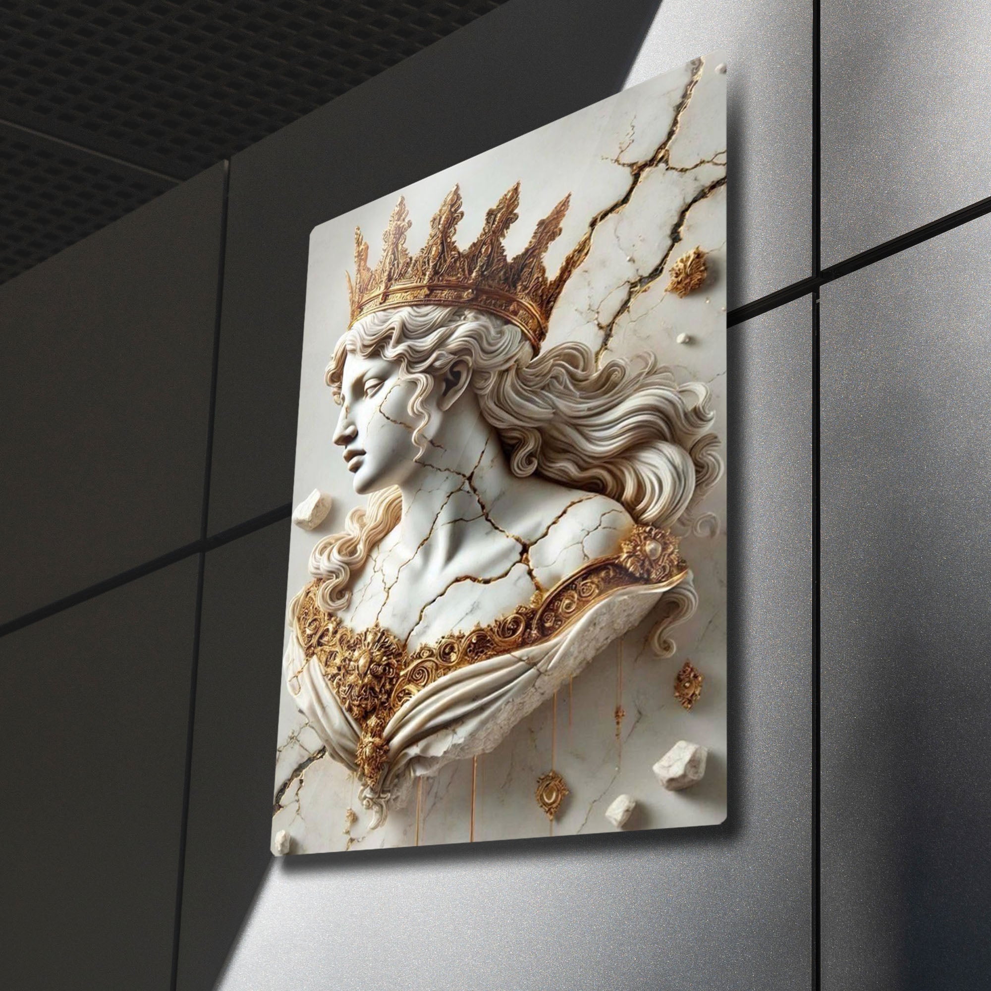 Zamanın ve tarihin izlerini taşıyan, kırılgan ama bir o kadar da asil bir güzellik... Bu olağanüstü metal tablo, adeta bir müzeden fırlamış gibi duran, çatlamış bir mermer kraliçe büstünü, altın tacı ve işlemeleriyle birlikte, üç boyutlu bir sanat eseri olarak sunuyor.