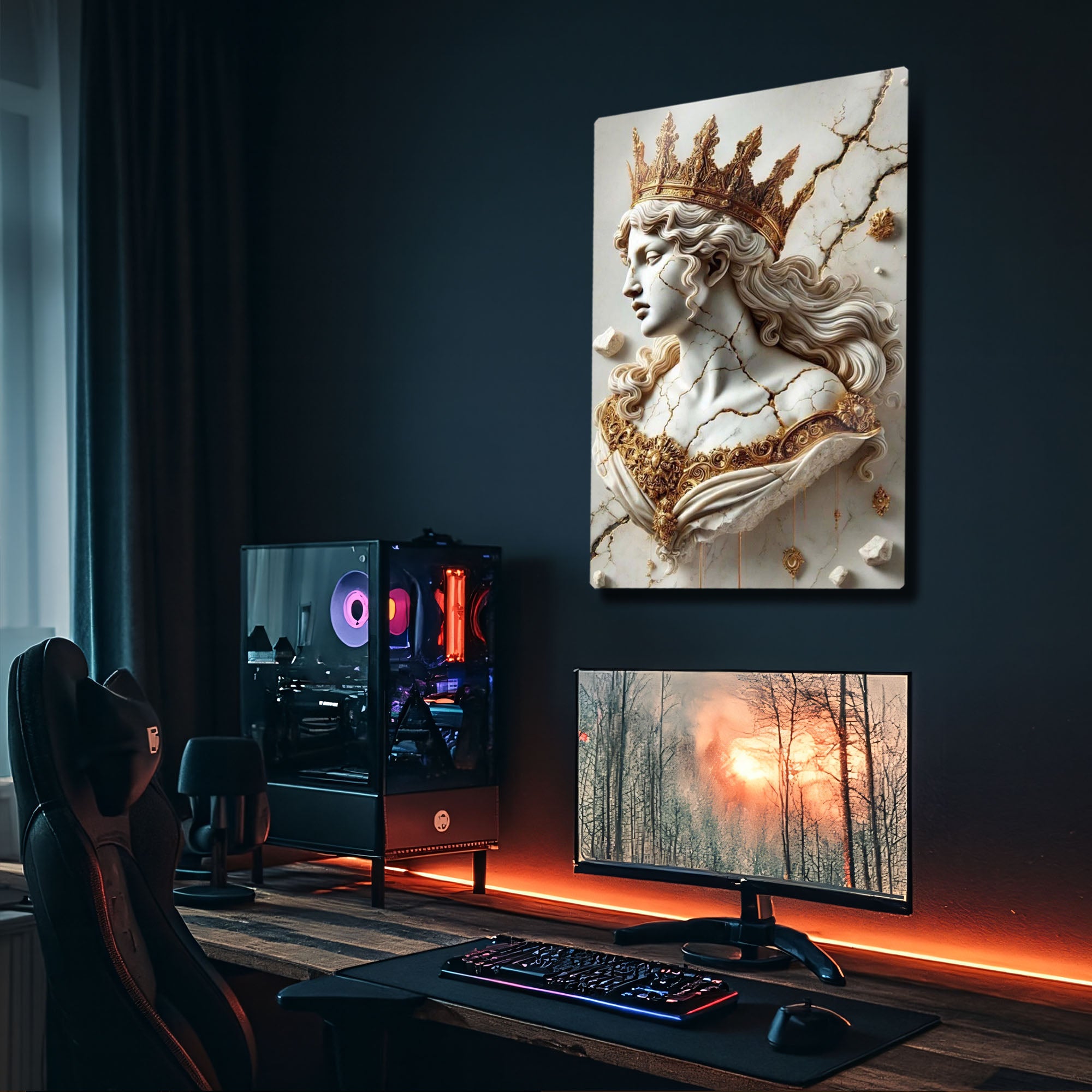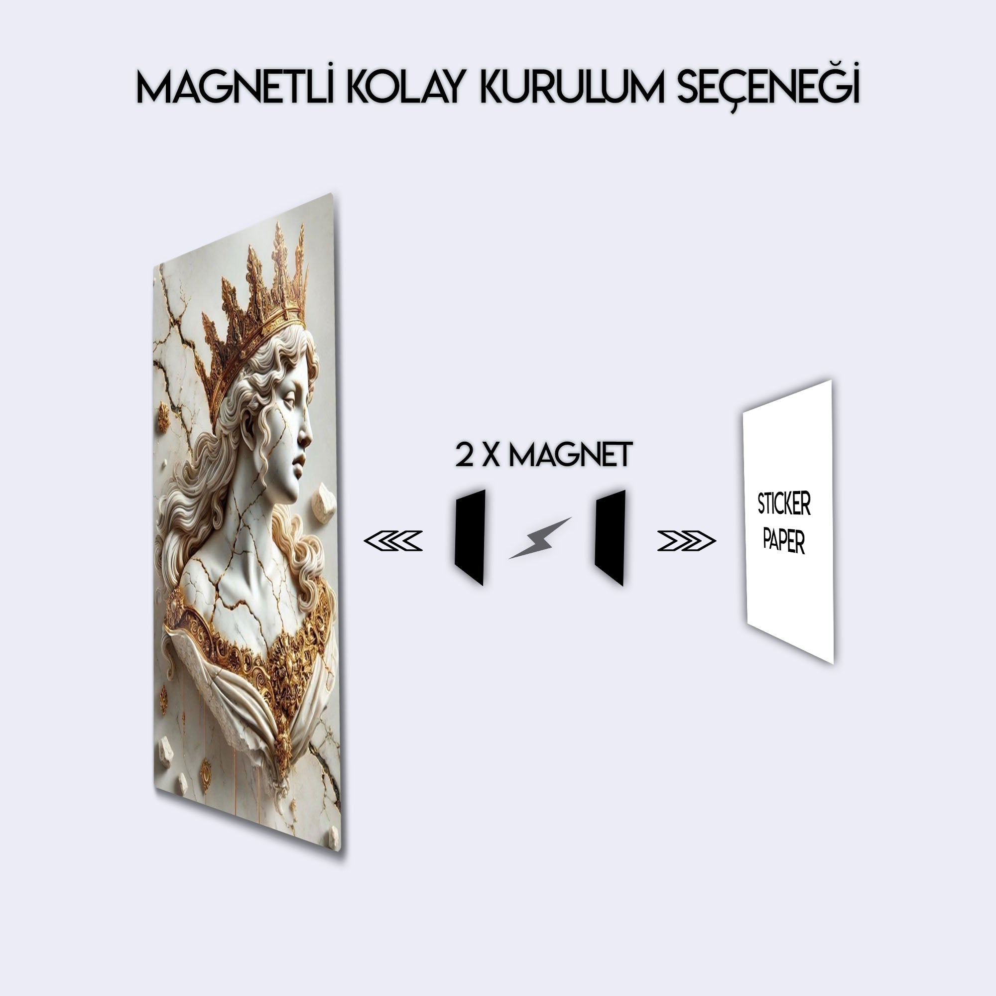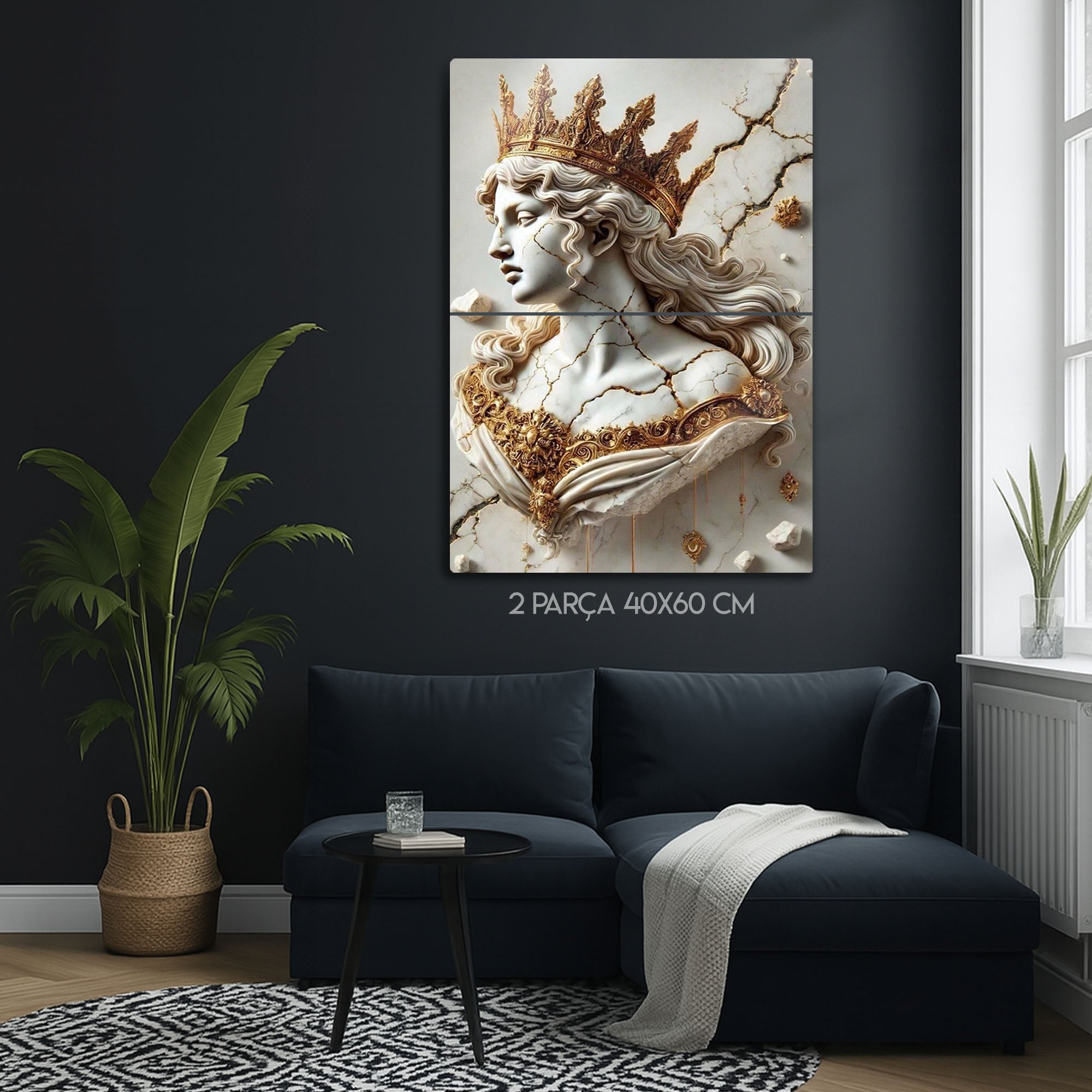 Zamanın ve tarihin izlerini taşıyan, kırılgan ama bir o kadar da asil bir güzellik... Bu olağanüstü metal tablo, adeta bir müzeden fırlamış gibi duran, çatlamış bir mermer kraliçe büstünü, altın tacı ve işlemeleriyle birlikte, üç boyutlu bir sanat eseri olarak sunuyor.