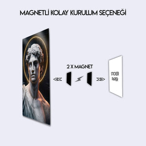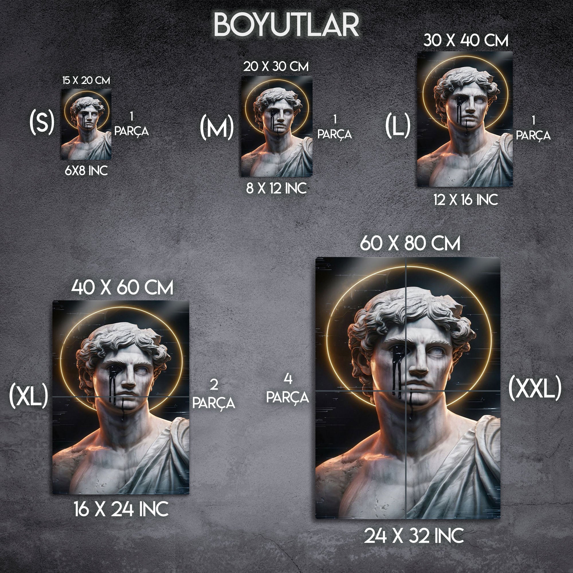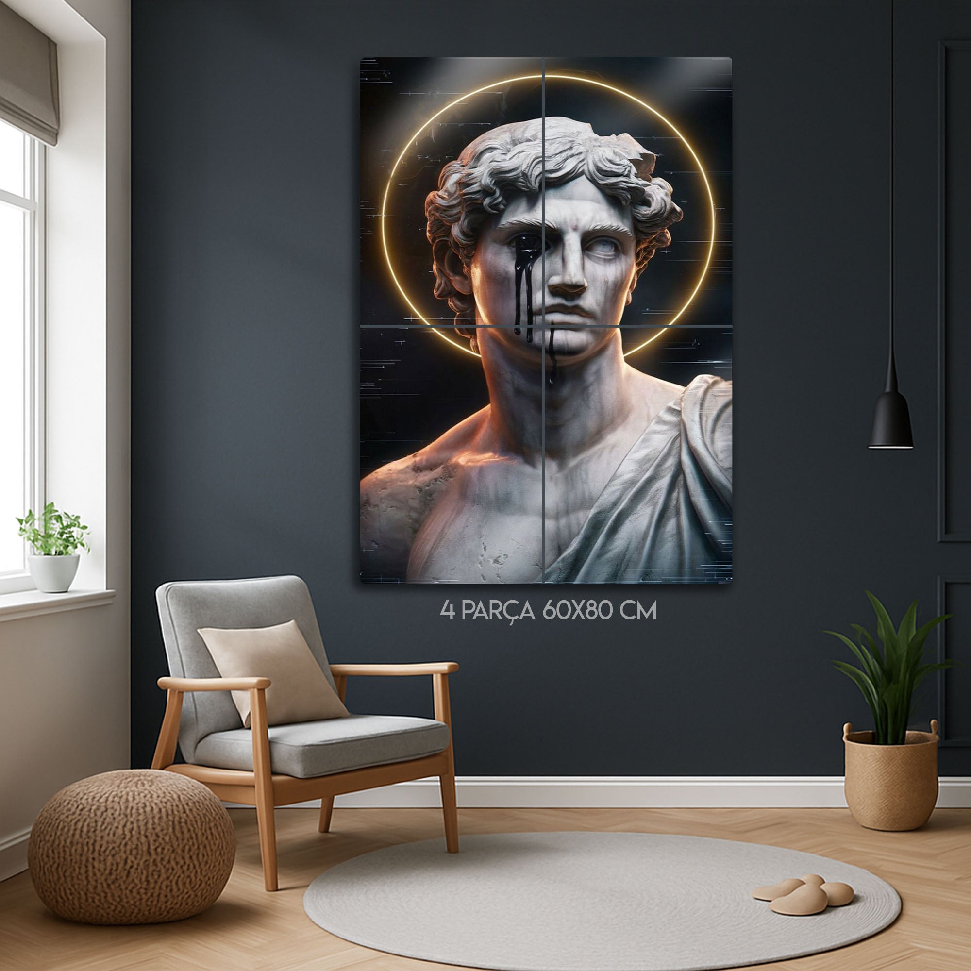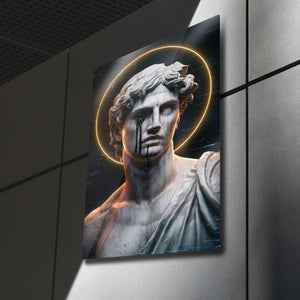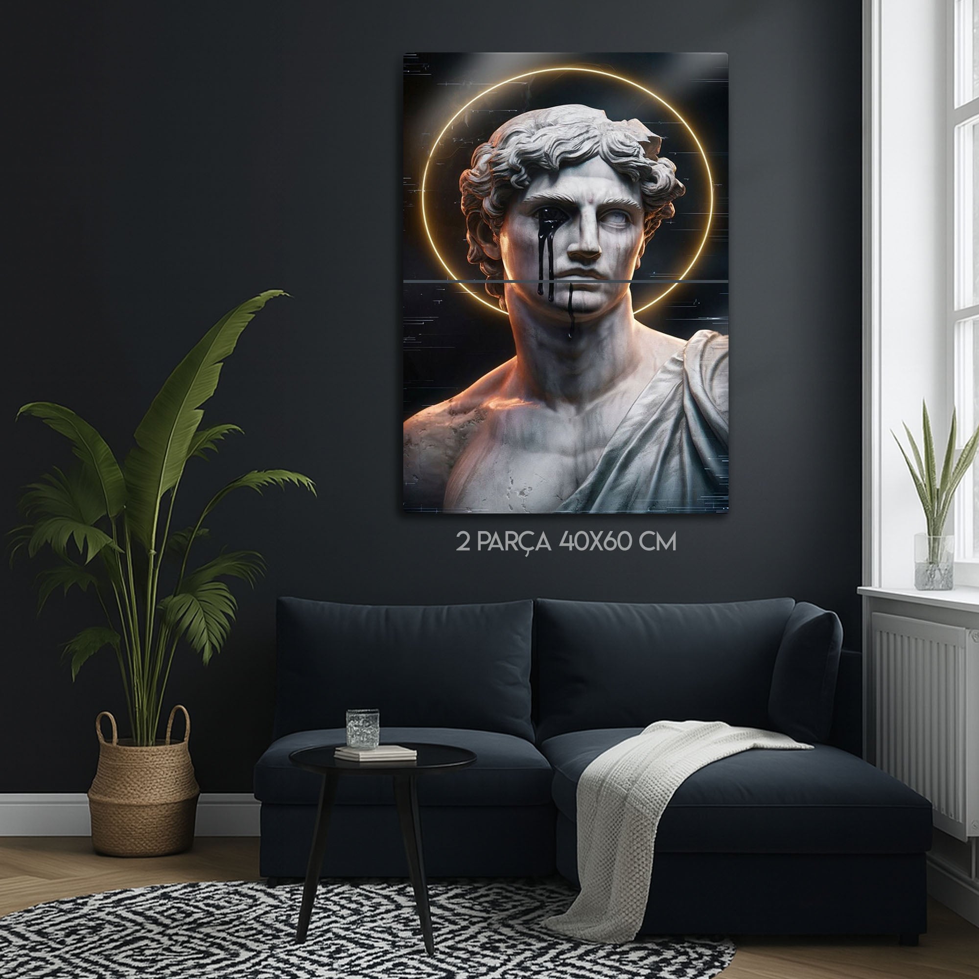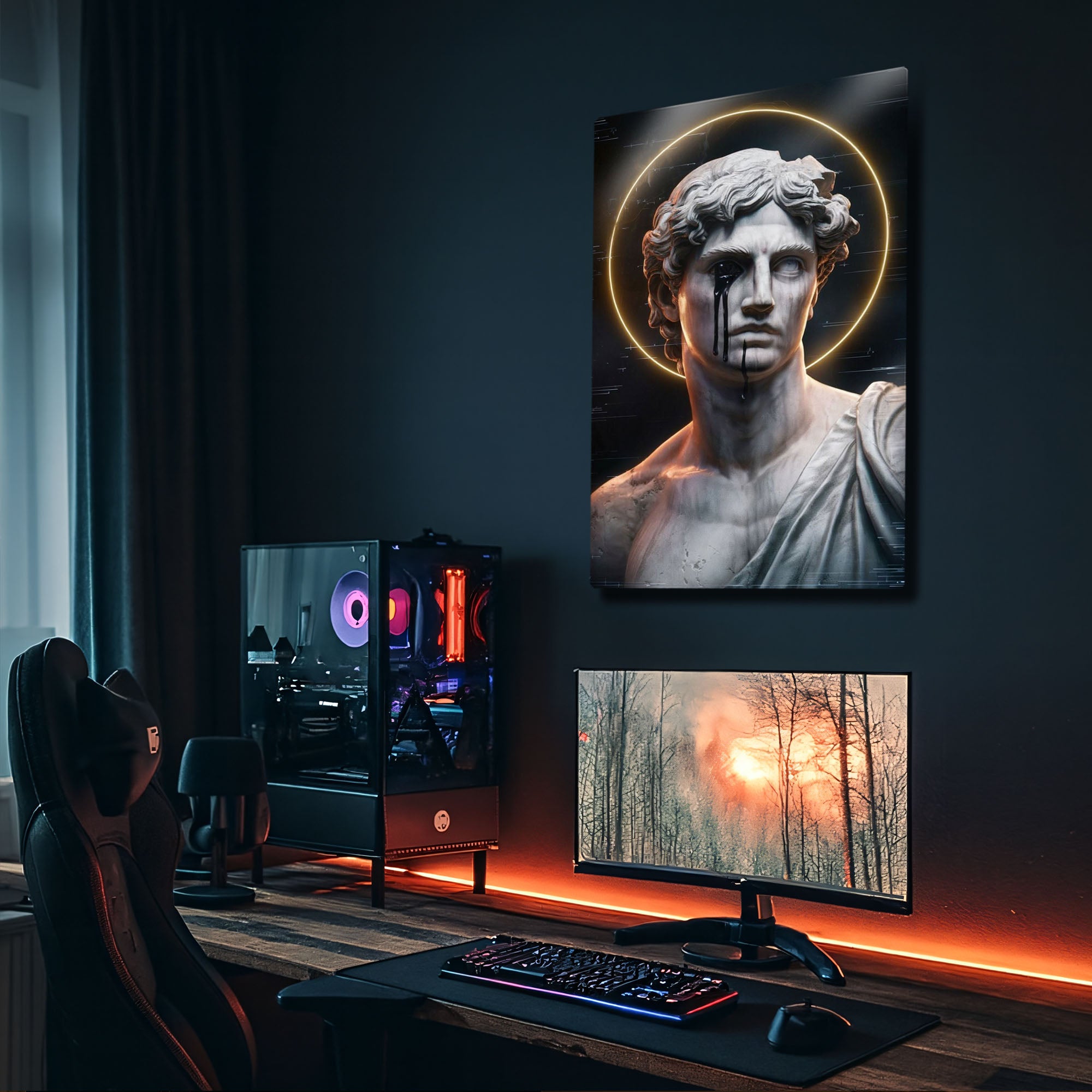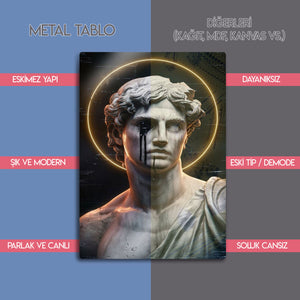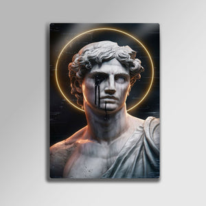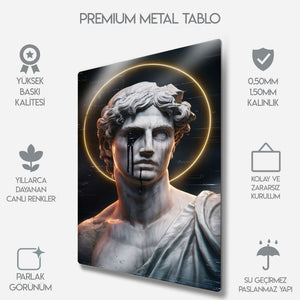 Klasik güzelliğin ve ilahi saflığın, modern dünyanın karanlığıyla lekelendiği o an... Bu olağanüstü ve düşündürücü metal tablo, antik bir Yunan tanrısı (Apollon gibi) büstünü, gözünden akan siyah gözyaşları ve başının etrafındaki parlak neon hale ile birleştirerek, zamanlar arası bir trajedi ve sorgulama yaratıyor.