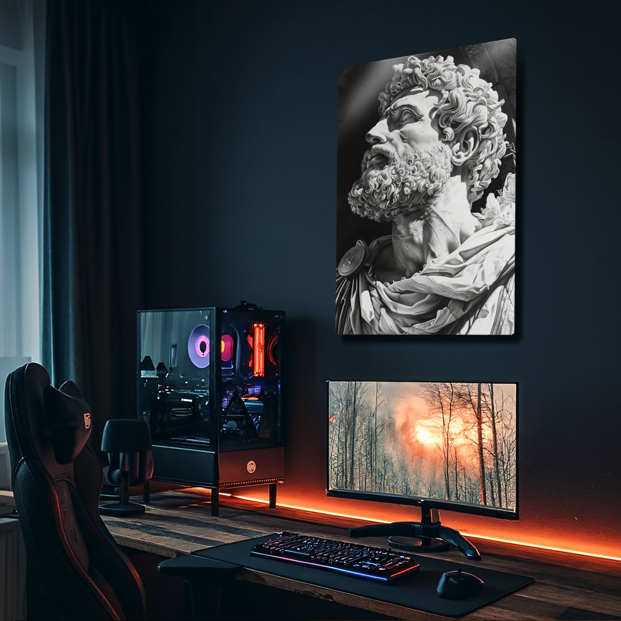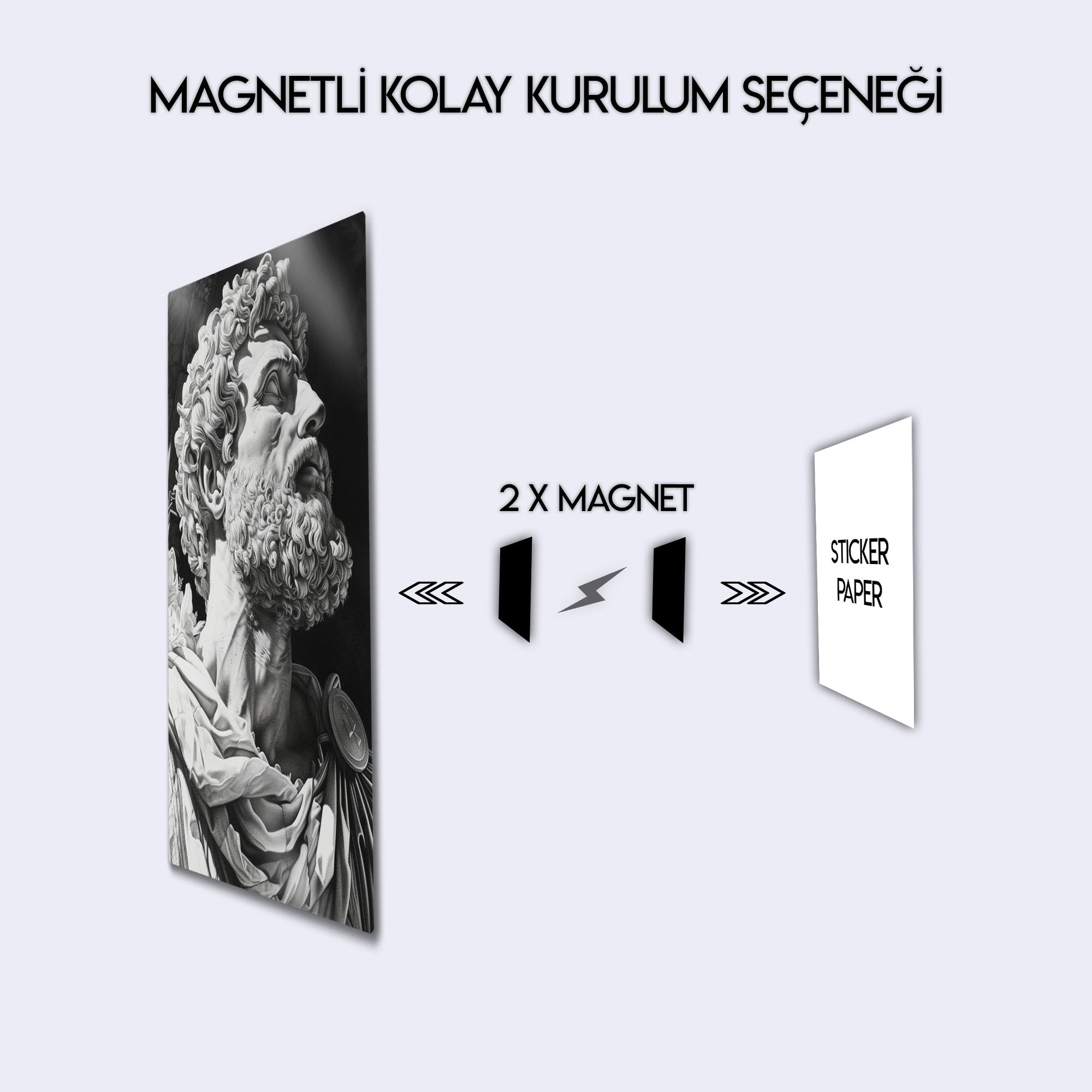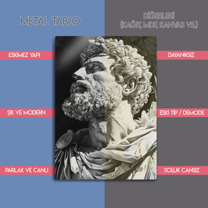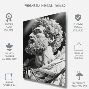 'Ruhunun rengi, düşüncelerinin rengidir.'' Tarihin en büyük Stoacı filozoflarından ve Roma'nın "Beş İyi İmparator"undan sonuncusu olan Marcus Aurelius'un o bilge ve düşünceli ruhunu duvarlarınıza taşıyın. Bu olağanüstü metal tablo, imparatorun ikonik büstünü, inanılmaz bir detay zenginliği sunan karakalem ve gravür estetiğiyle yeniden canlandırıyor.