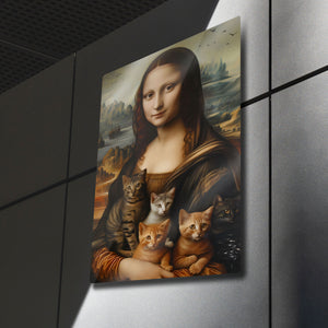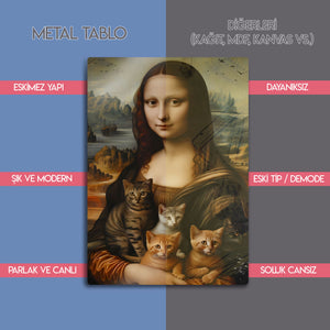 Sanat tarihinin en gizemli gülümsemesi, şimdi patili dostlarımızın sıcaklığıyla buluşuyor! Bu olağanüstü metal tablo, Leonardo da Vinci'nin ölümsüz başyapıtı Mona Lisa'yı, kucağında sevimli kedilerle birlikte, esprili ve modern bir yorumla yeniden canlandırıyor.