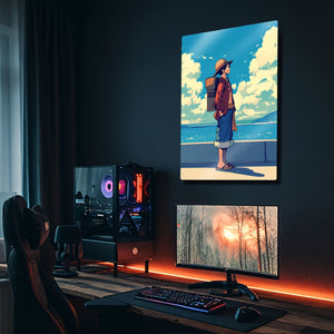 Korsanlar Kralı'nın o bitmek bilmeyen enerjisini ve maceracı ruhunu duvarlarınıza taşıyın! Bu eşsiz metal tablo, One Piece'in efsanevi kahramanı Monkey D. Luffy'yi, modern bir kapüşonlu ve ikonik hasır şapkasıyla, canlı ve retro esintili bir gün batımı manzarasının önünde tasvir ediyor.