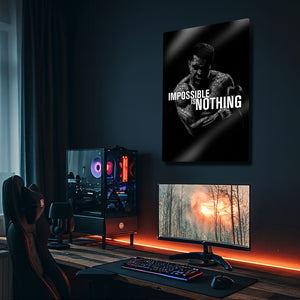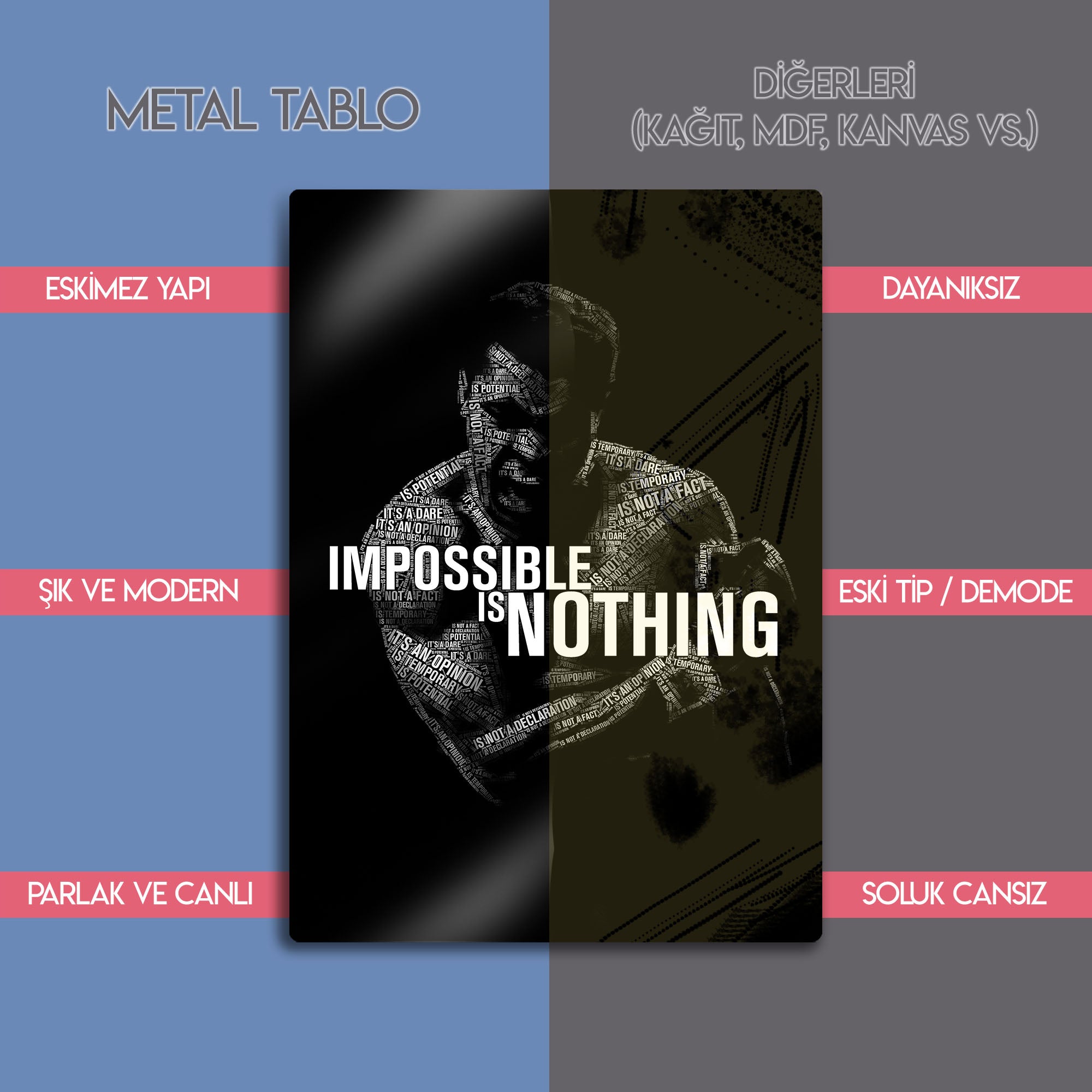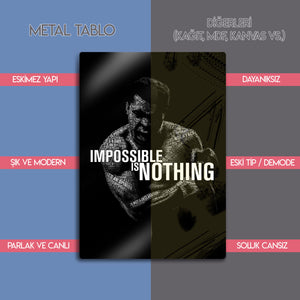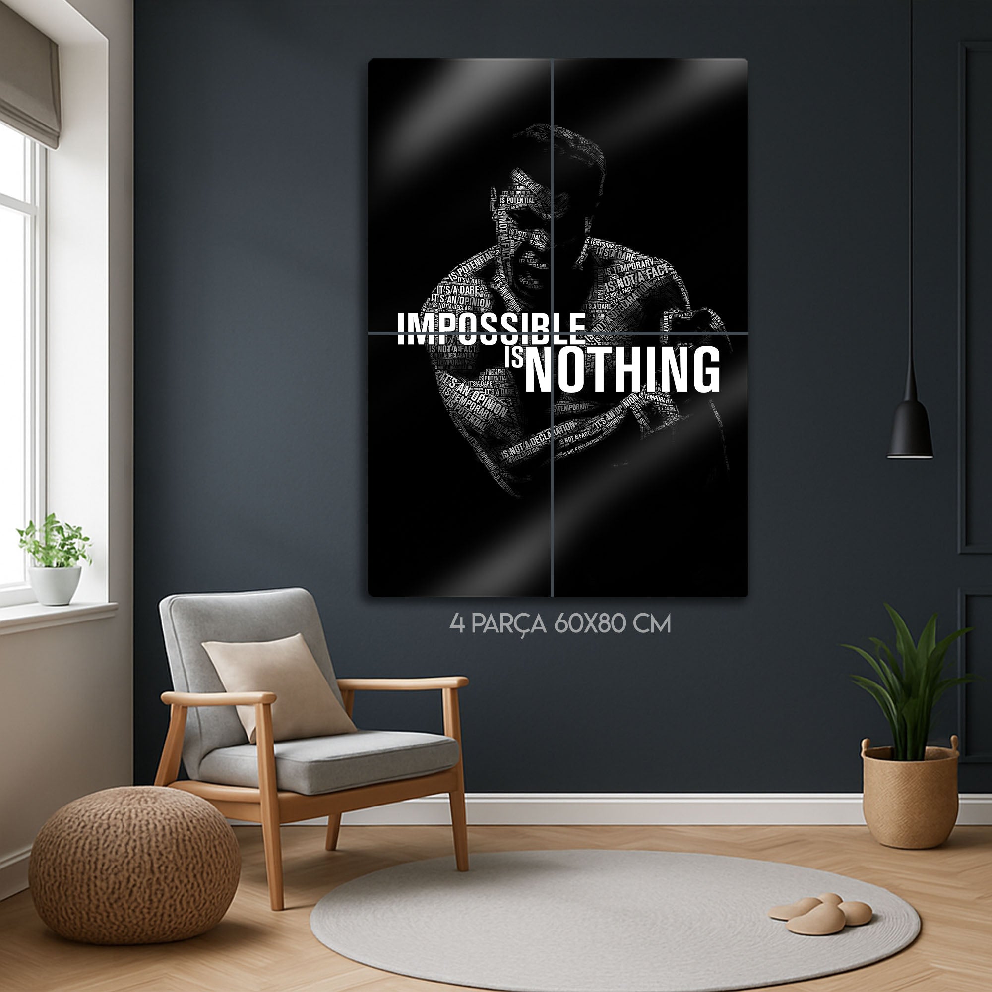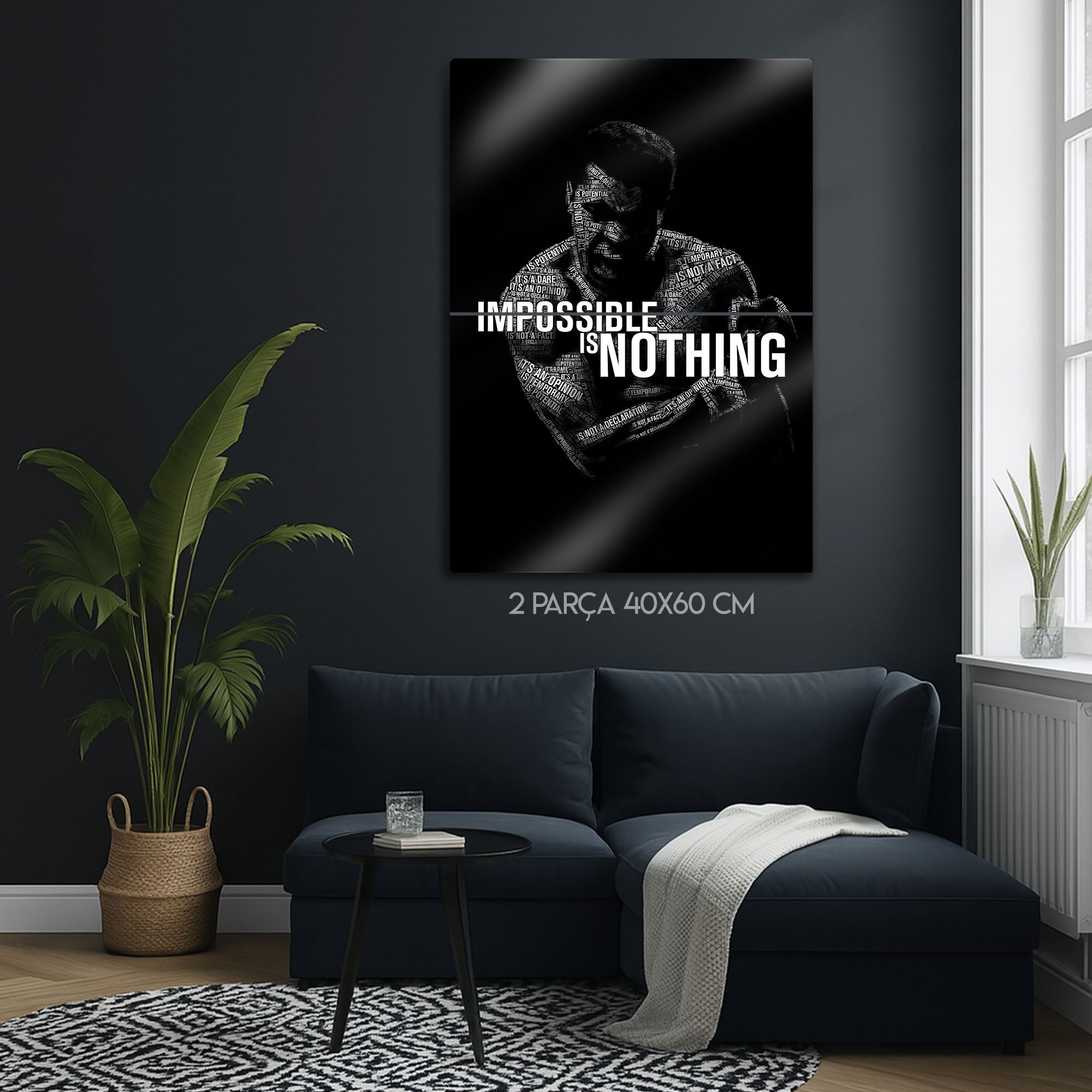 ''Impossible is Nothing'' (İmkansız Diye Bir Şey Yoktur). Tüm zamanların en büyük sporcusu, efsanevi boksör Muhammed Ali'nin sarsılmaz inancını ve ilham veren ruhunu duvarlarınıza taşıyın. Bu olağanüstü metal tablo, Ali'nin ikonik silüetini, onun en güçlü ve en motive edici sözleriyle dokuyarak, eşsiz bir tipografik portre oluşturuyor.