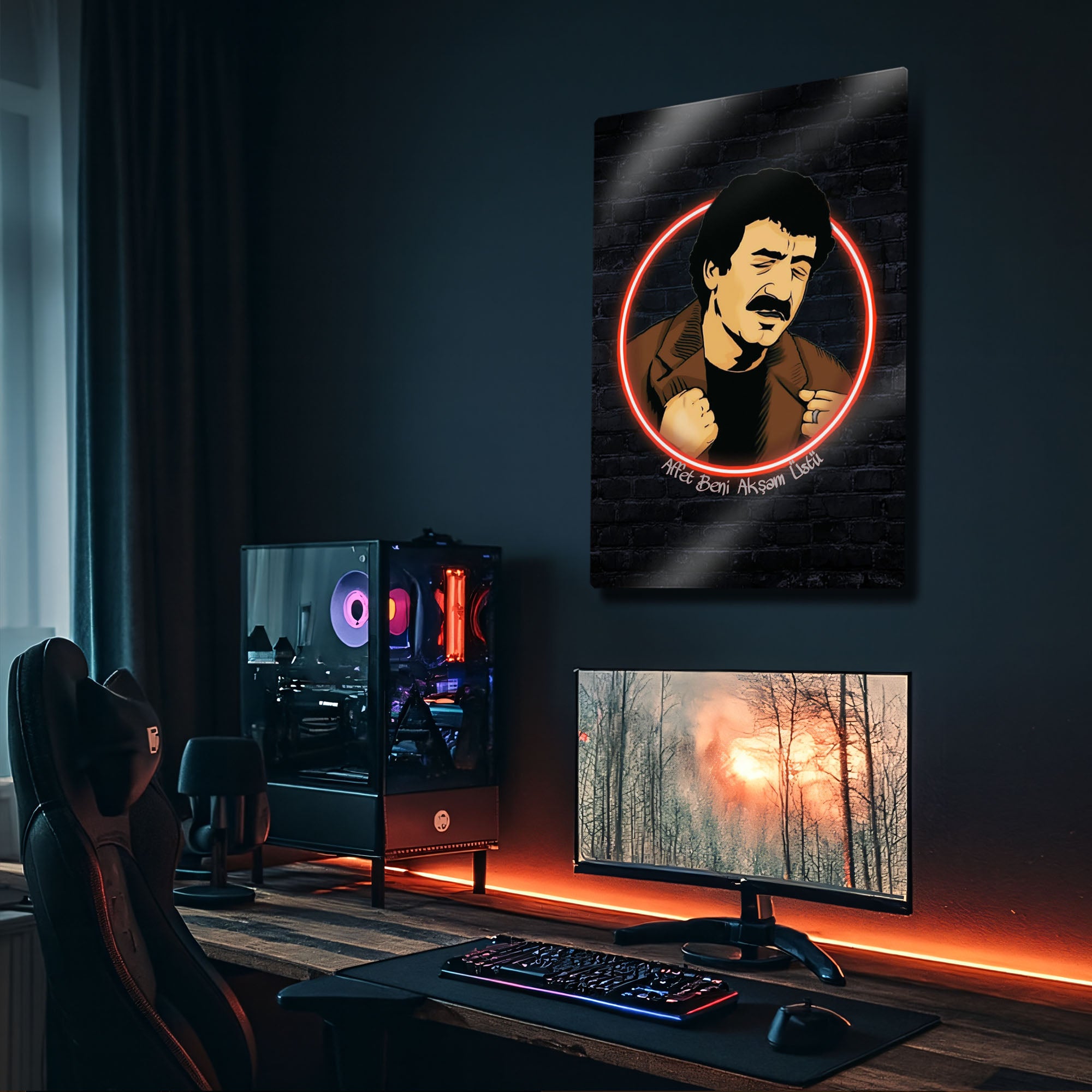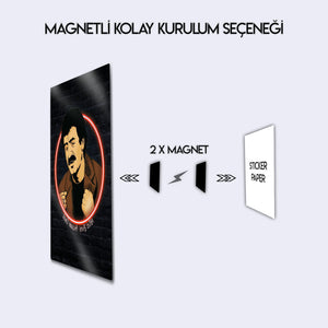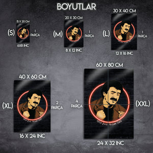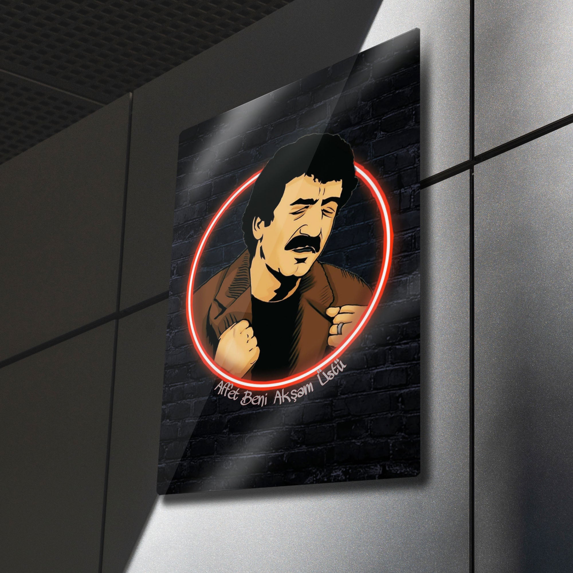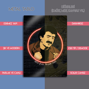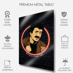 'Affet beni akşam üstü, gölgen uzarken...'' Arabesk müziğin Babası, milyonların kalbinde taht kuran Müslüm Gürses'in o derin ve duygu dolu anlarını duvarlarınıza taşıyın. Bu özel tasarım metal tablo, Müslüm Baba'nın ikonik portresini, modern bir illüstrasyon ve ruhuna işleyen şarkılarına gönderme yapan kırmızı bir neon halka ile birleştiriyor.