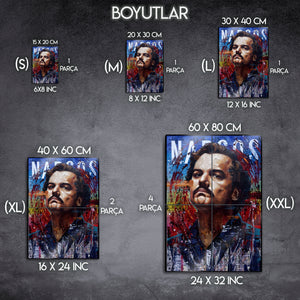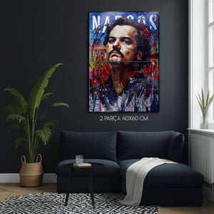 ''Plata o Plomo?'' Televizyon tarihinin en unutulmaz anti-kahramanlarından Pablo Escobar'ın karizmasını, gücünü ve trajedisini duvarlarınıza taşıyın. Bu olağanüstü metal tablo, "Narcos" dizisinde Wagner Moura'nın hayat verdiği ikonik karakteri, dinamik bir sokak sanatı (street art) ve yağlı boya estetiğiyle birleştiren enerjik bir portreyle ölümsüzleştiriyor.