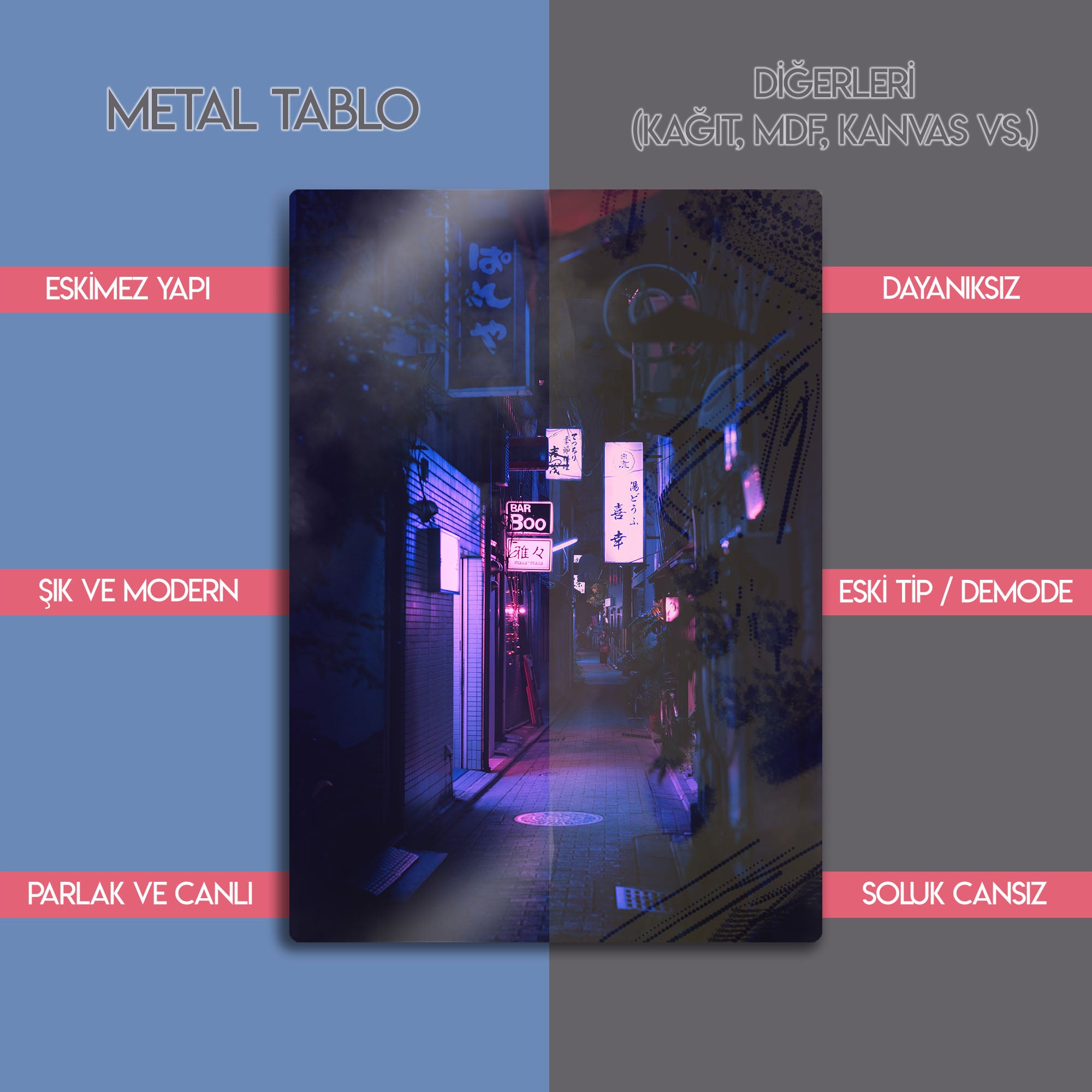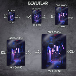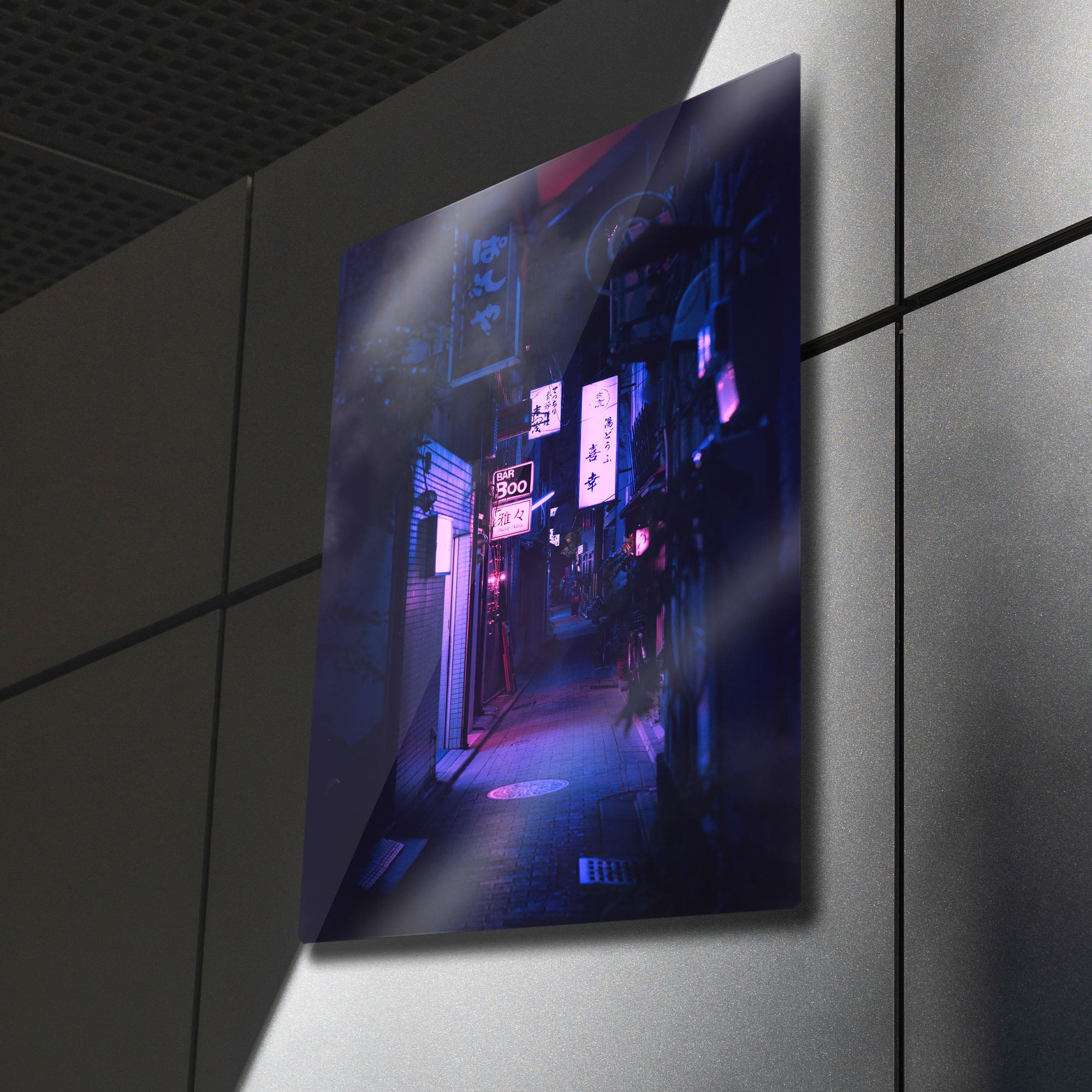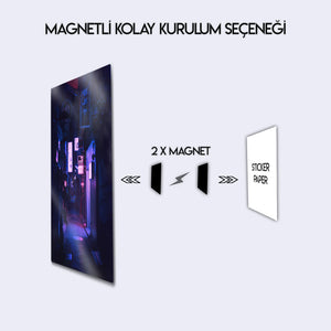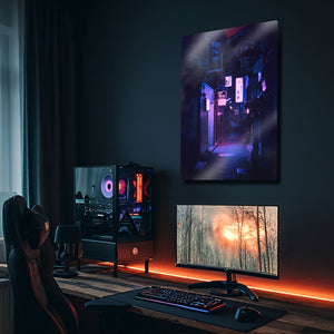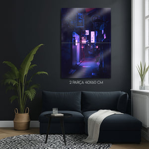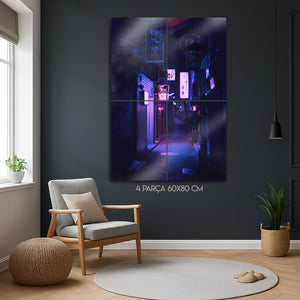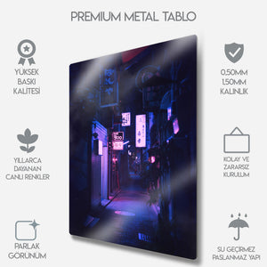 Tokyo'nun hipnotize edici ve gizemli ara sokaklarında kaybolun. Bu olağanüstü metal tablo, bir Japon metropolünün kalbindeki dar bir sokağın gece manzarasını, neon tabelaların ve fenerlerin yarattığı mor ve mavi tonlardaki büyüleyici aydınlatmasıyla, sinematik bir güzellikte yakalıyor.
