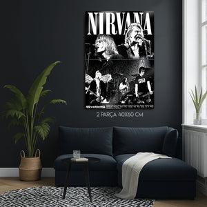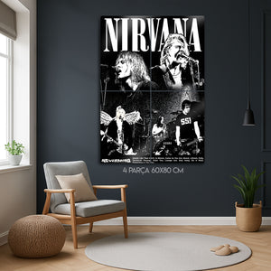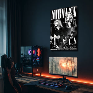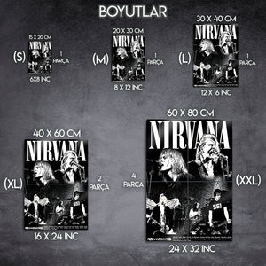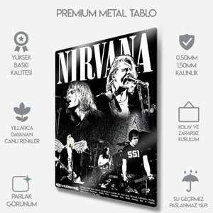 Bir neslin sesi, grunge müziğin ölümsüz efsanesi Nirvana'nın o ham ve isyankar ruhunu duvarlarınıza taşıyın! Bu özel tasarım metal tablo, grubun en enerjik konser anlarını ve ikonik portrelerini, yüksek kontrastlı siyah beyaz bir kolajla bir araya getiriyor. Kurt Cobain'in sahnedeki o unutulmaz anları, bu eserde tüm gücüyle yeniden hayat buluyor.
