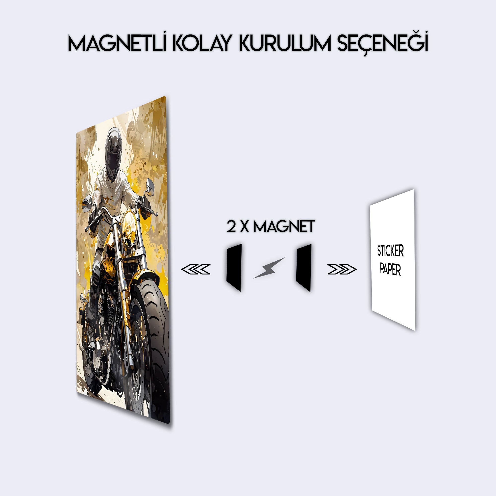 Bu eser, sadece bir motosiklet resmi değil, aynı zamanda bağımsızlığın, gücün ve yol tutkusunun bir manifestosudur. Metalin modern dokusu, bu sanatsal tasarımın her bir fırça darbesini ve canlı rengini mükemmel bir şekilde öne çıkarır. Garajınız, "man cave"iniz, ofisiniz veya modern yaşam alanlarınıza anında bir karakter, dinamizm ve macera ruhu katacaktır.