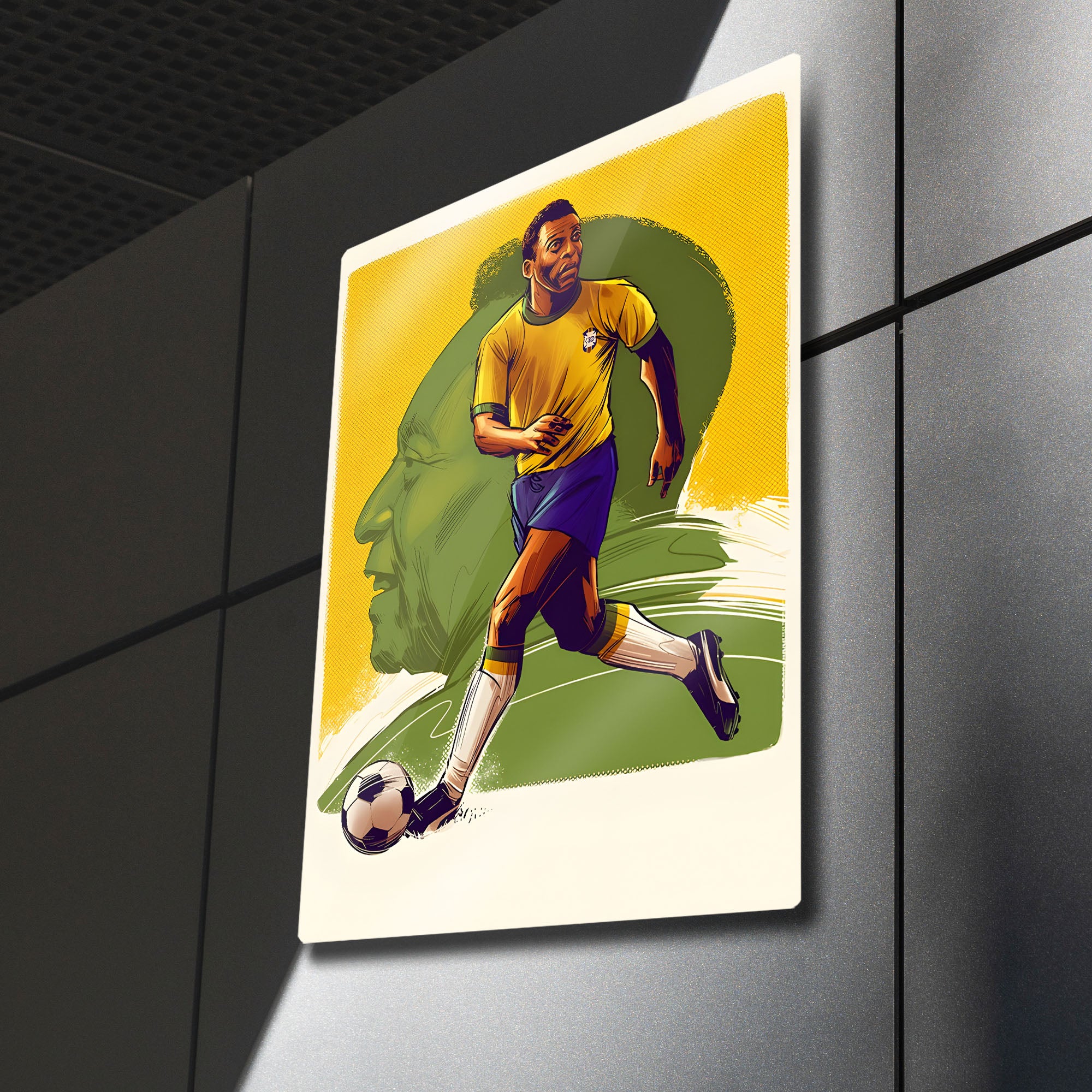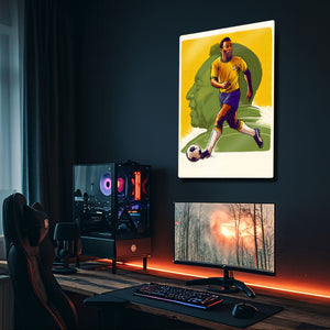 Futbolun Kralı "O Rei" Pelé'nin ölümsüz mirasını ve sahadaki o eşsiz zarafetini duvarlarınıza taşıyın! Bu özel tasarım metal tablo, tüm zamanların en büyük futbolcularından Pelé'yi, ikonik Brezilya Milli Takımı formasıyla, vintage bir çizgi roman ve illüstrasyon estetiğiyle yeniden canlandırıyor.