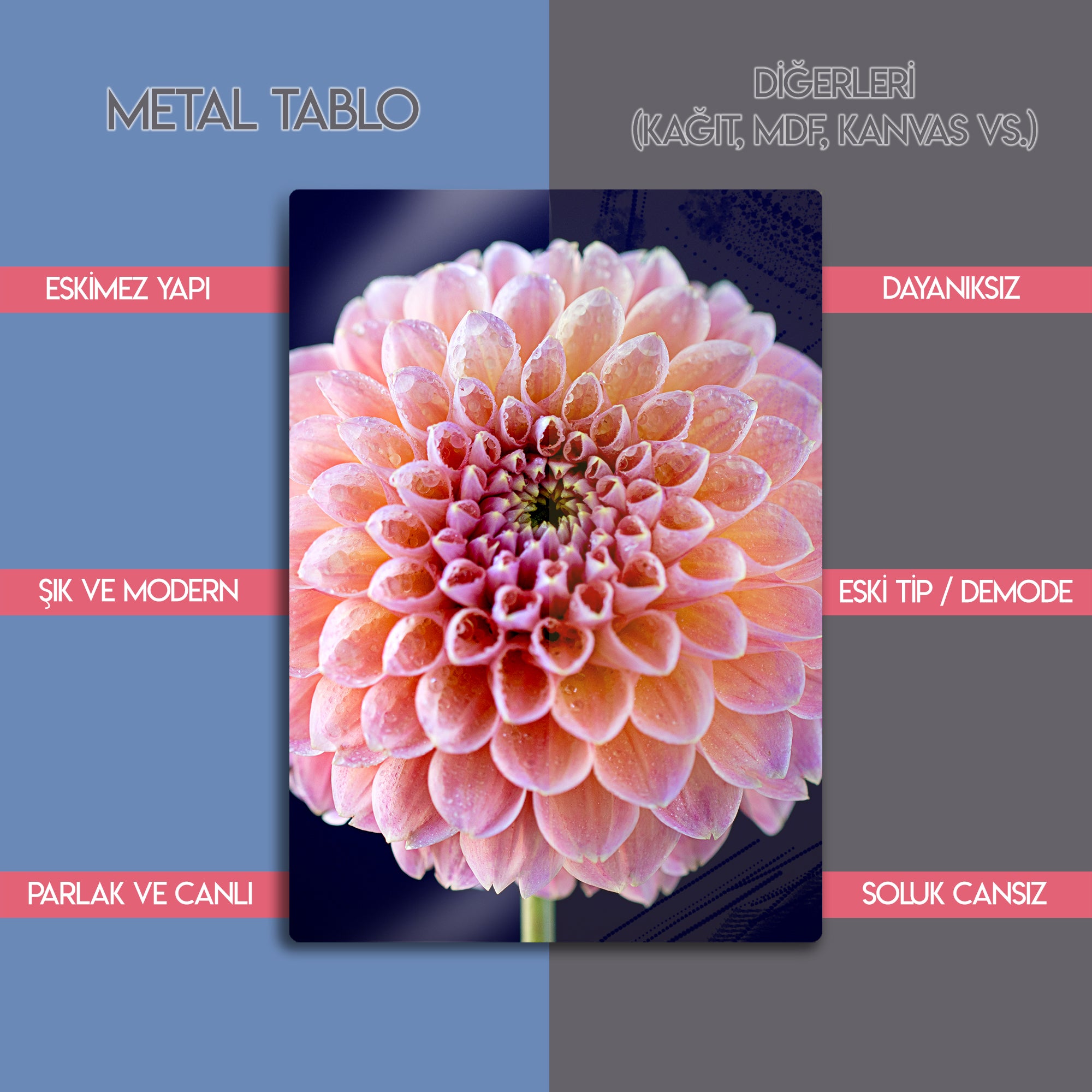 Evinize doğanın zarafetini taşıyın! Pembe çiçek desenli bu metal tablo, modern ve estetik tasarımıyla duvarlarınıza canlılık katıyor. Yüksek kaliteli baskısı ve parlak yüzeyi sayesinde uzun yıllar ilk günkü güzelliğini korur. Oturma odası, yatak odası, ofis ve hediye seçenekleri için ideal dekoratif bir üründür.