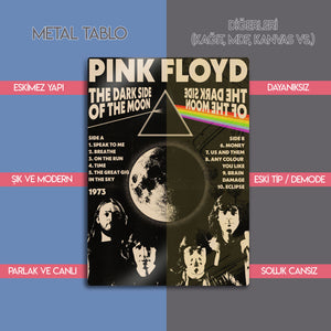Bu özel Pink Floyd metal tablo, efsanevi The Dark Side of the Moon (1973) albüm kapağını modern bir duvar dekoruna dönüştürüyor. Rock tarihinin en ikonik albümlerinden birine ait olan bu tasarım, retro atmosferiyle hem müzik severler hem de koleksiyoncular için vazgeçilmez bir parçadır.