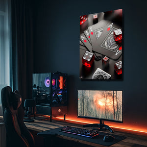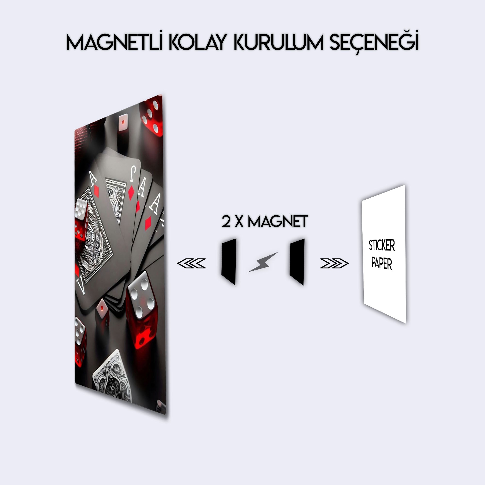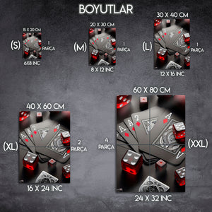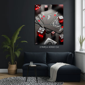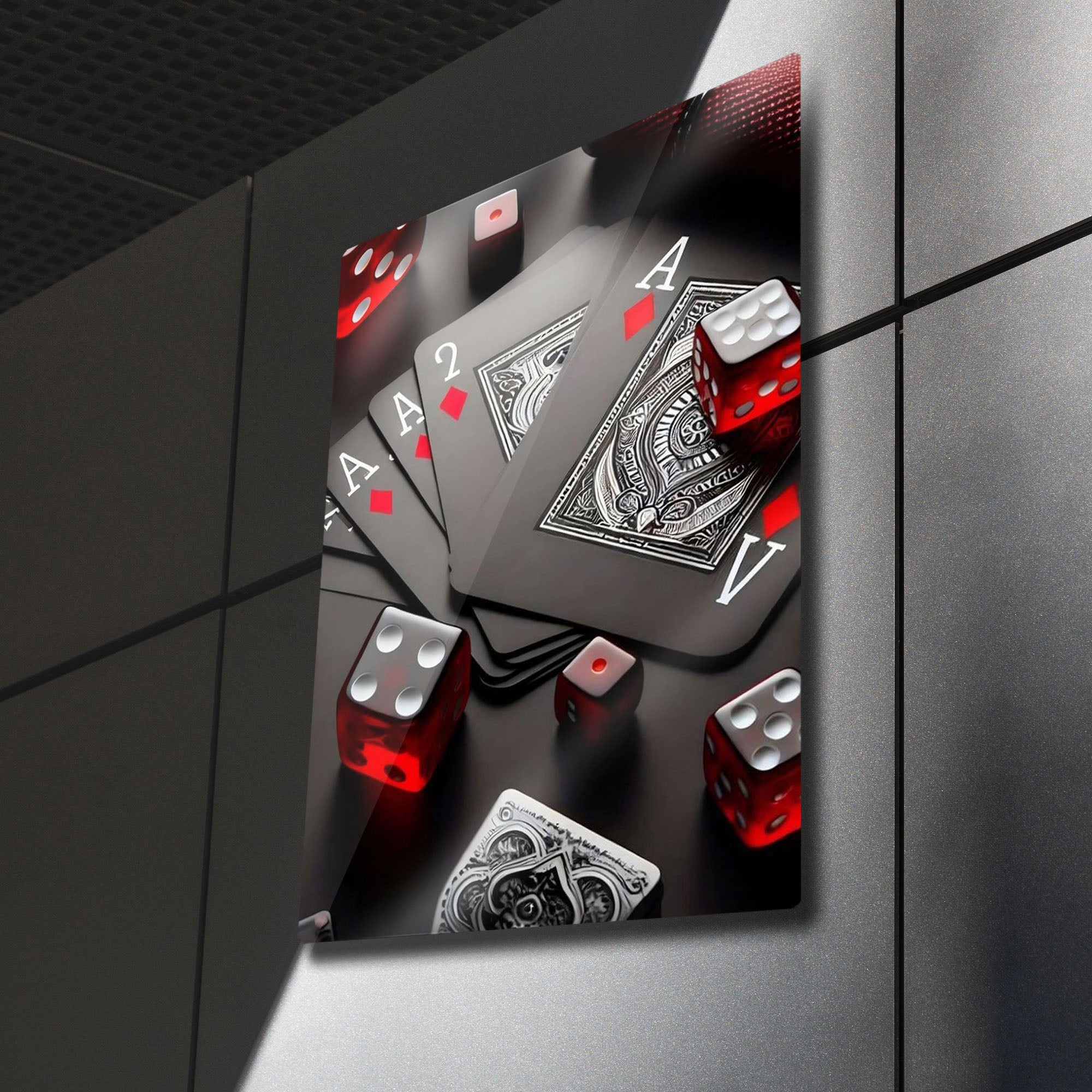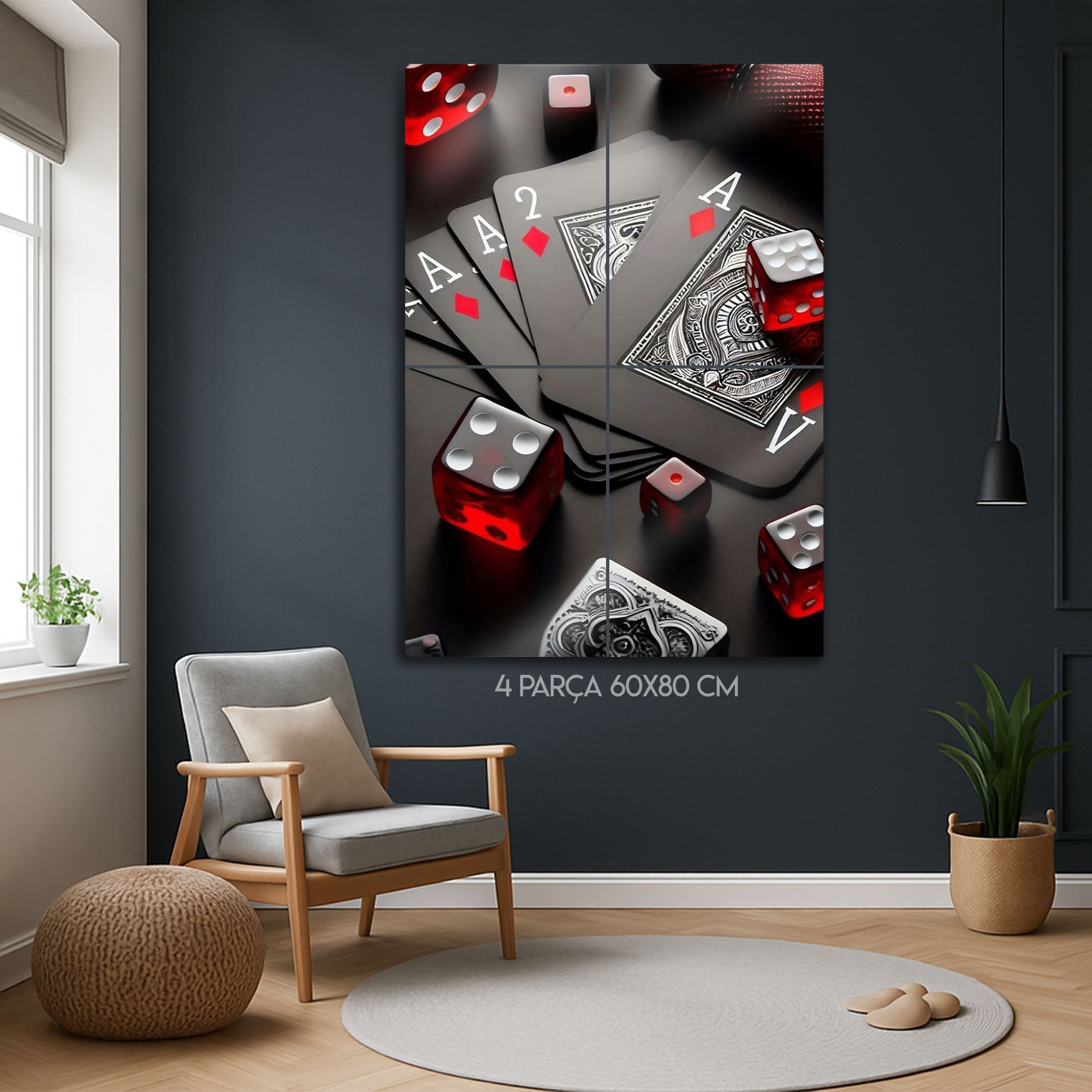 Şans, strateji ve stil... Bu modern ve karizmatik metal tablo, poker ve zar oyunlarının heyecan verici dünyasını sofistike bir estetikle duvarlarınıza taşıyor. Siyahın asaleti üzerine işlenmiş özel tasarım oyun kartları ve içten aydınlatılmış gibi duran yarı saydam kırmızı zarlar, bu esere hem gizemli hem de lüks bir hava katıyor.