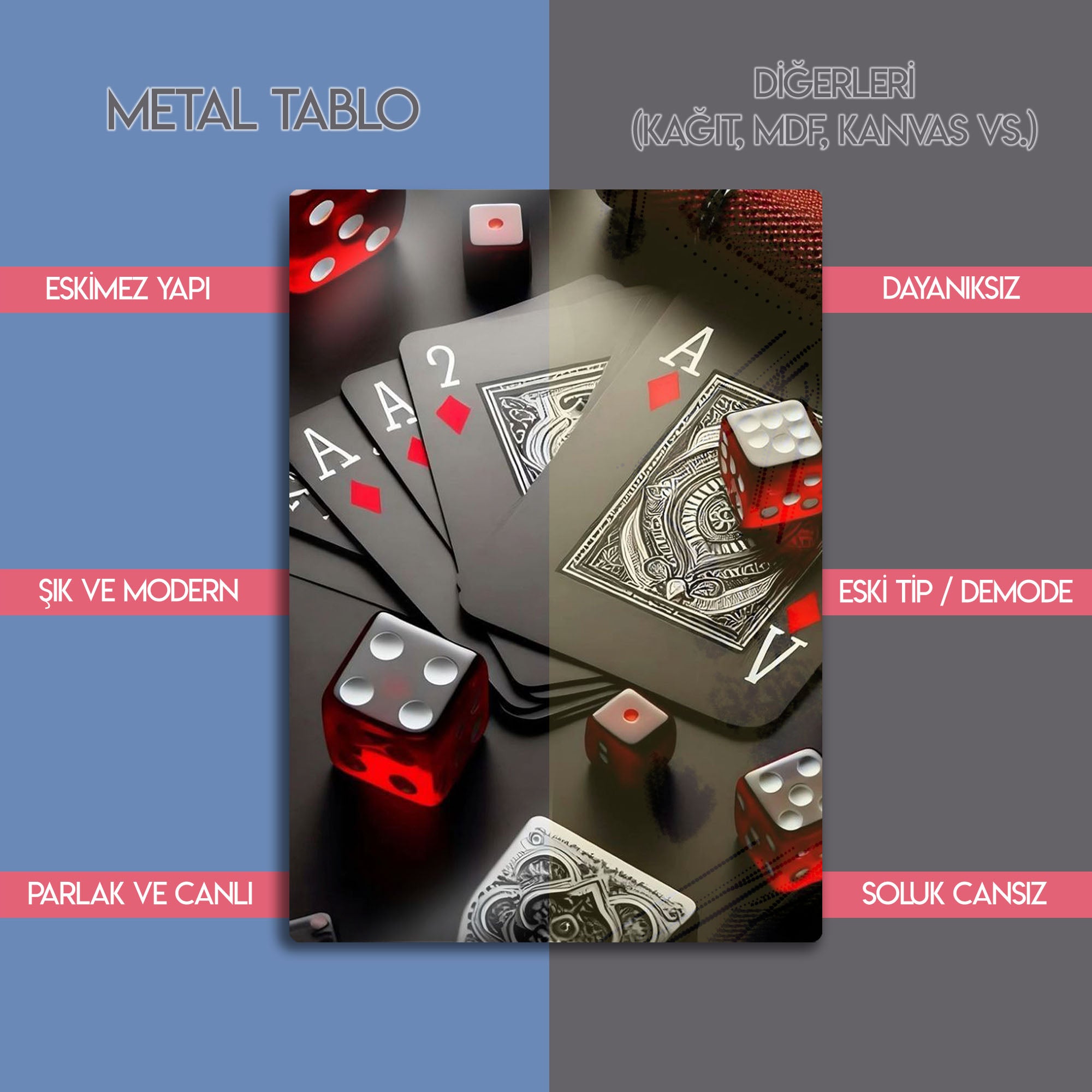 Bu tablo, oyun odaları, "man cave"ler, barlar, modern salonlar veya ofisler için mükemmel bir "statement" parçasıdır. Metalin pürüzs-üz yüzeyi, kartların detaylarını ve zarların parlaklığını öne çıkararak kompozisyona modern bir derinlik kazandırır. Bu sadece bir dekorasyon objesi değil, aynı zamanda bir tutkunun ve zekanın yansımasıdır.